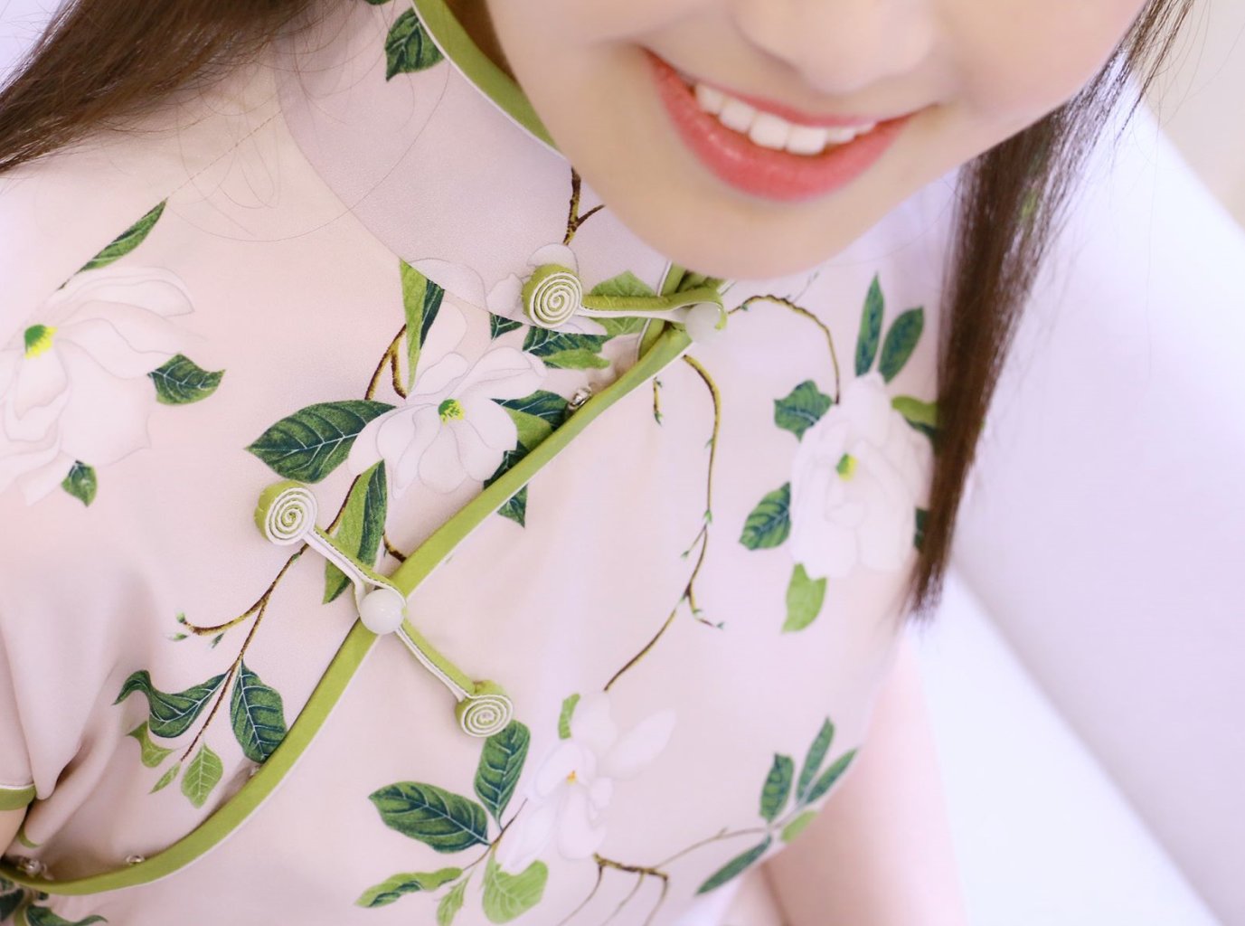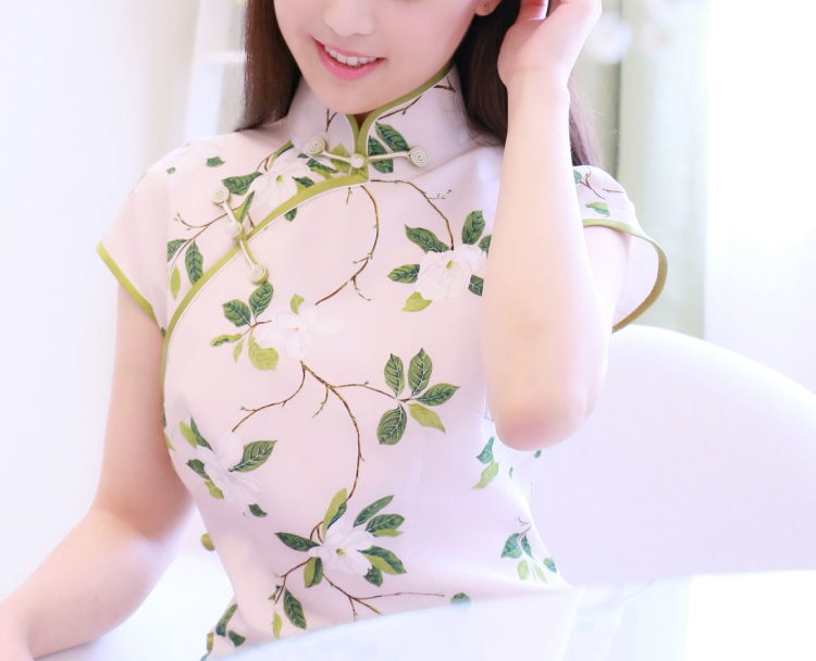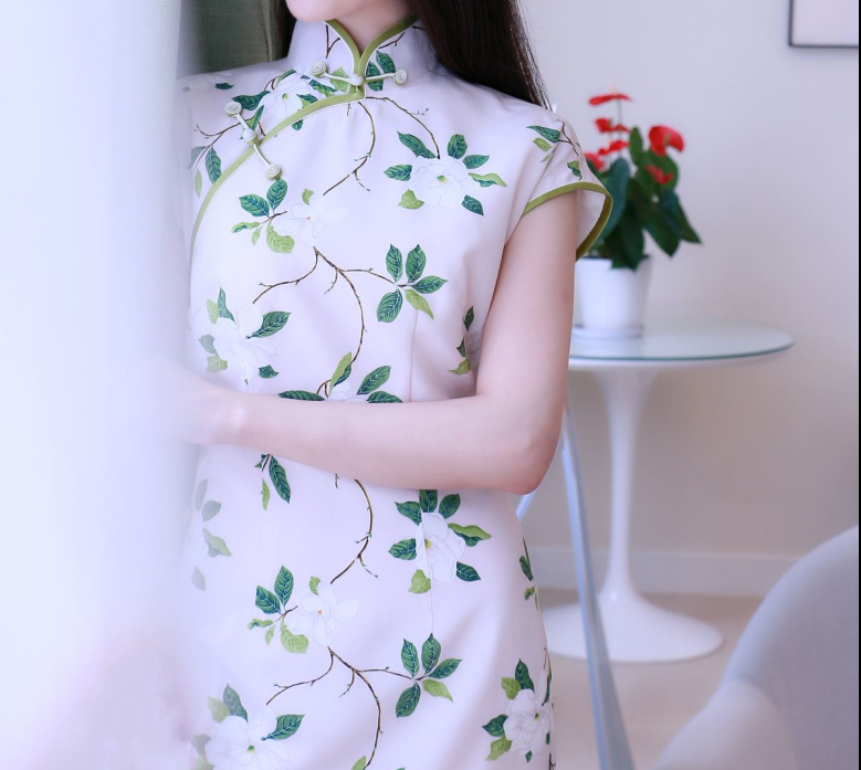 一池春水 荷言HEYAN#一池春水 栀子花印花真丝双绉面料+草绿色盘香扣手工旗袍