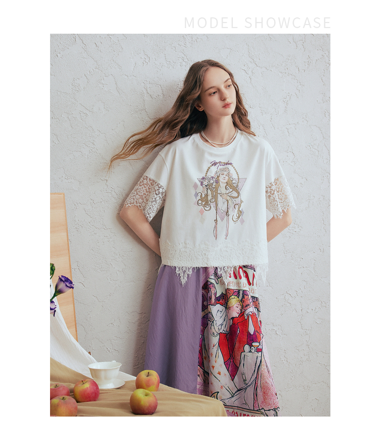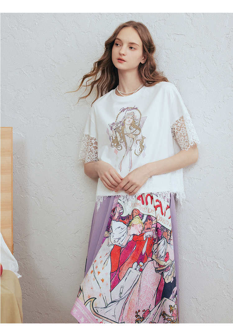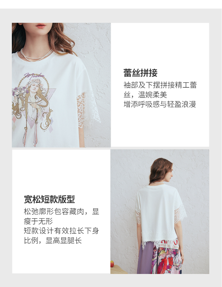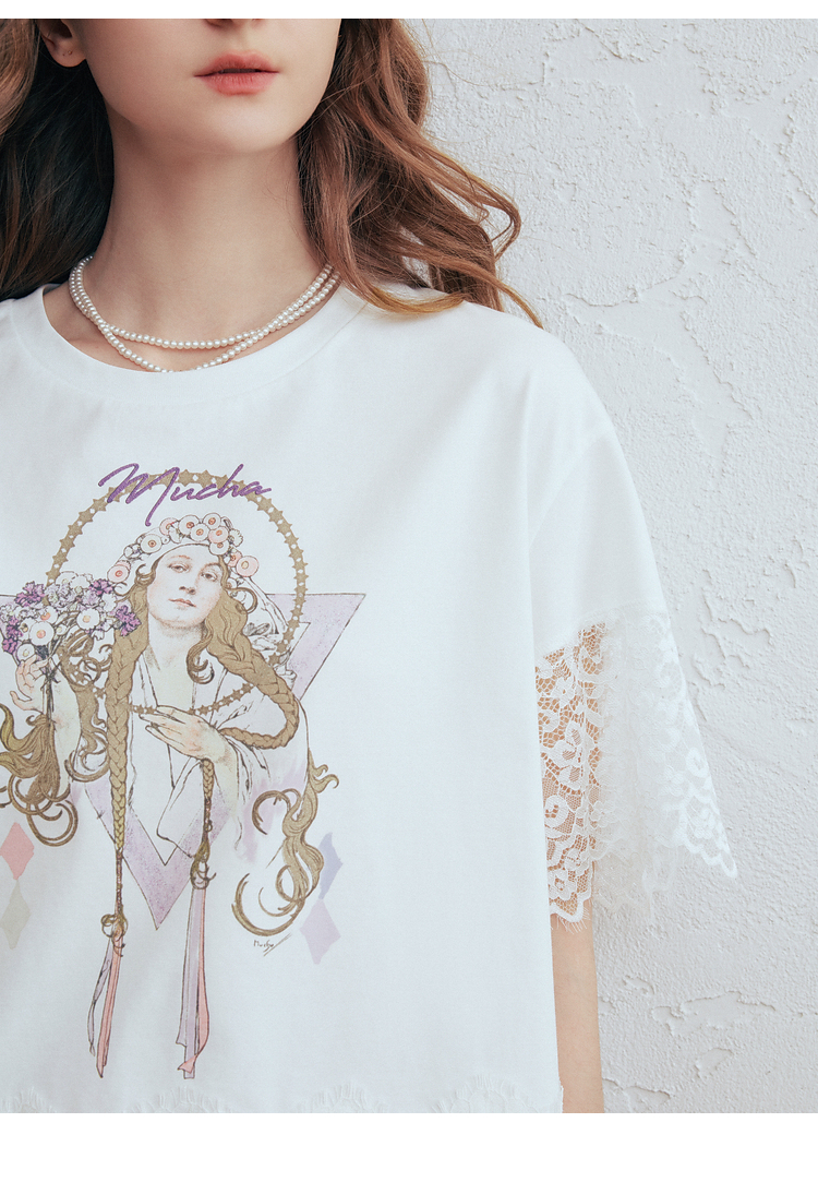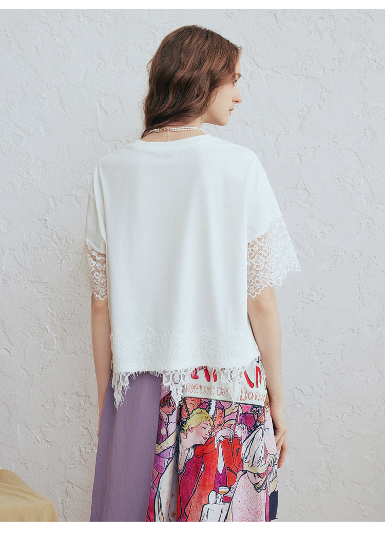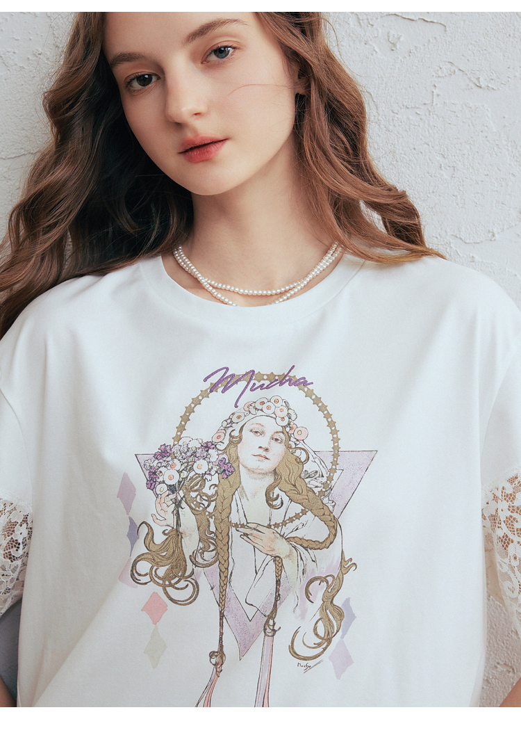 两三事 行云旅途 2026春季新款复古人物印花蕾丝拼接t恤女宽松