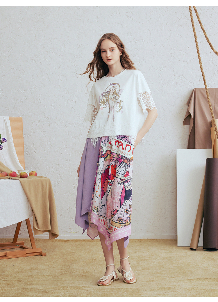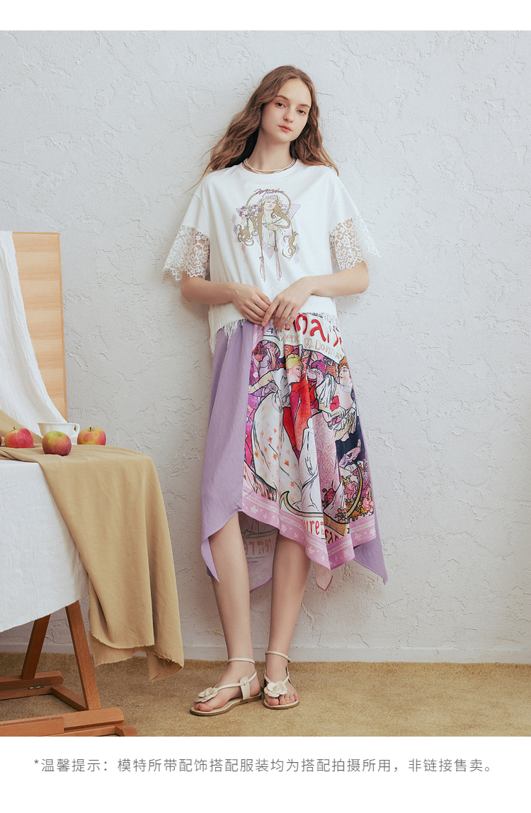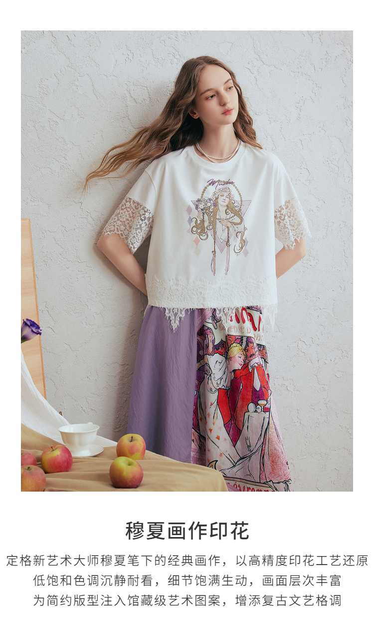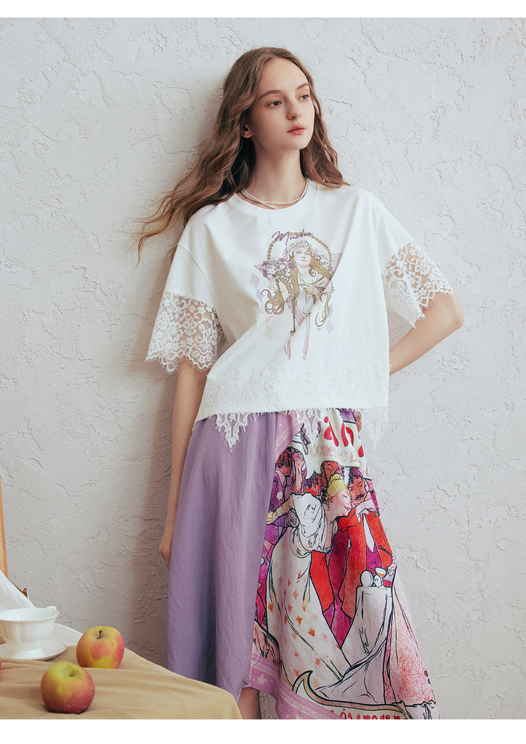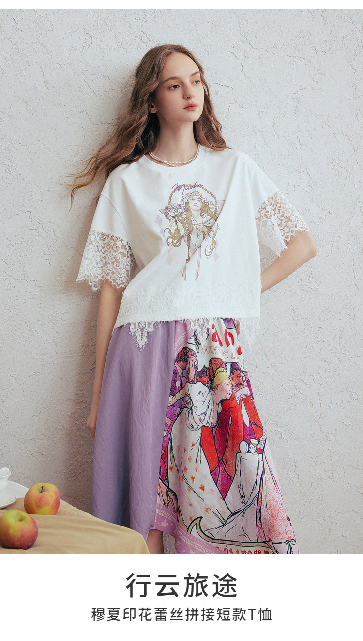 两三事 行云旅途 2026春季新款复古人物印花蕾丝拼接t恤女宽松