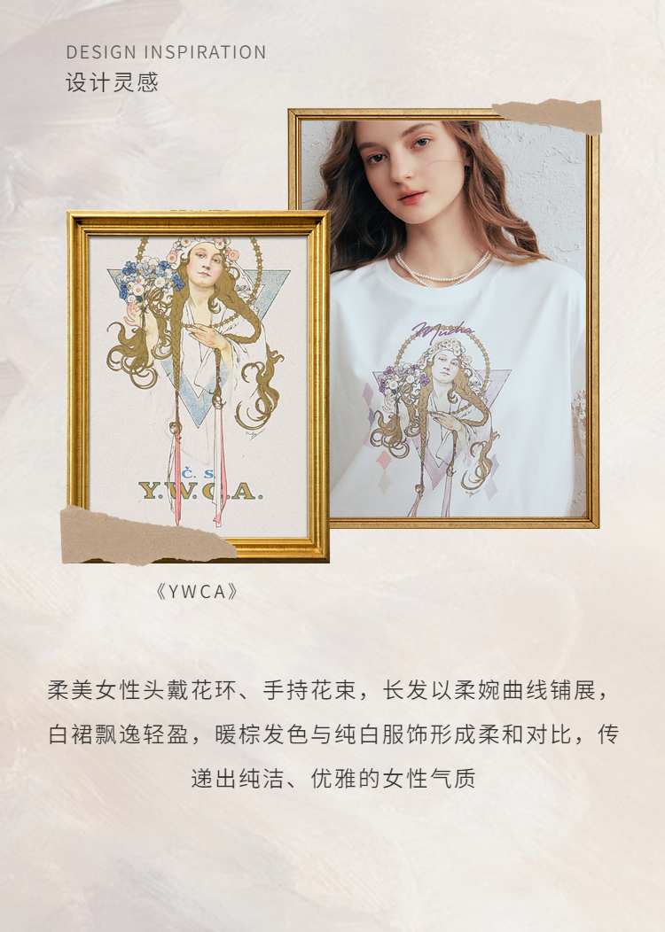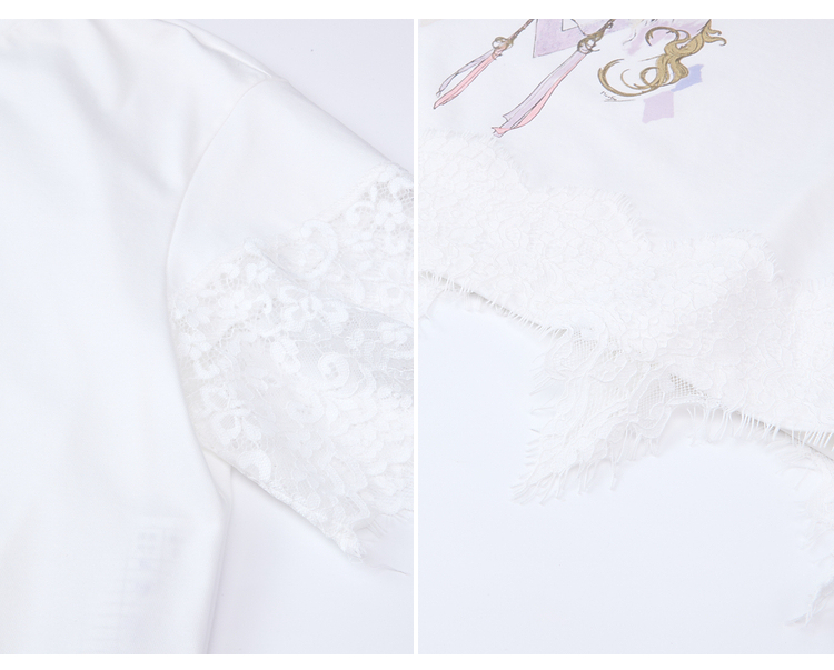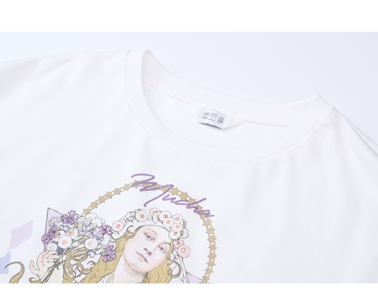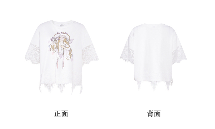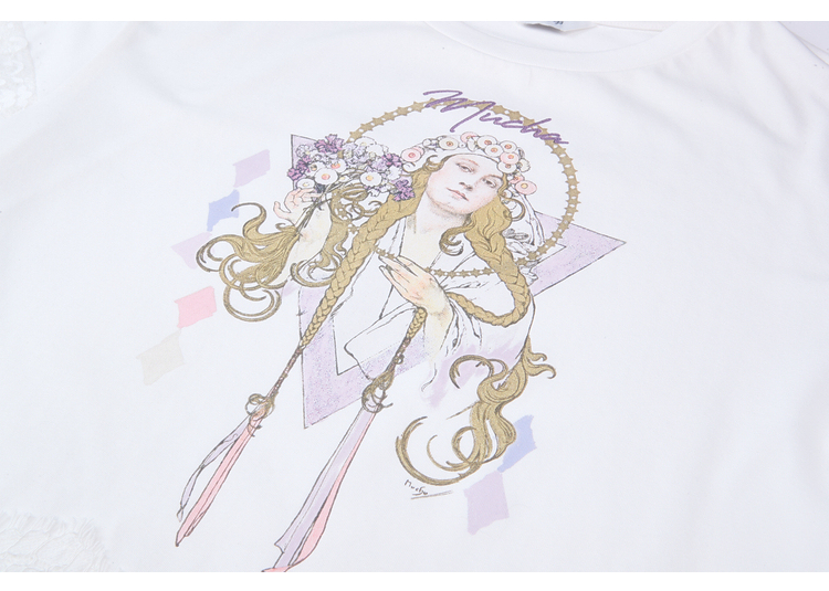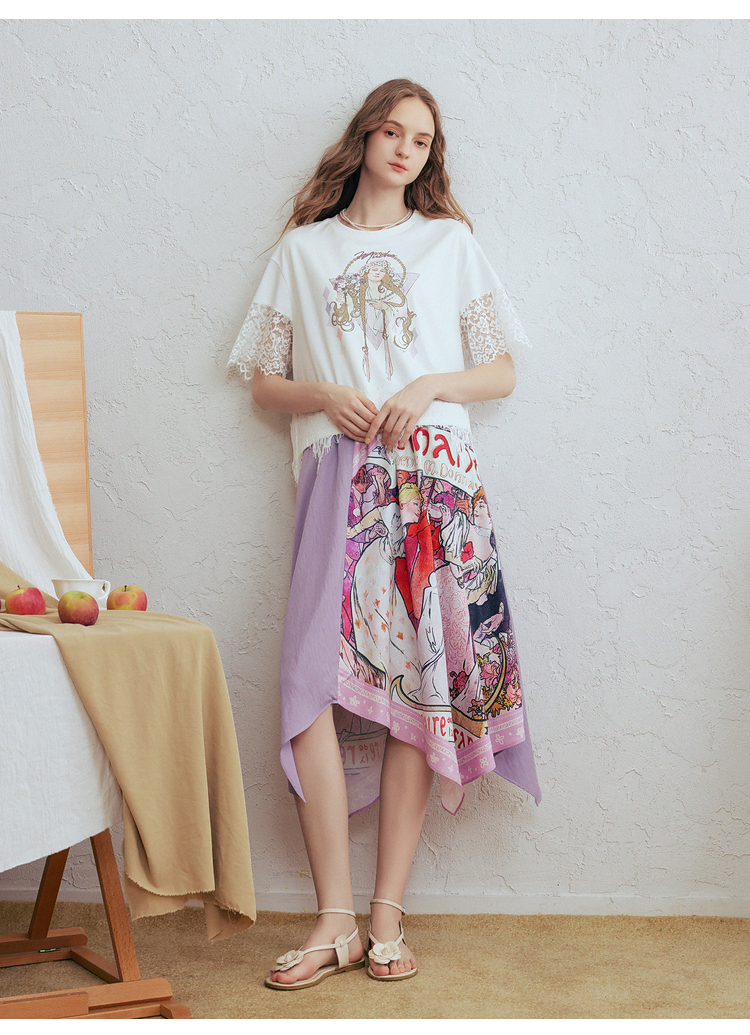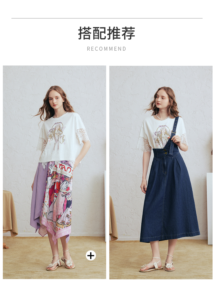 两三事 行云旅途 2026春季新款复古人物印花蕾丝拼接t恤女宽松