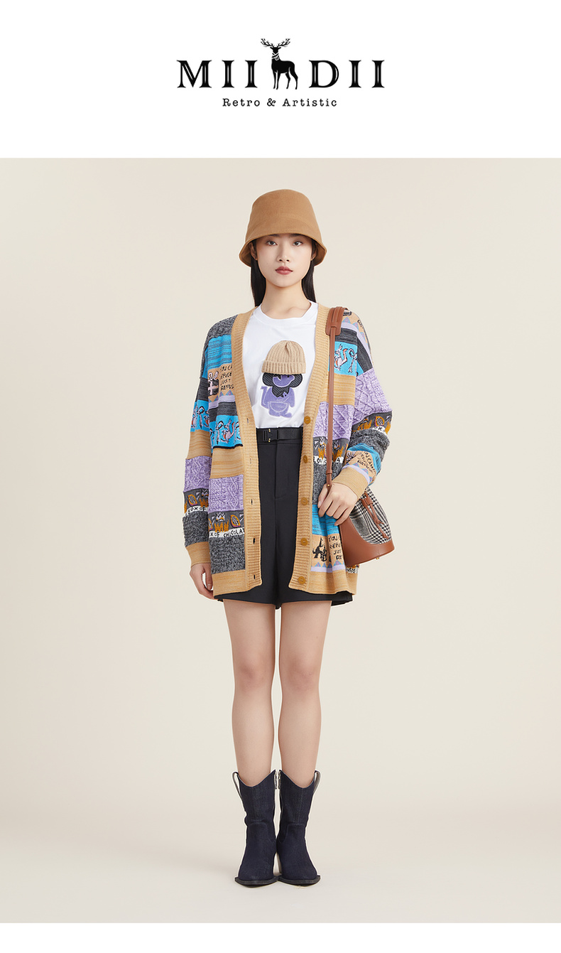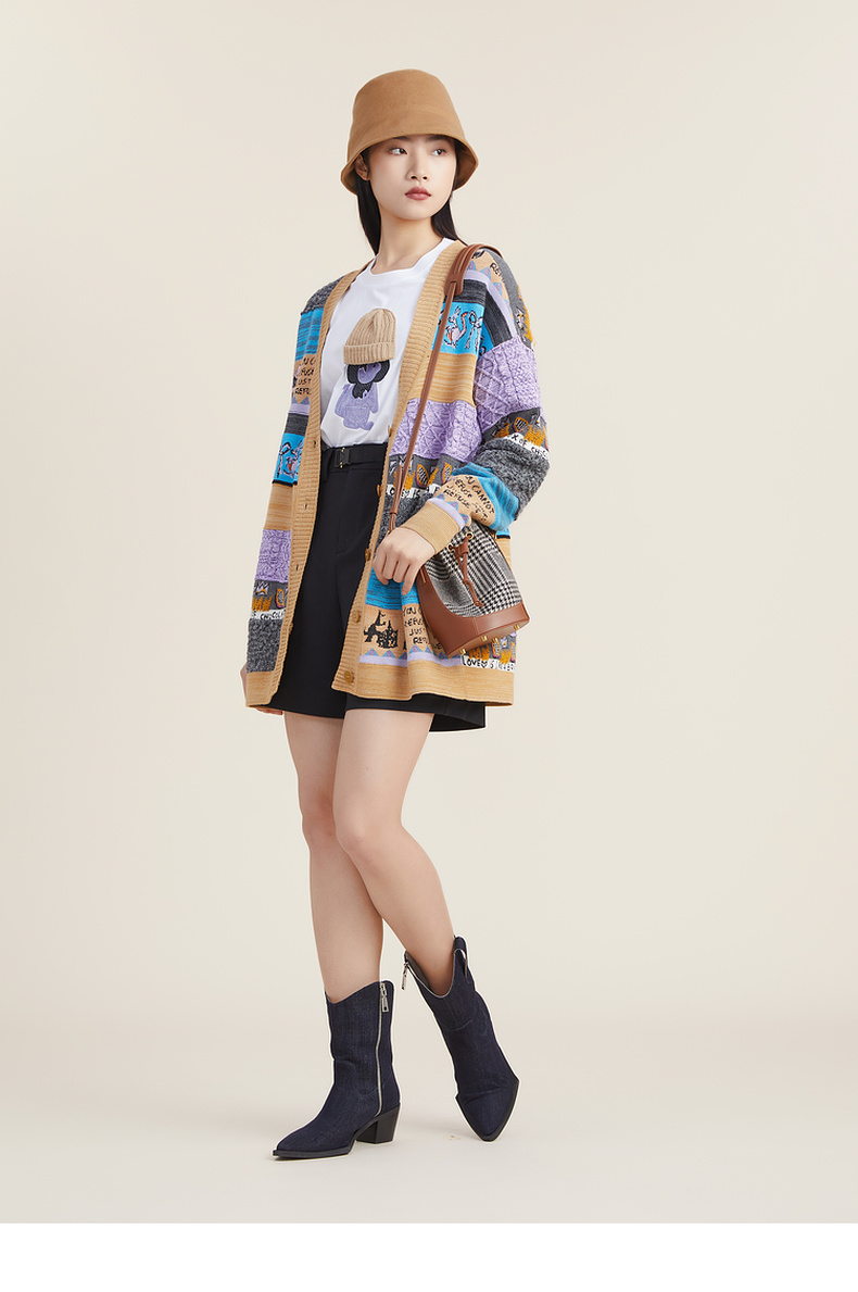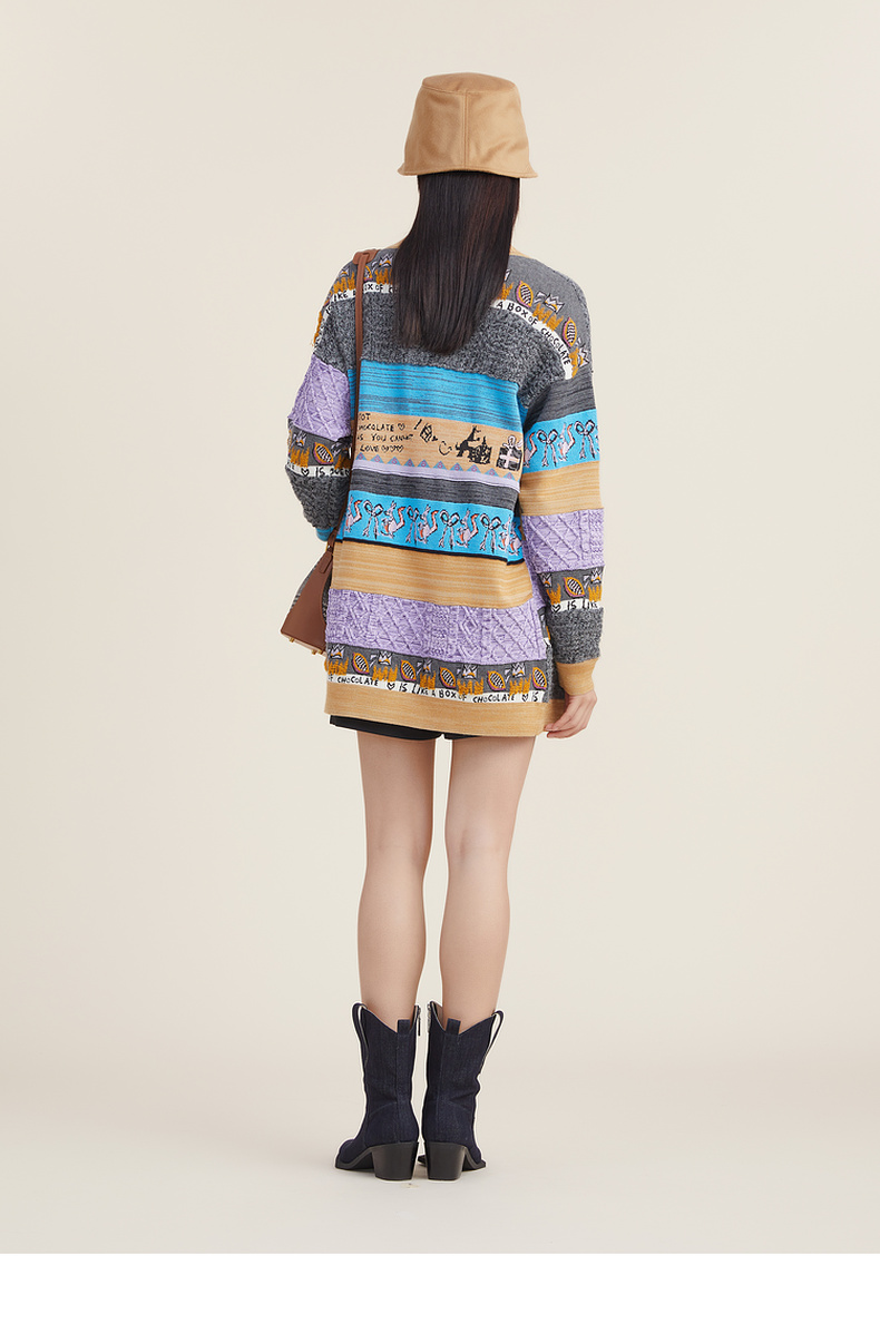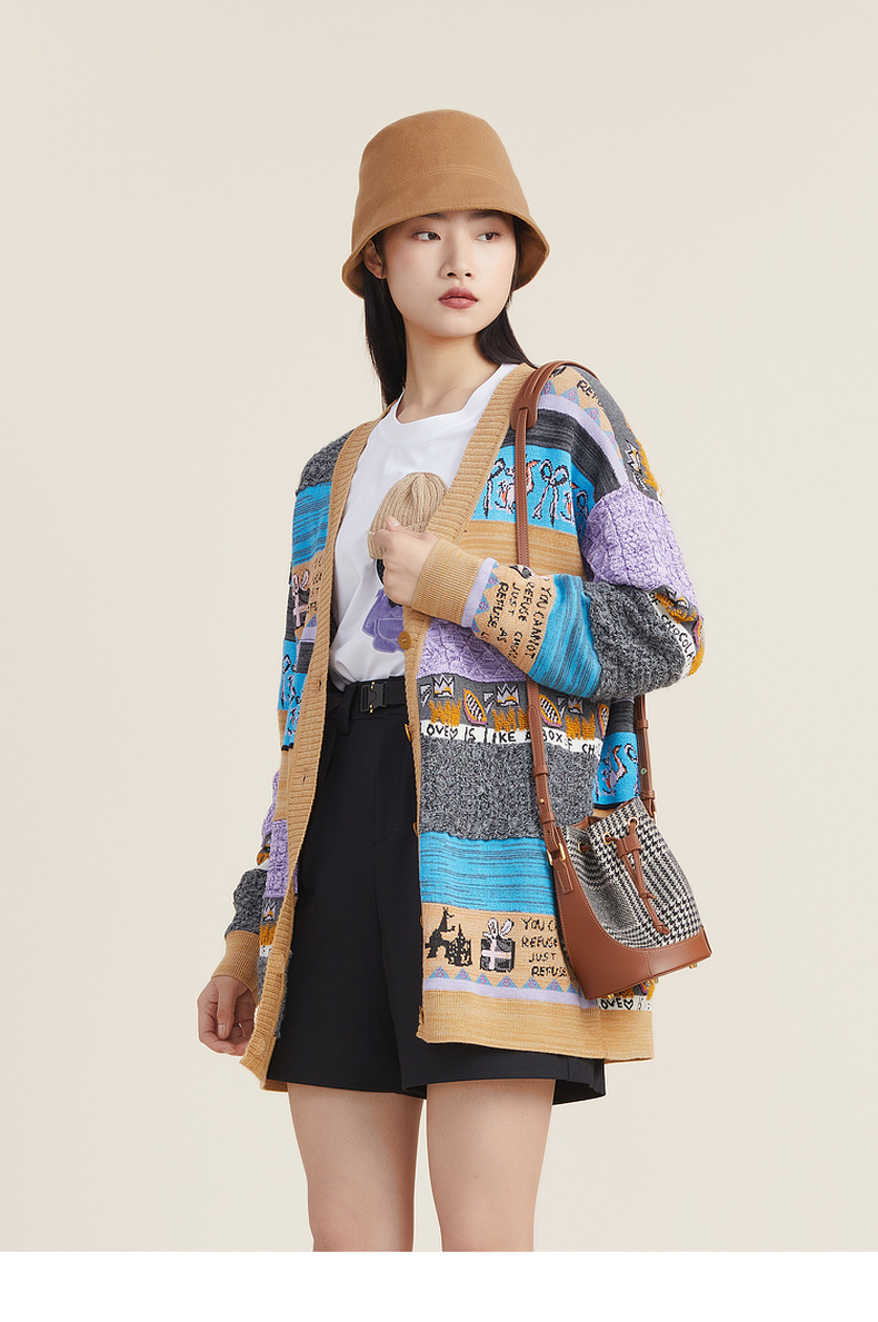 谜底2022秋新款复古宽松V领开衫趣味图案针织衫中长款女223MZ1370
