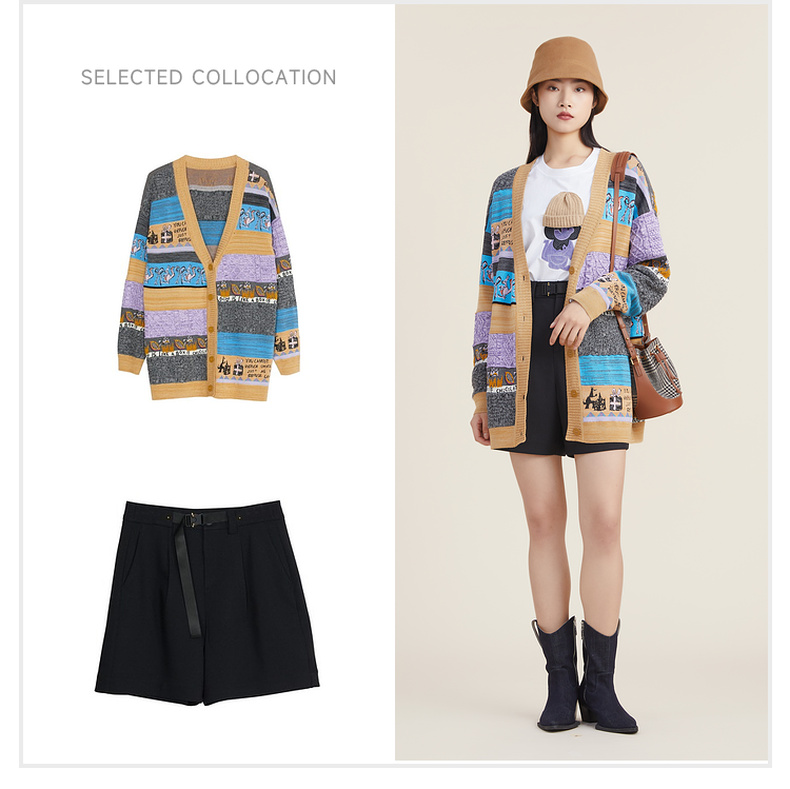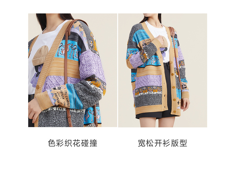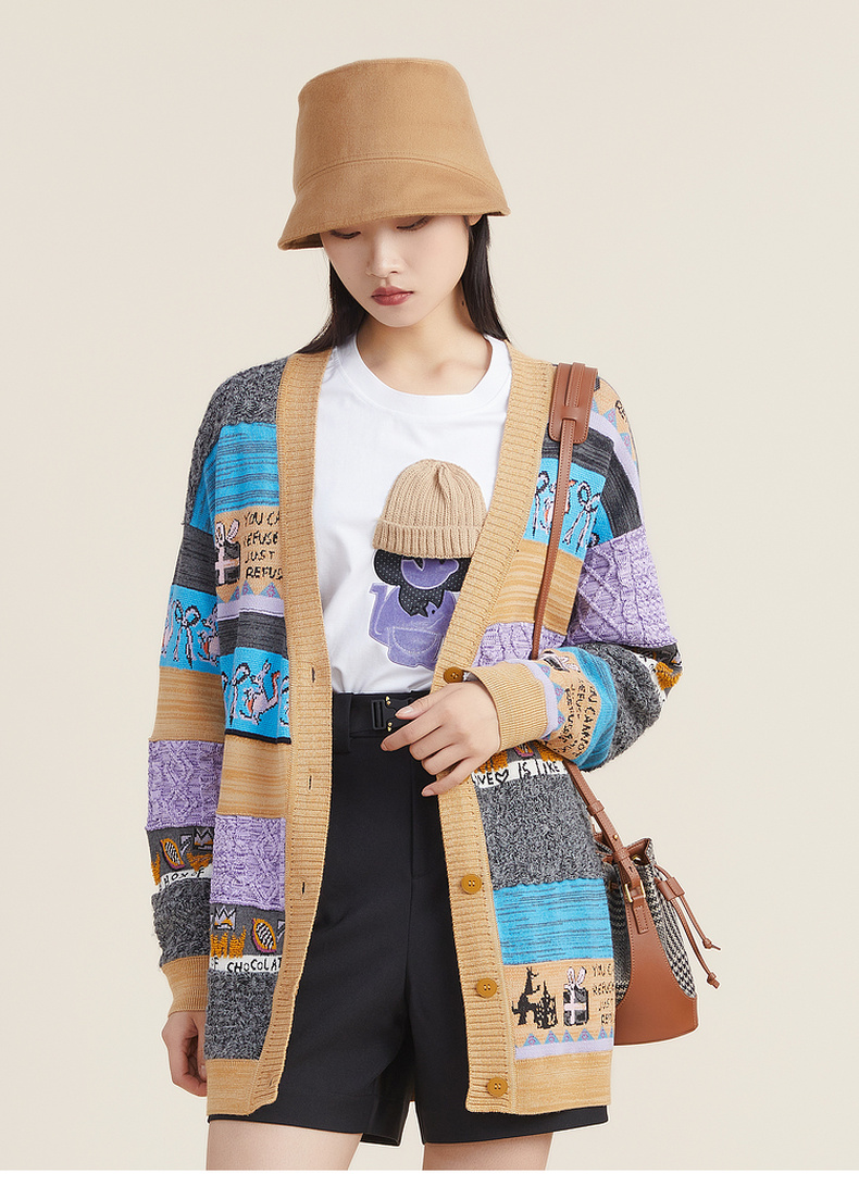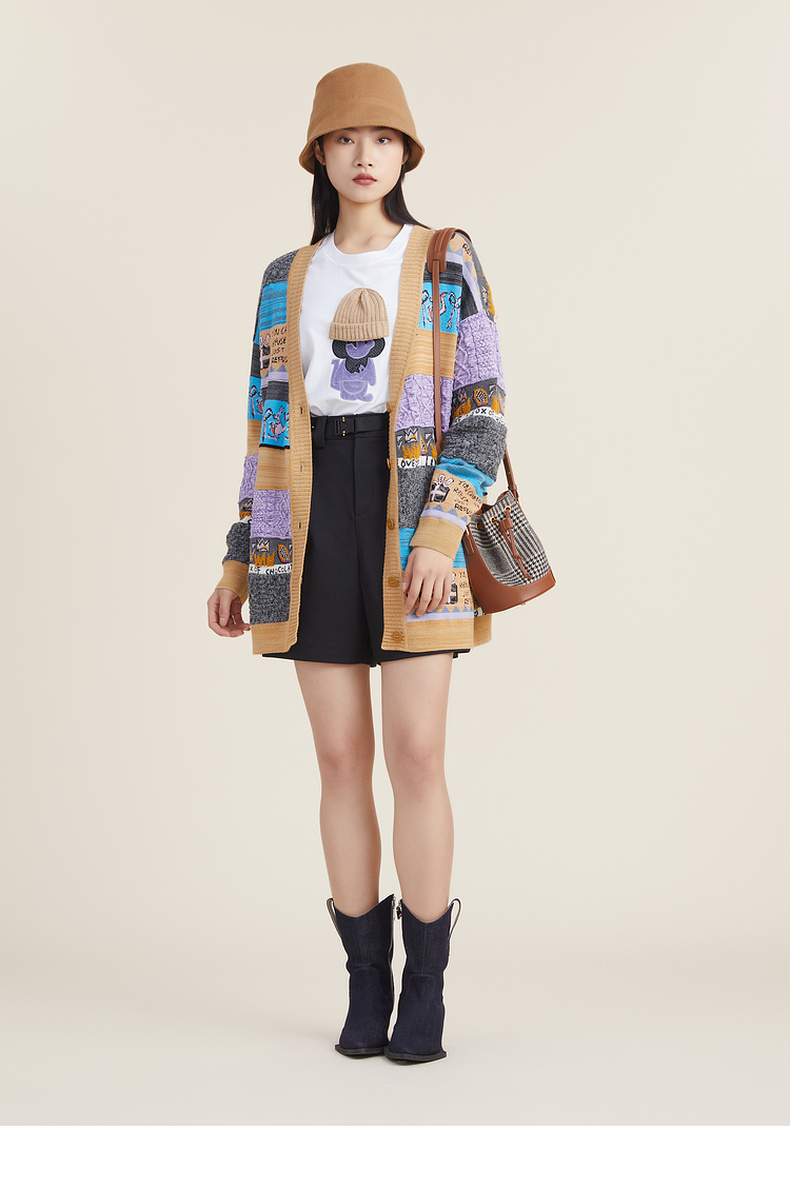 谜底2022秋新款复古宽松V领开衫趣味图案针织衫中长款女223MZ1370