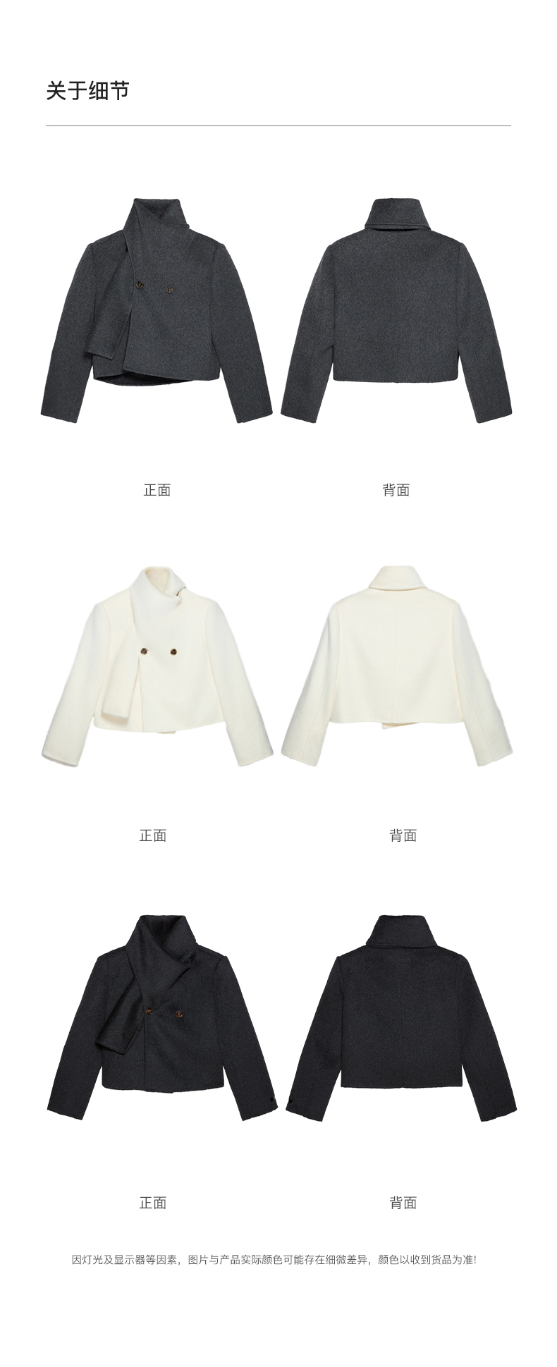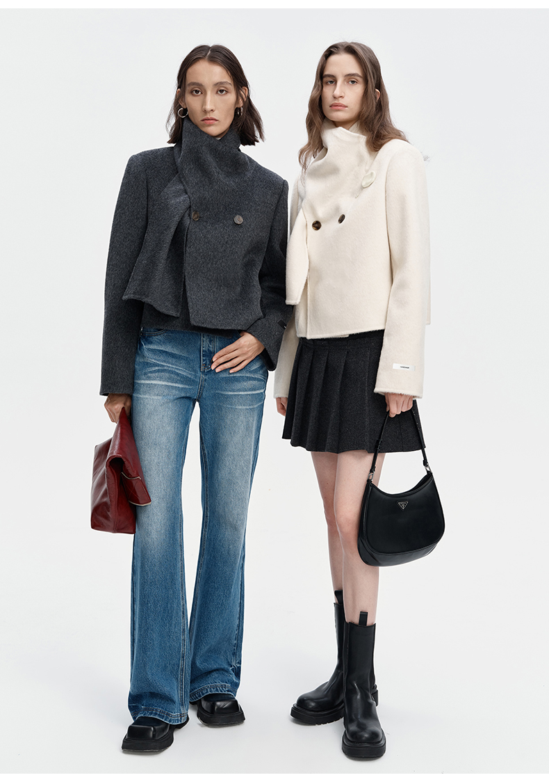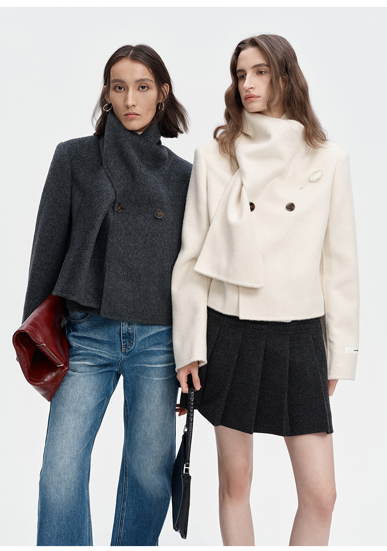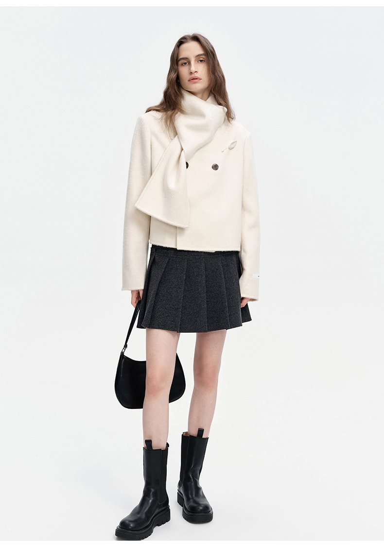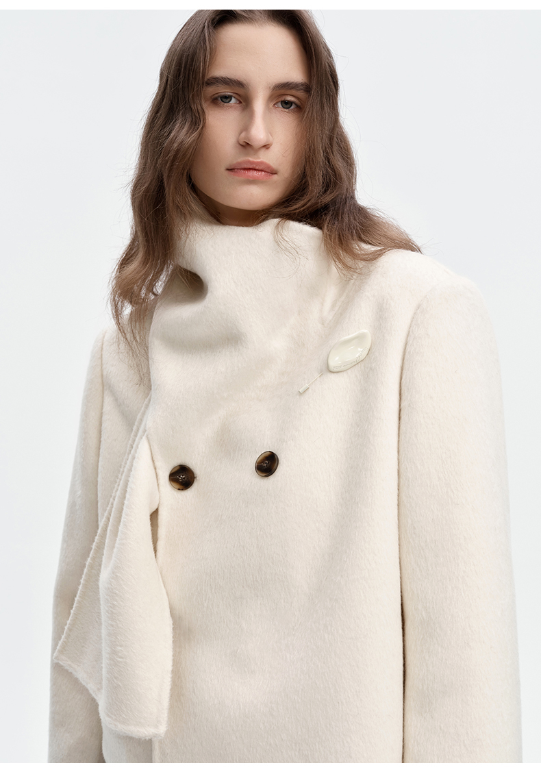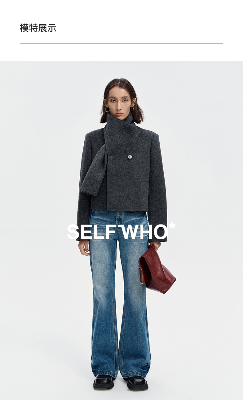 SELFWHO澳洲进口绵羊毛羊驼毛双面呢围巾领短外套女2024冬款大衣