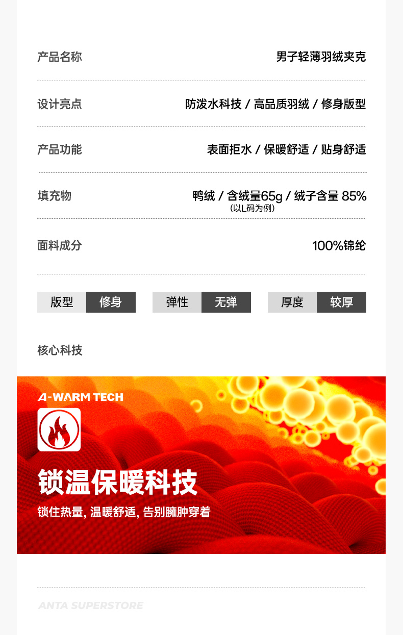 超级安踏男羽绒服夹克轻盈保暖秋冬防泼水运动通勤外套152546901U