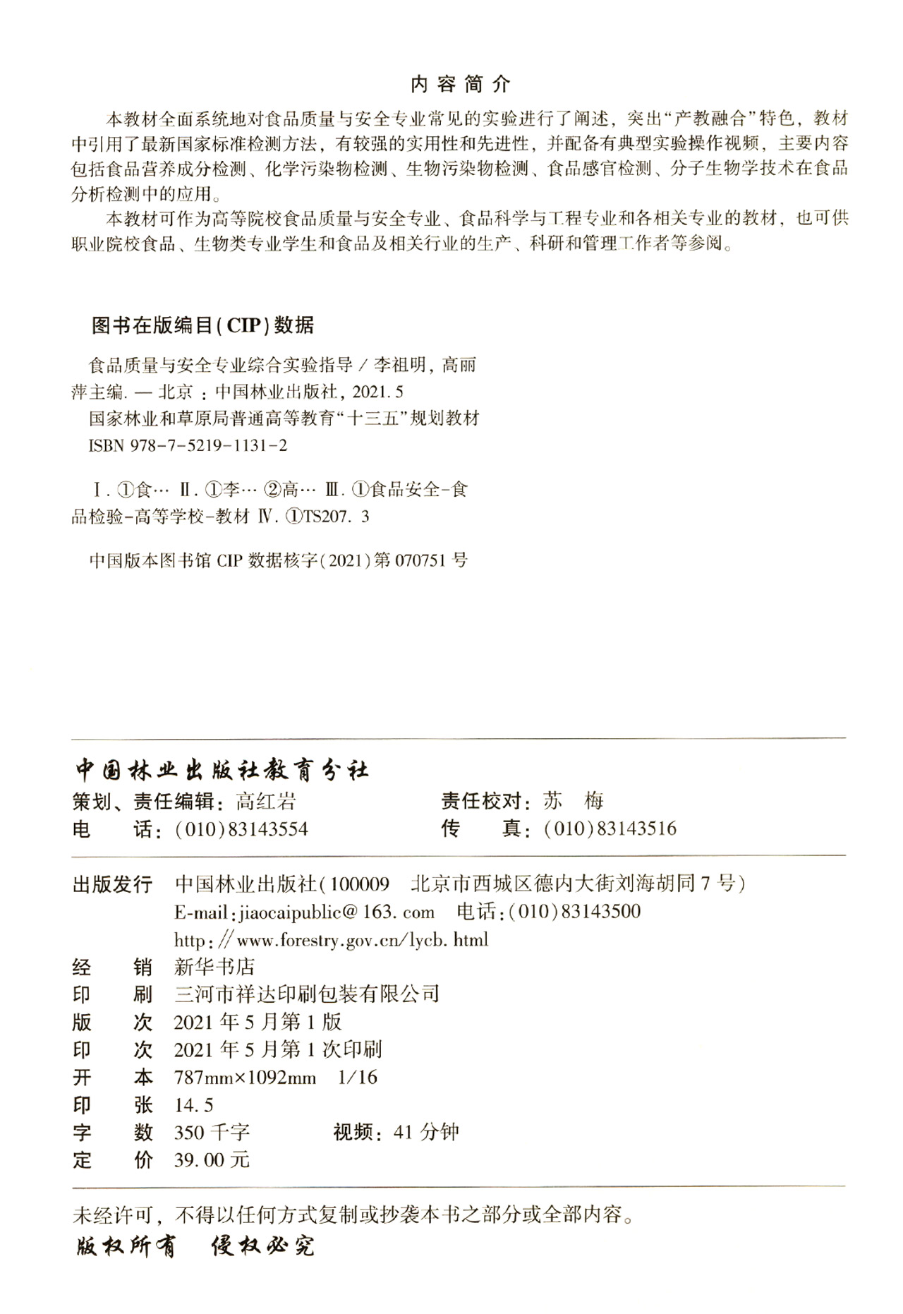食品质量与安全专业综合实验指导(国家林业和草原局普通高等教育十三五规划教材) 1131 李祖明//高丽萍 中国林业出版社