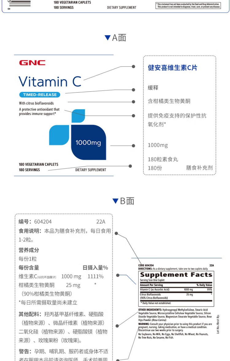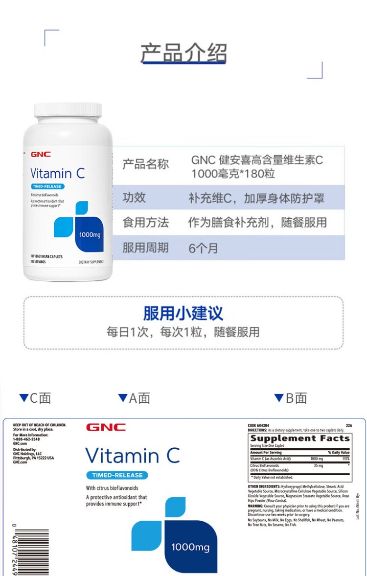 【保税仓】GNC健安喜维生素C片1000mg180片
