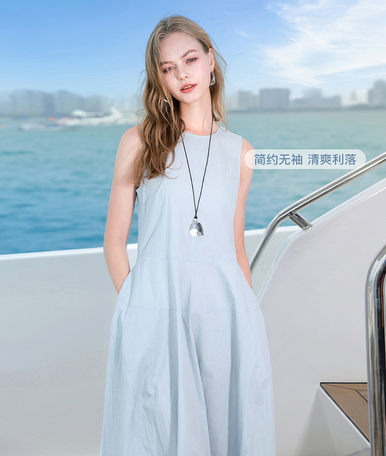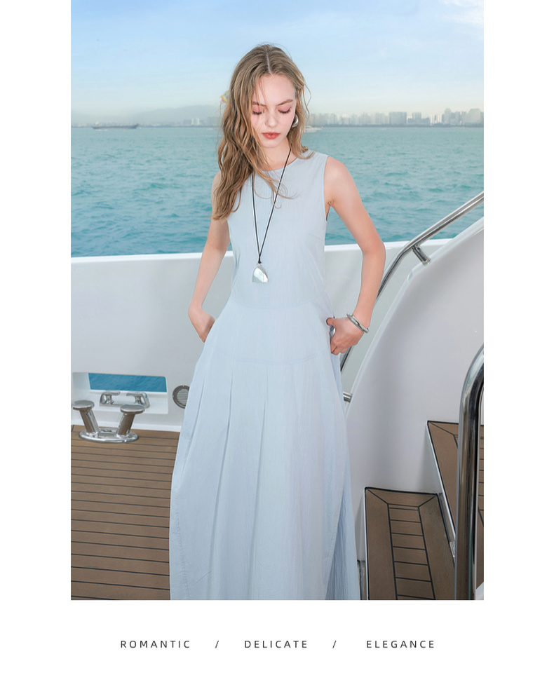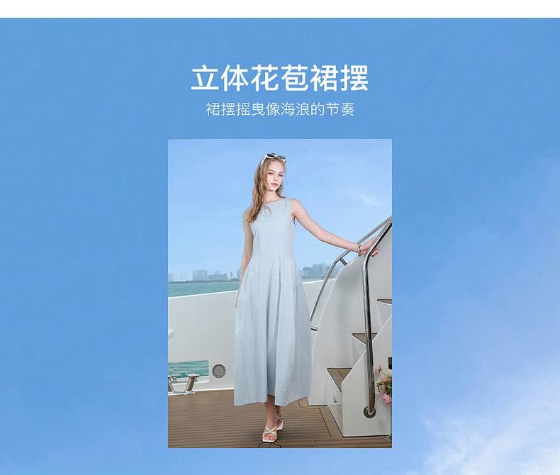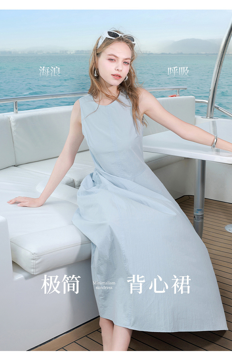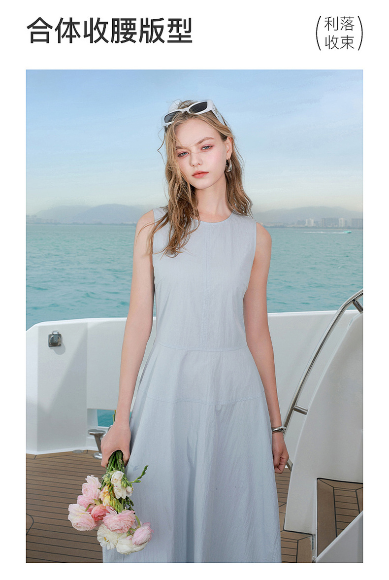 三彩2025夏季新款无袖连衣裙收腰花苞裙长裙圆领背心裙侘寂风M