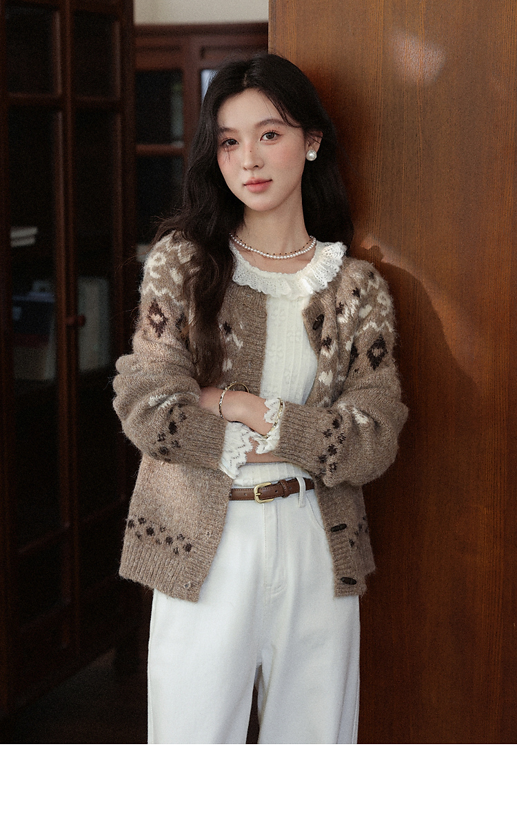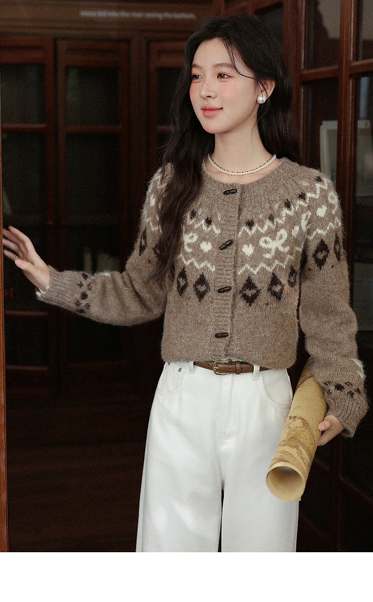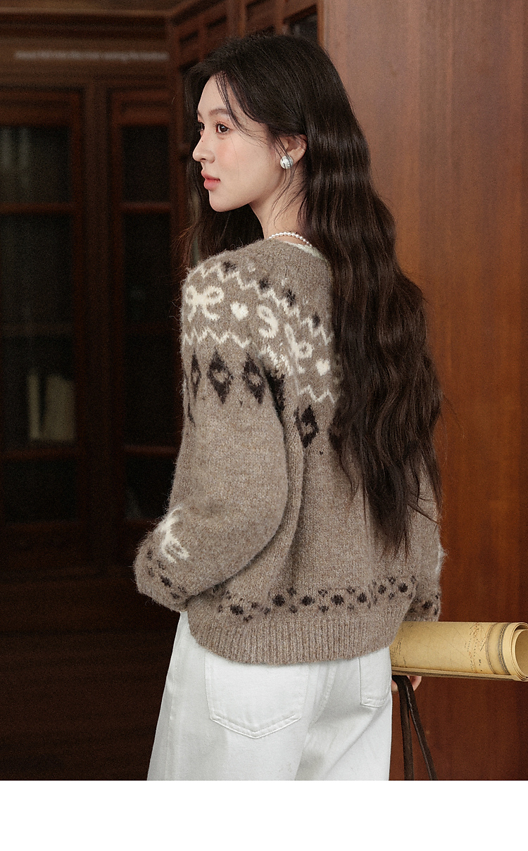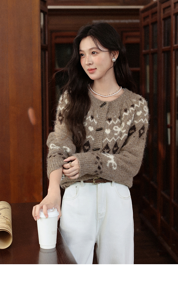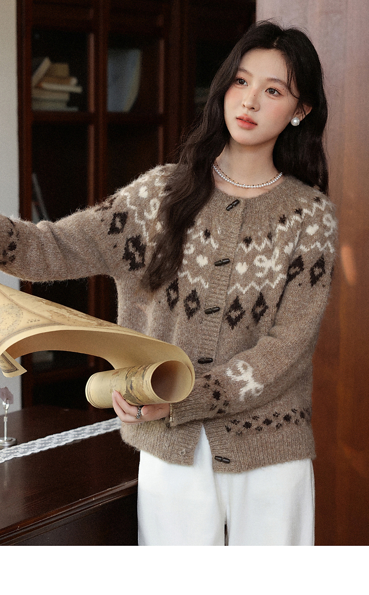 鹿向南「暖冬部落」费尔岛卡其色毛衣女秋冬复古牛角扣针织开衫