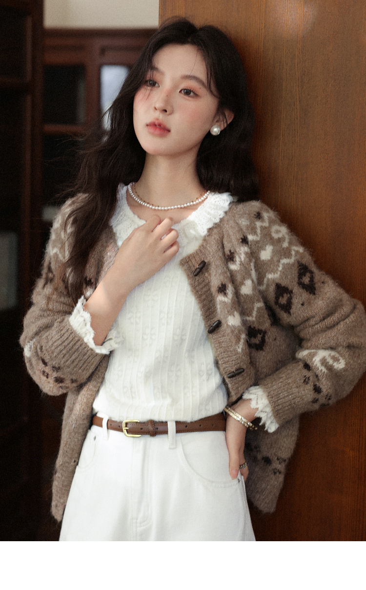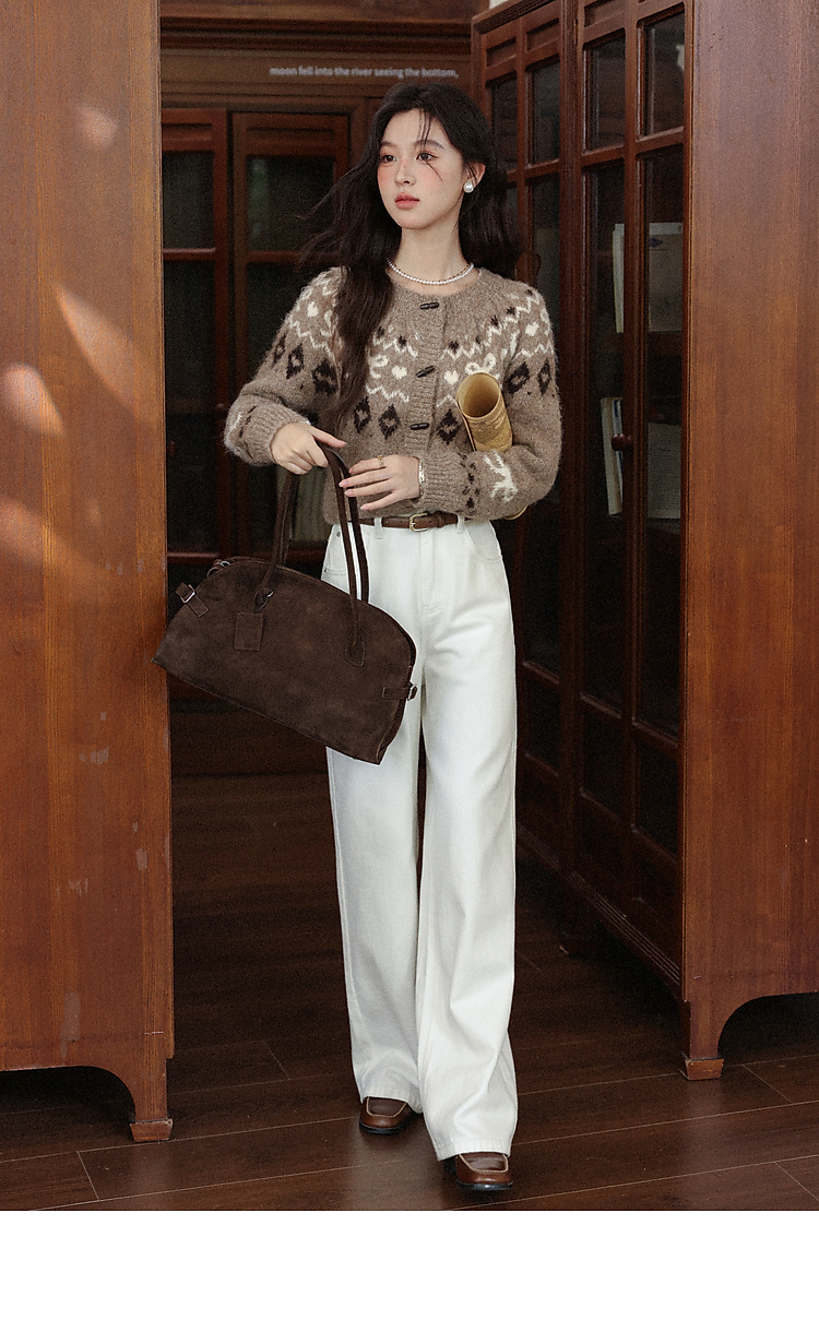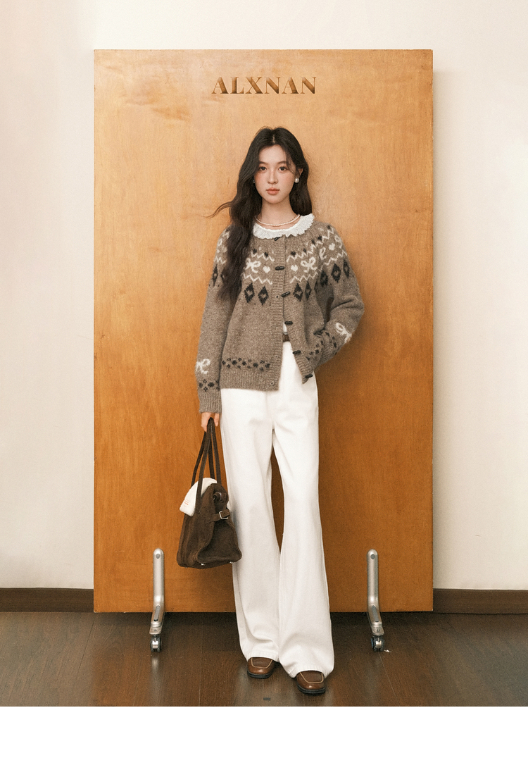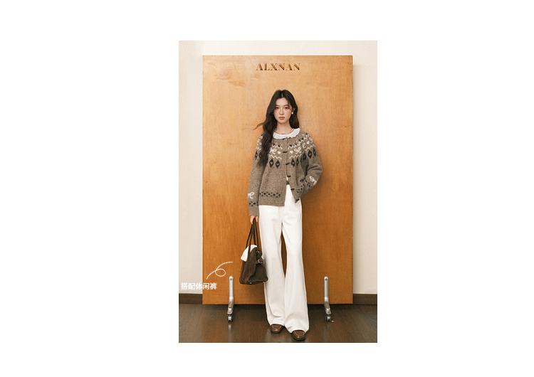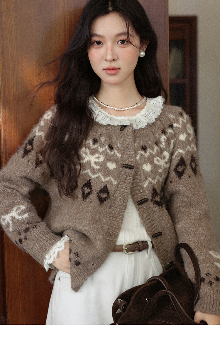 鹿向南「暖冬部落」费尔岛卡其色毛衣女秋冬复古牛角扣针织开衫