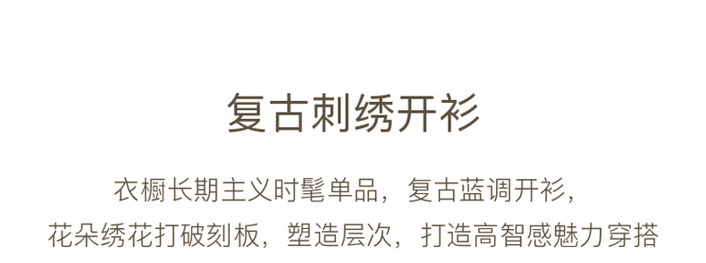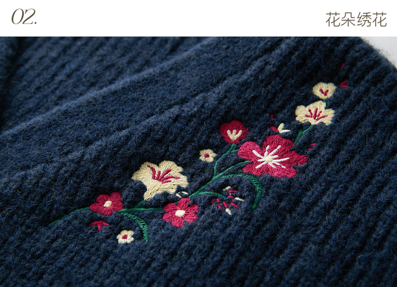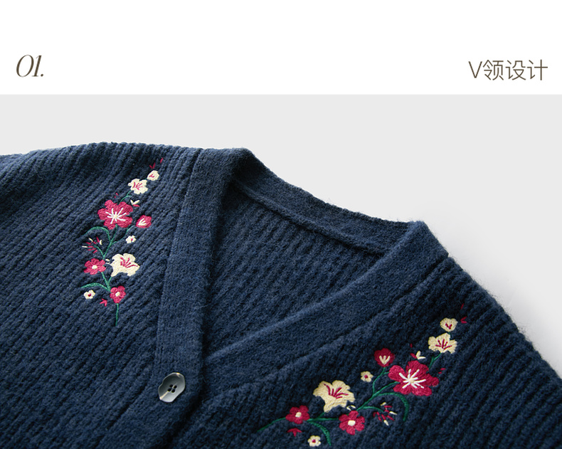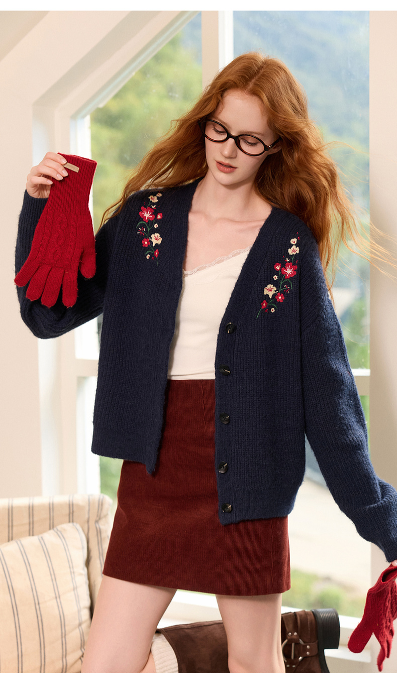 三彩2025冬季新款花朵刺绣复古开衫针织衫宽松V领毛衫落肩袖休闲M
