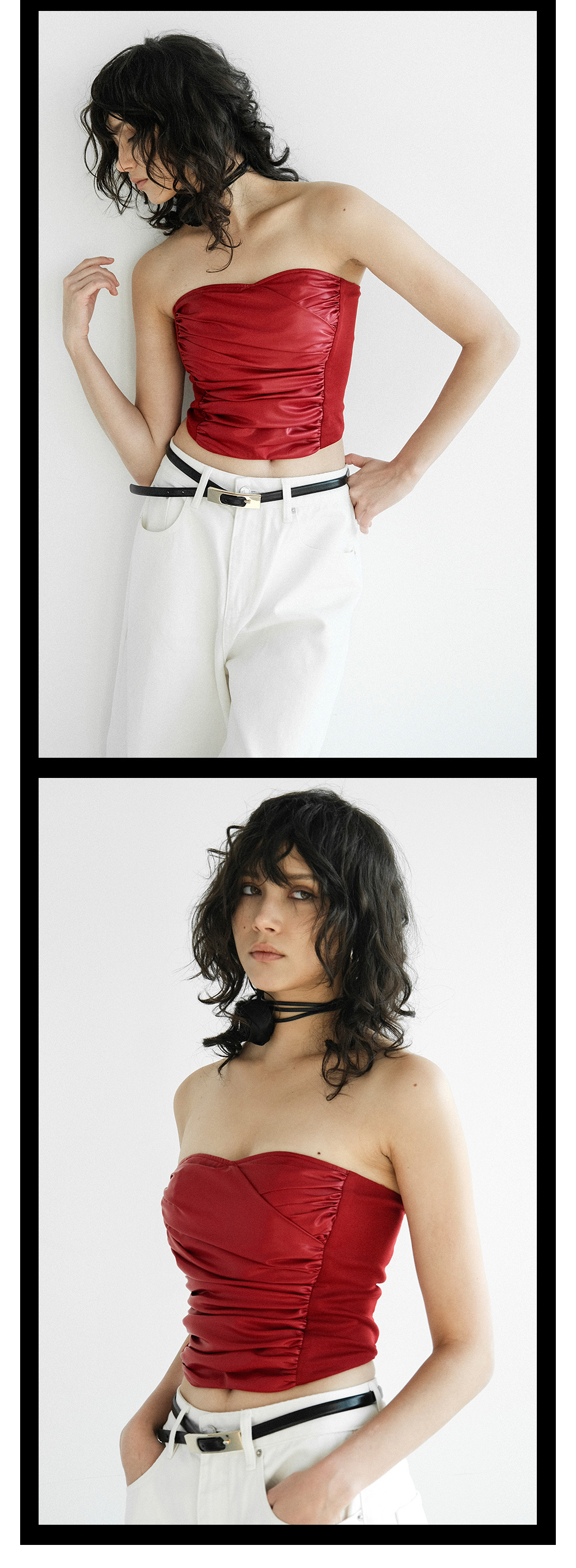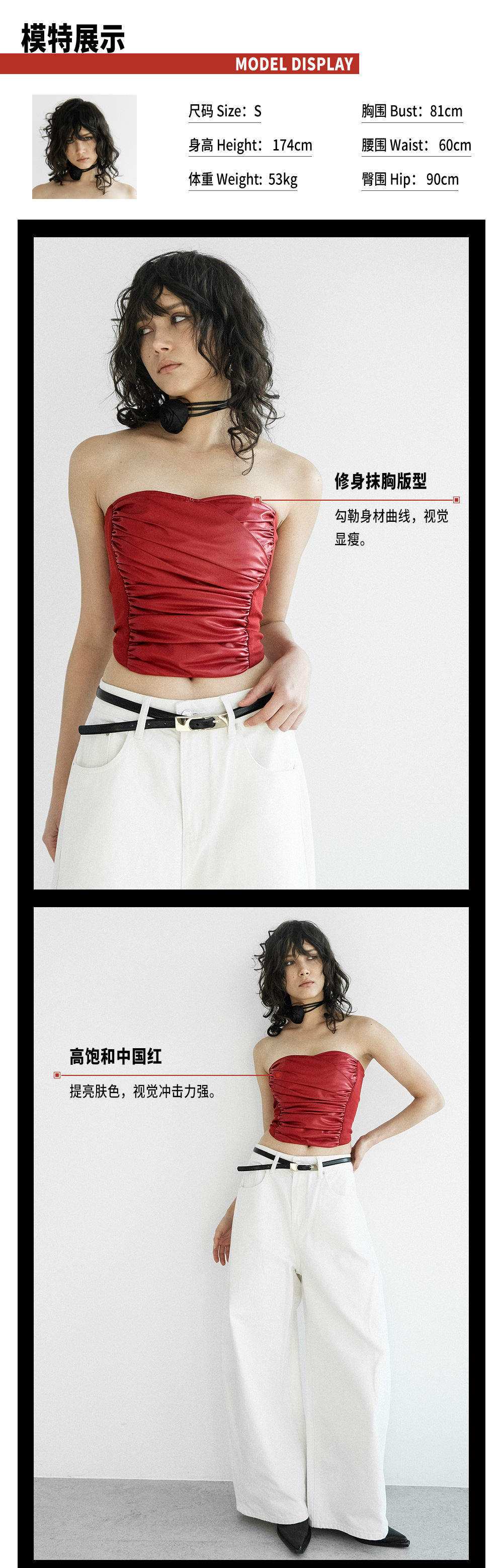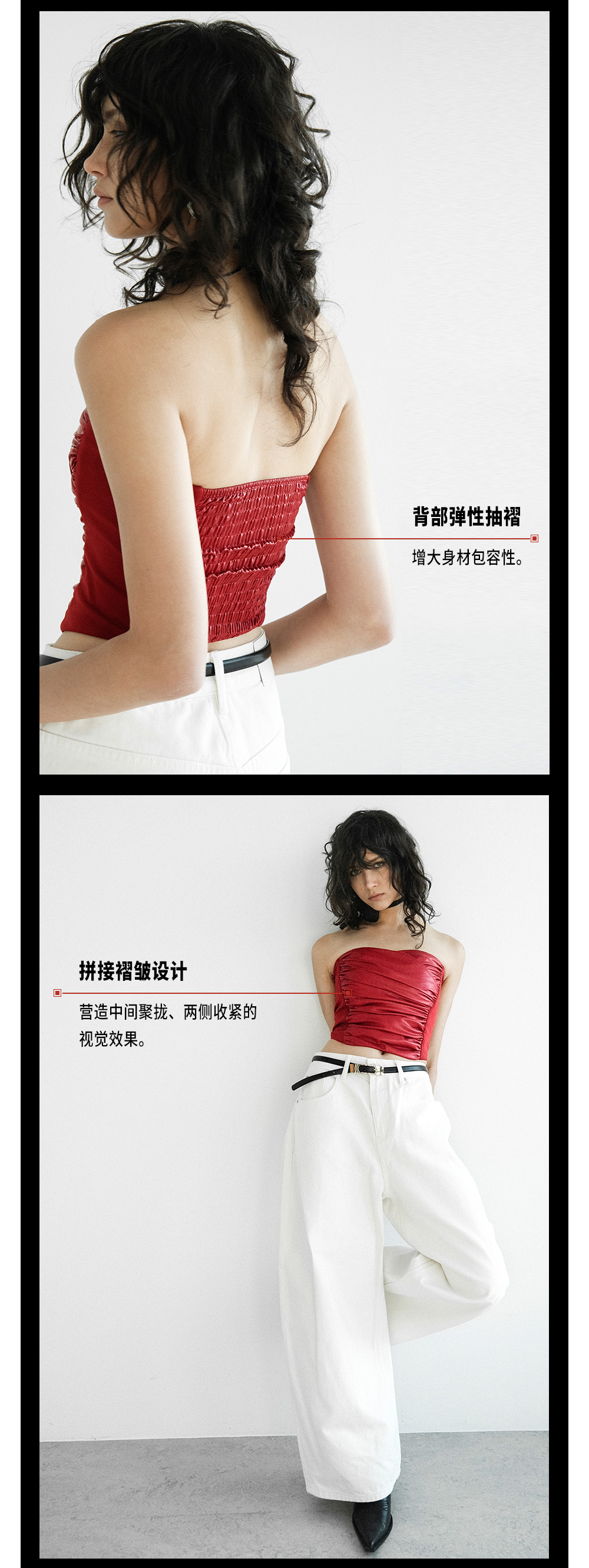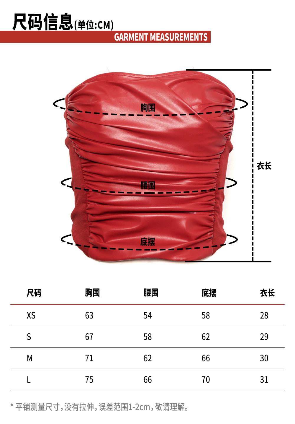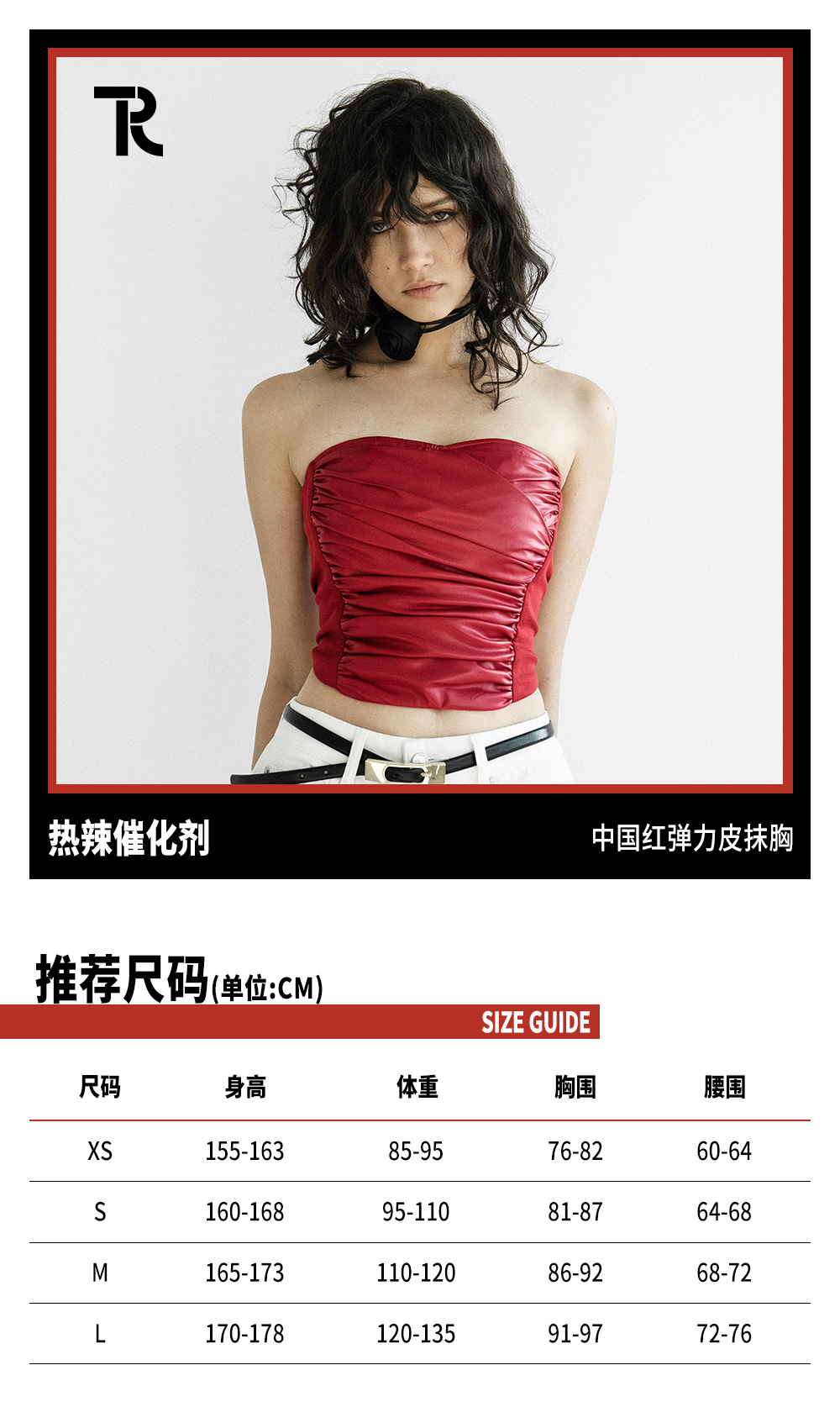 TR她热 热辣催化剂 红色PU抽褶弹力显瘦性感皮修身抹胸上衣