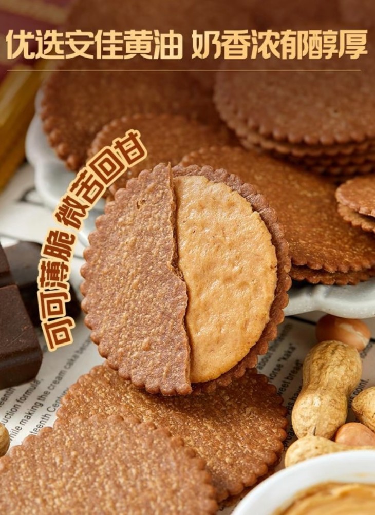 🥜谁懂这种花生酱夹心搭配马铃薯&可可味薄脆 轻咬一口“咔嚓”超级酥脆💥疯狂掉渣简直绝了 特别添加≥25%高油酸花生酱 浓郁醇厚 原味是超浓花生酱的醇厚口感 咸甜交织越嚼越香! 可可味更是王炸!微苦可可粉中和了花生酱的甜 一口下去香到天灵盖发麻 我能一下炫好几袋 3️⃣重控糖的配方 小麦香和花生味的碰撞~ 我愿称之为饼干界的“香奈儿”高贵又迷人😌