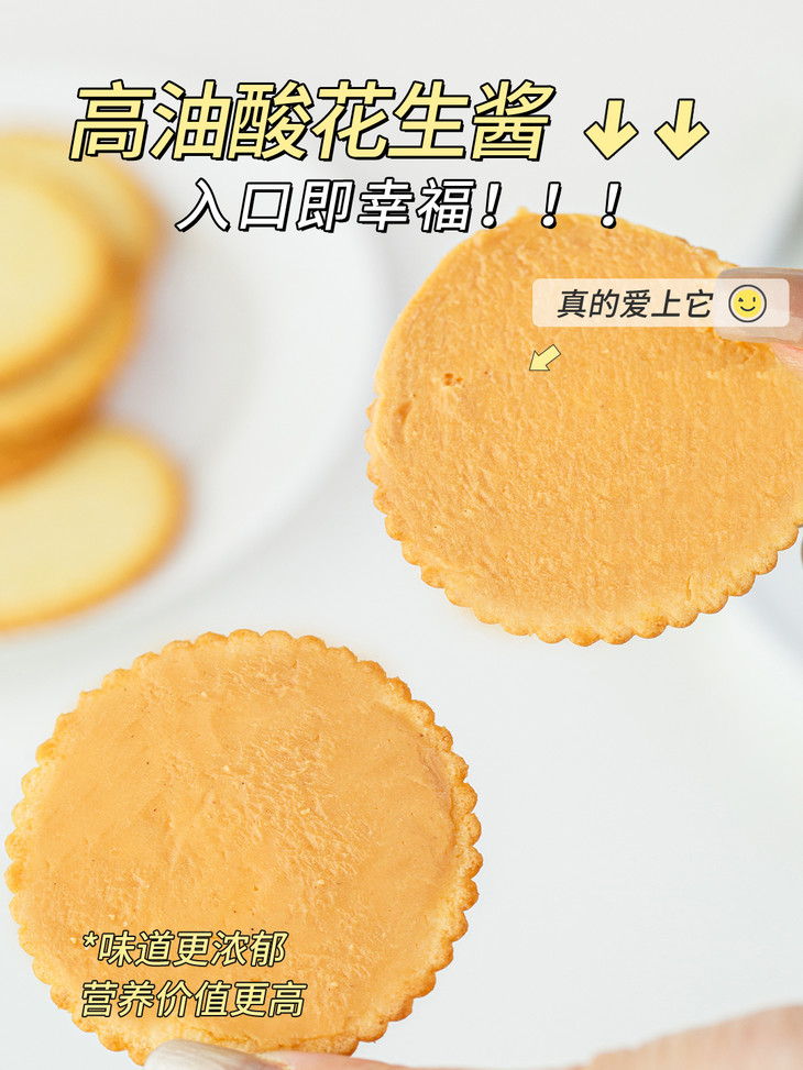 🔥特别添加≥25%高油酸花生酱含量!!谁懂❗️ 糊嘴的香浓 舔手指警告 👉 ③重控糖黑科技!!! 1️⃣ 减糖30% → 甜味不封喉 2️⃣ 海盐0.3% → 咸味提鲜 3️⃣ 真花生酱 → 香到上头 别家夹心齁甜是因为糖浆凑数导致❌ 咱家用花生自带油脂香 减糖配方但不减味!! 减肥期偷吃更是一点罪恶感都没有好吧🤣