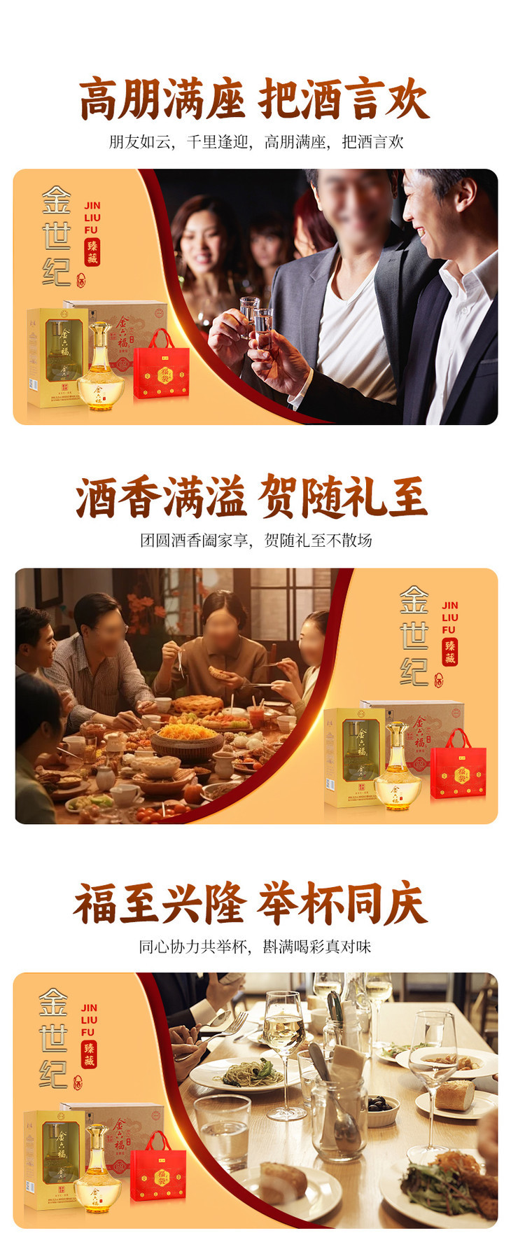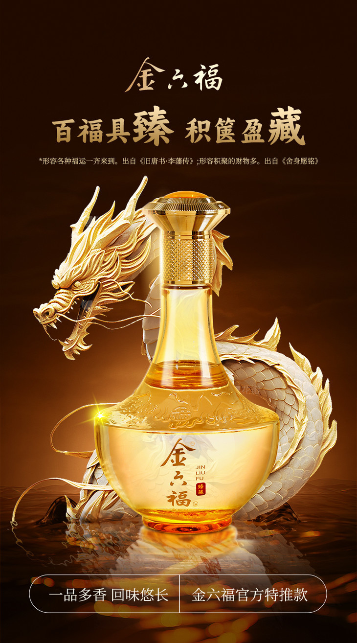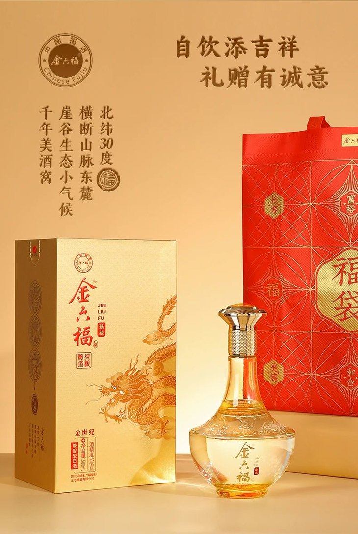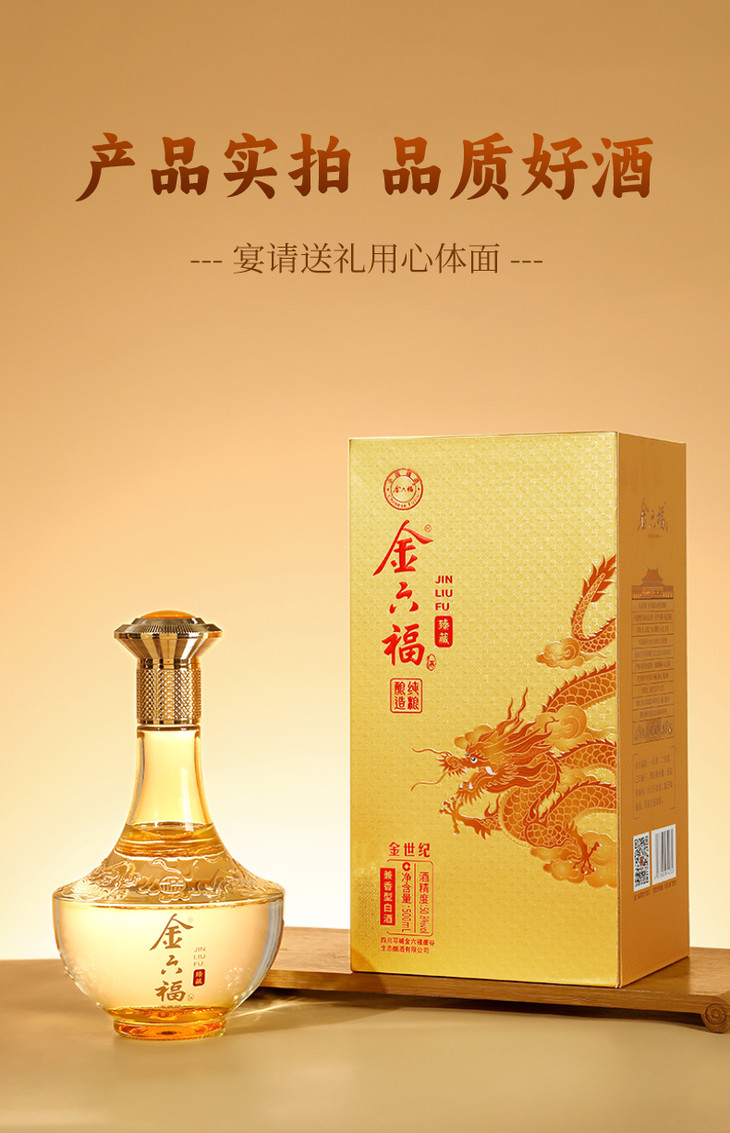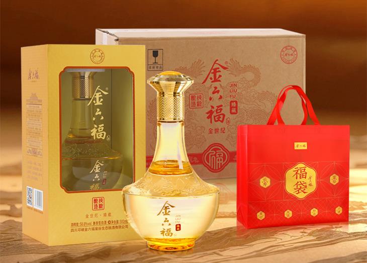 【醇香卓越,酿酒弥新】金六福金世纪臻藏500ml*6瓶,金色为主色调,整体精致贵气,盒身“福”字铺满,手工开窗设计,寓意福气满满,福气临门