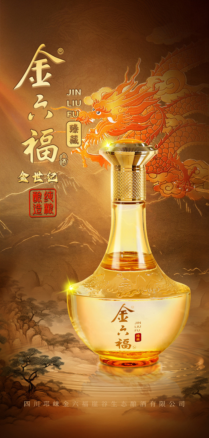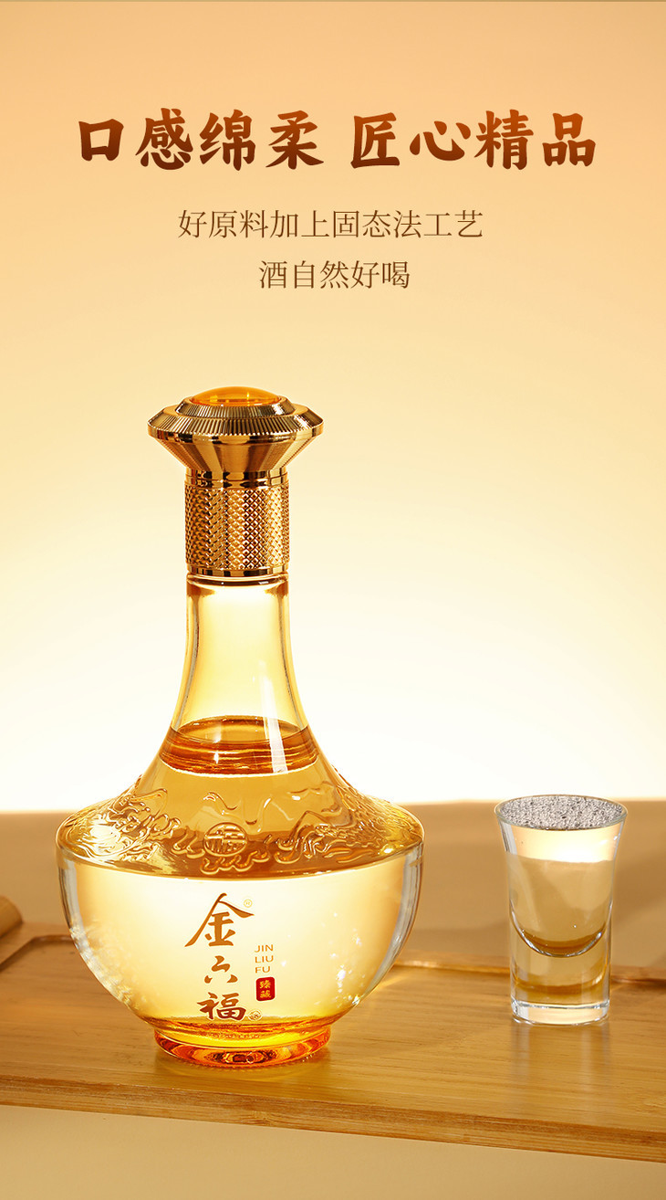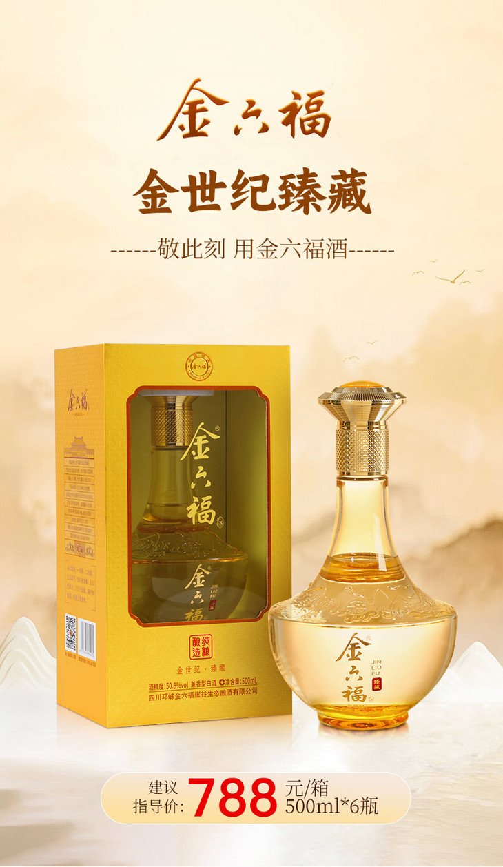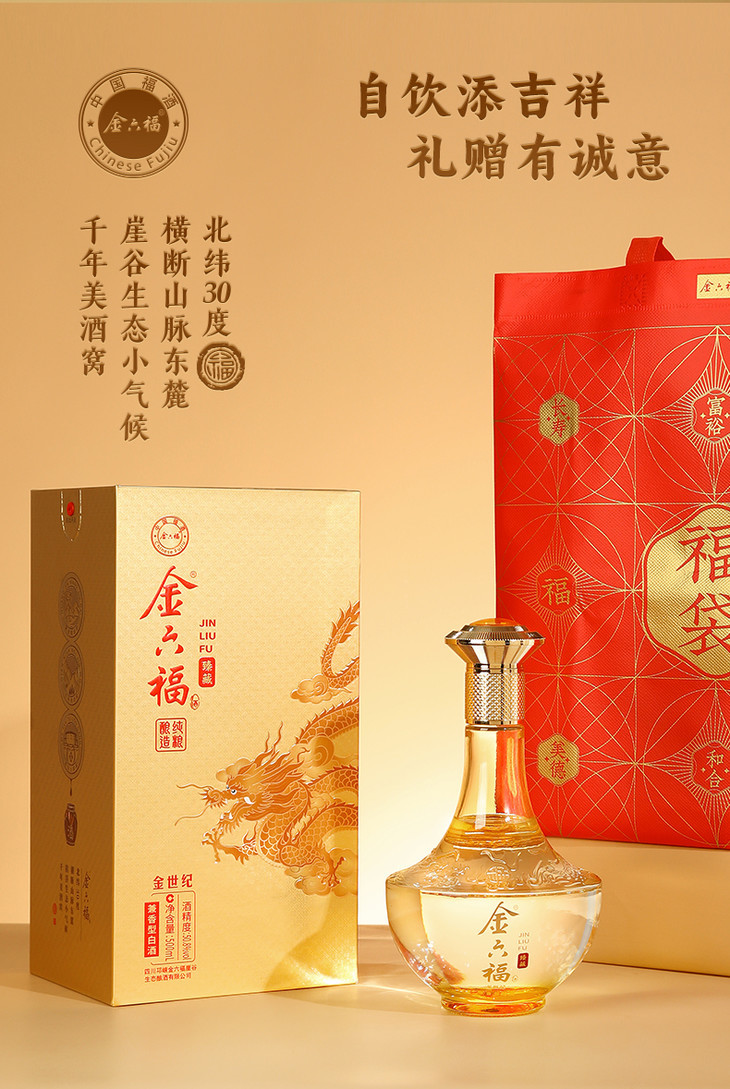 【醇香卓越,酿酒弥新】金六福金世纪臻藏500ml*6瓶,金色为主色调,整体精致贵气,盒身“福”字铺满,手工开窗设计,寓意福气满满,福气临门