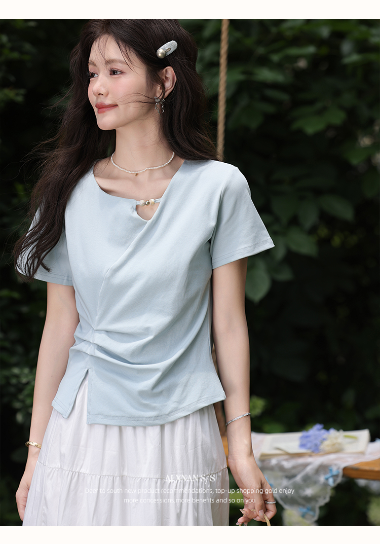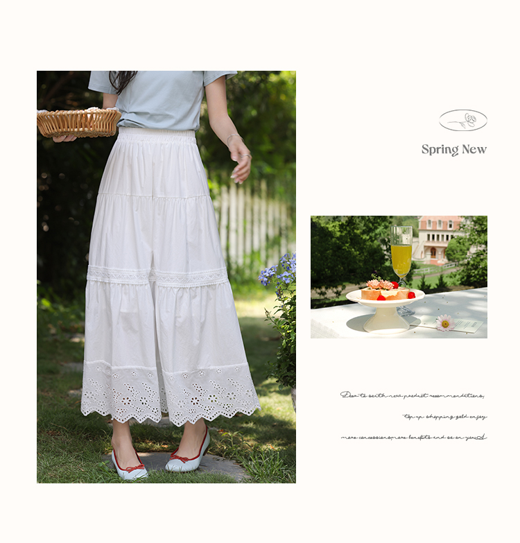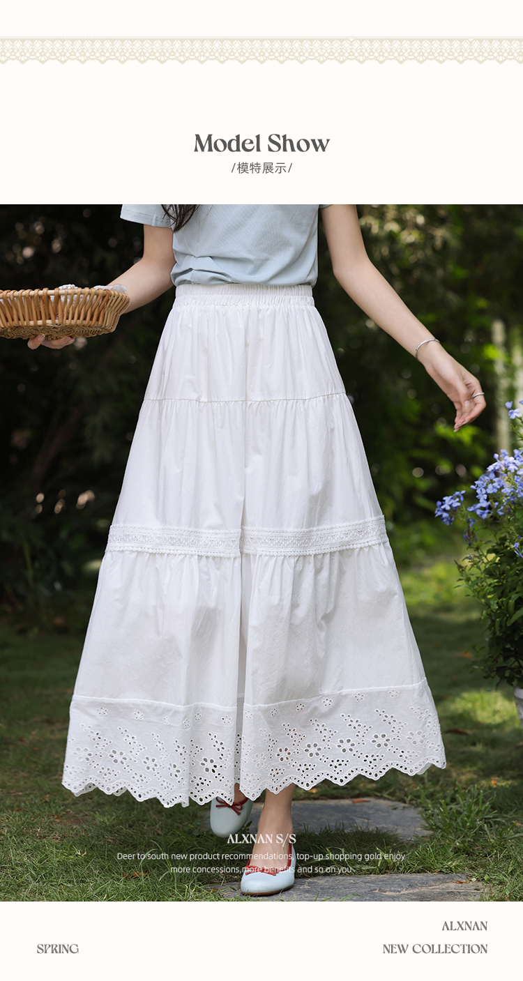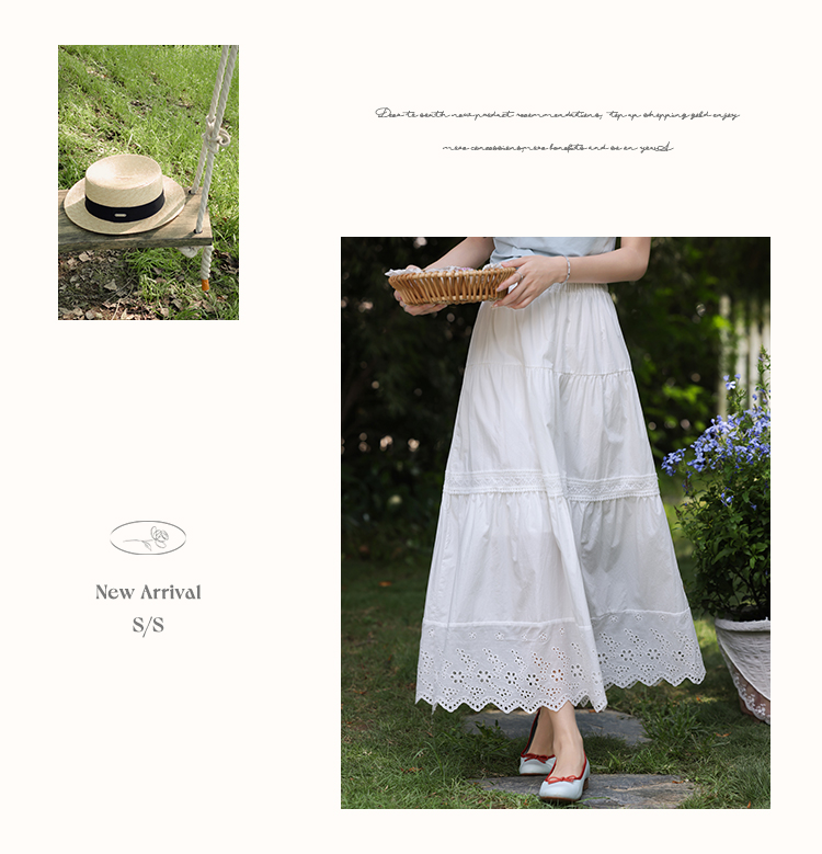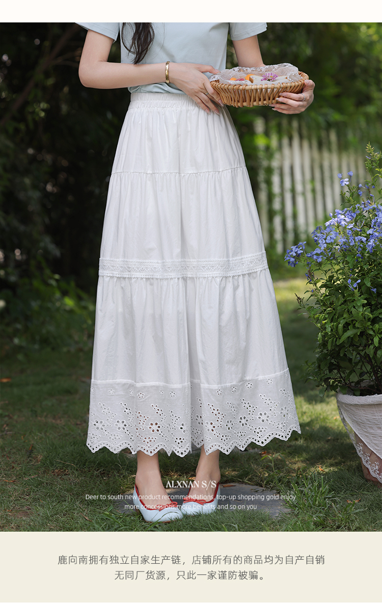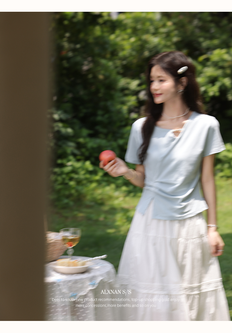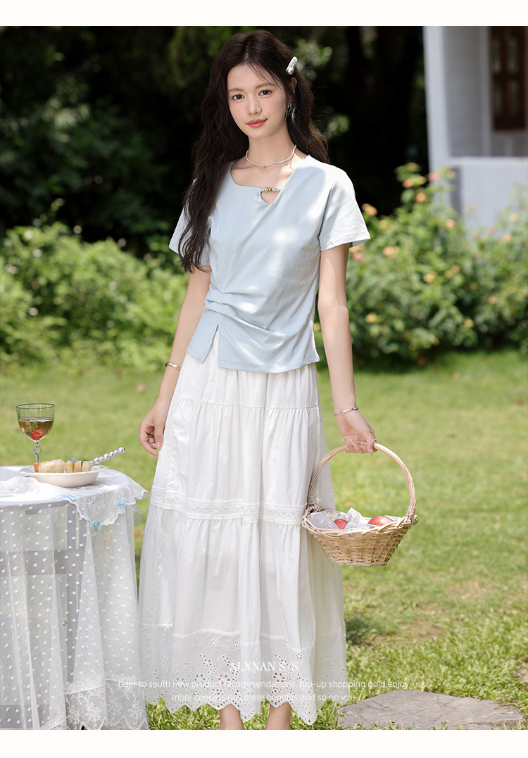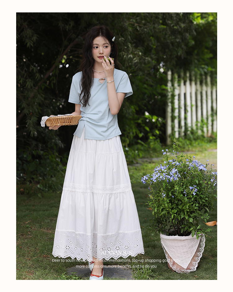 鹿向南「青春香氛」气质法式褶皱 蓝色T恤&米白色镂空半身裙宽松A字长裙女