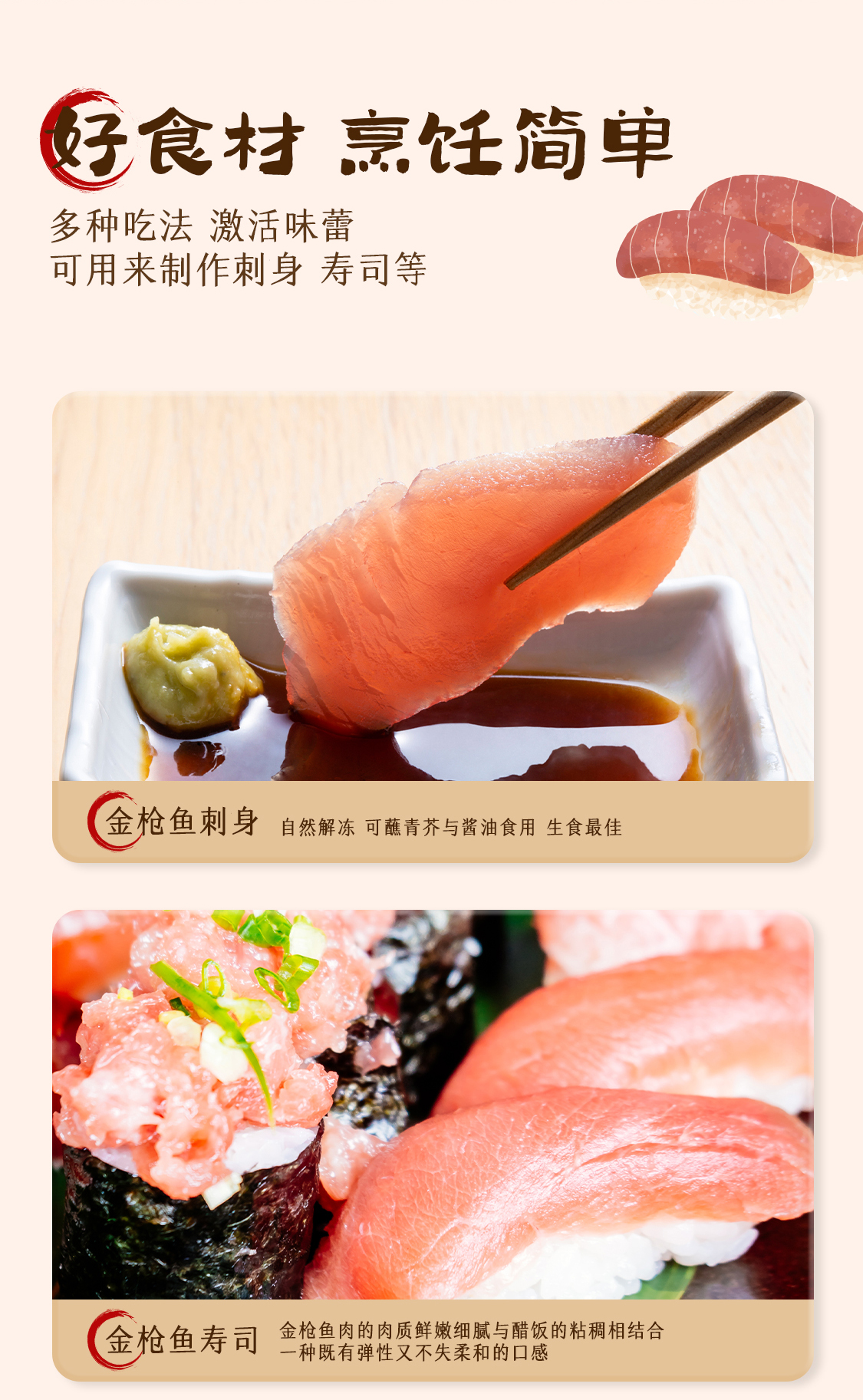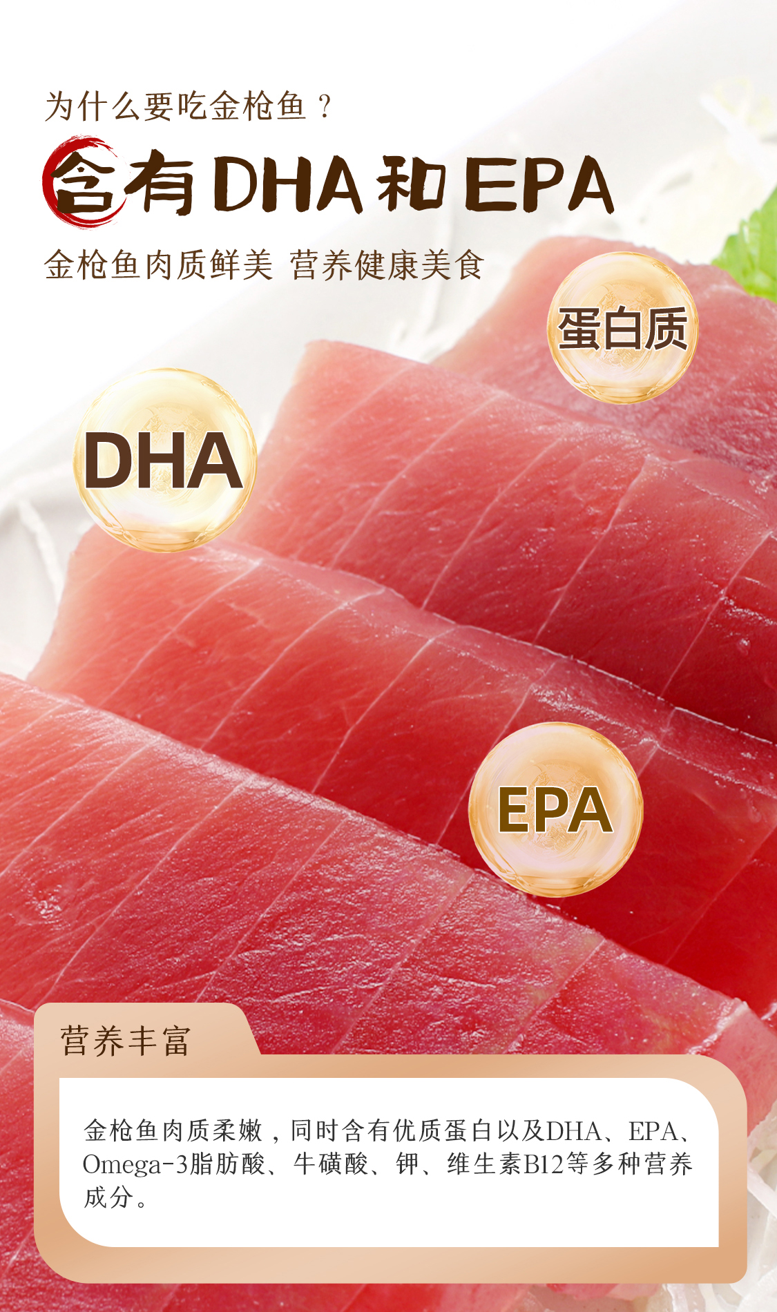 相关注意事项:金枪鱼切片需要超低温(-50℃)存储,家庭冰箱冷冻达不到超低温条件,收到产品24小时内食用最佳,不宜超过7天。食用时搭配酱油+芥末口感最佳。