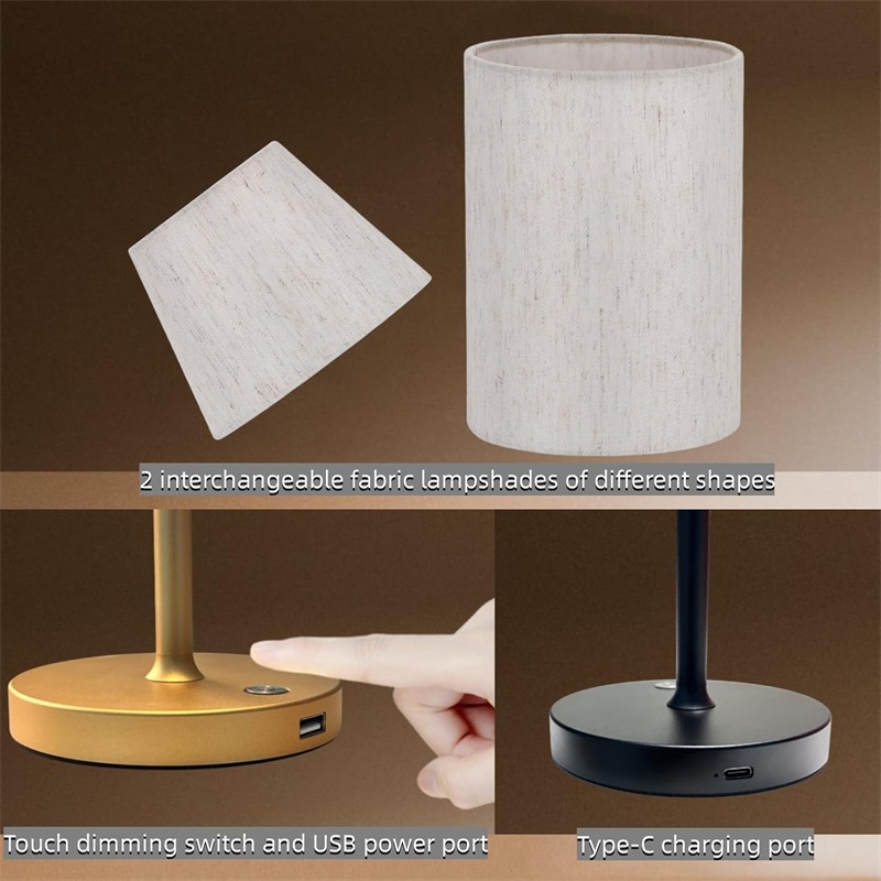 配备两种不同形状的织物灯罩,可调光 LED 灯源,铝制底座坚固耐用,质感细腻。底部橡胶防滑垫,防刮、防滑、防倾倒。适合不同场景的照明和装饰需求。