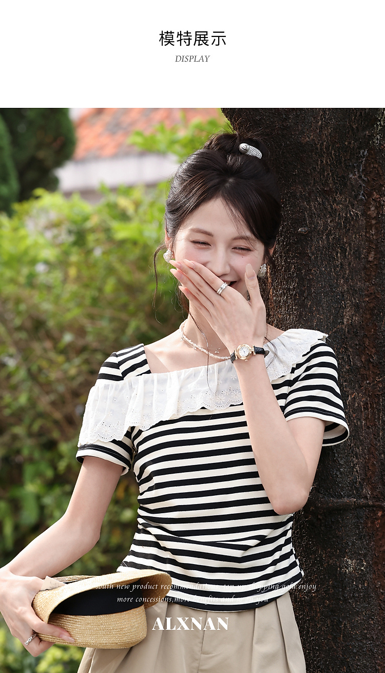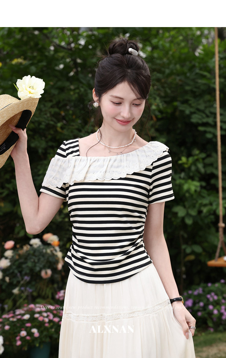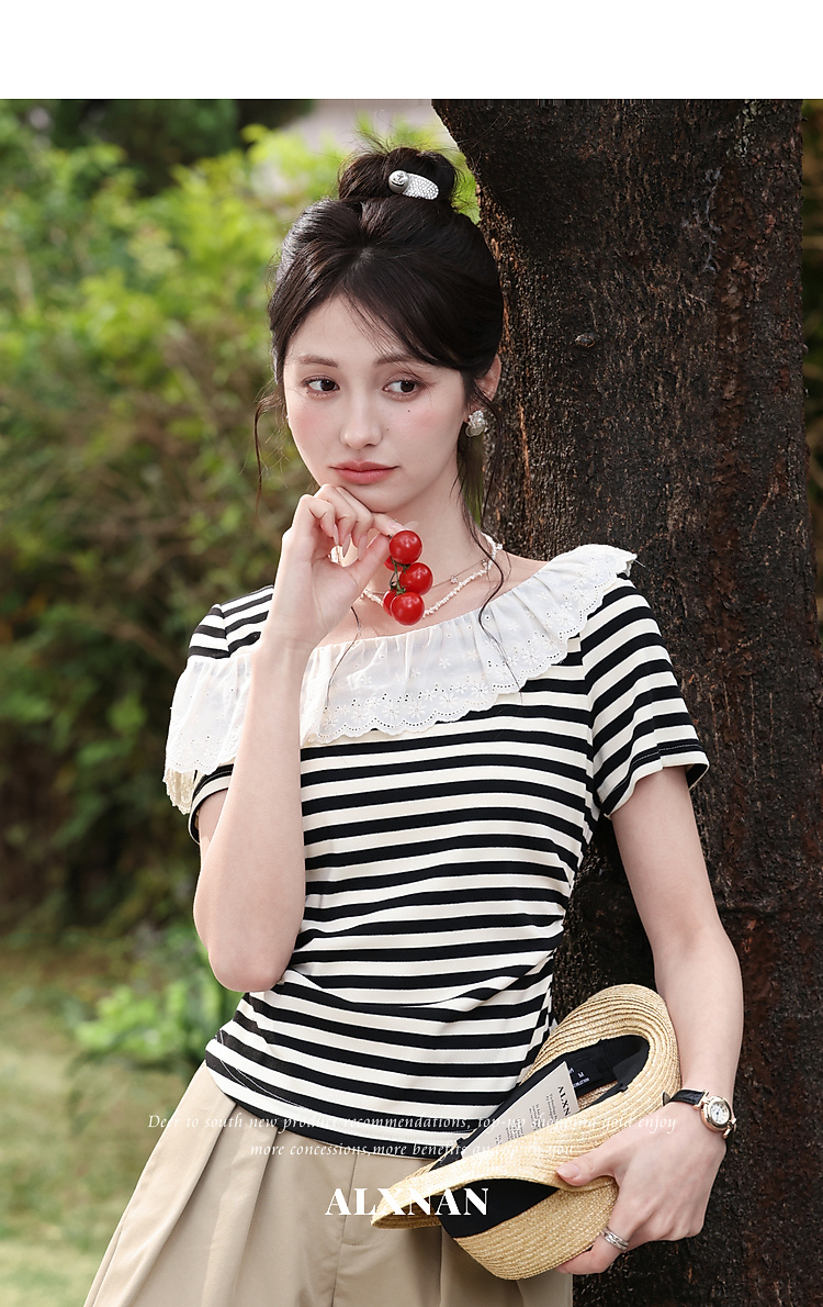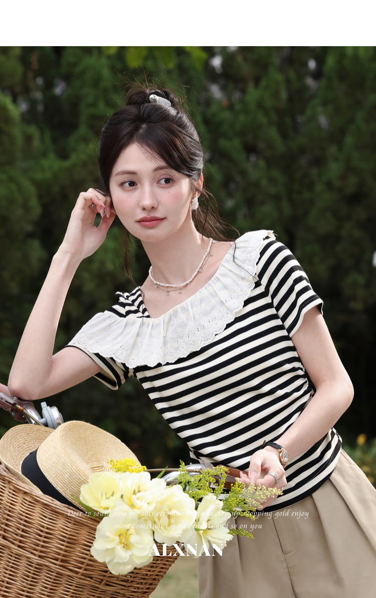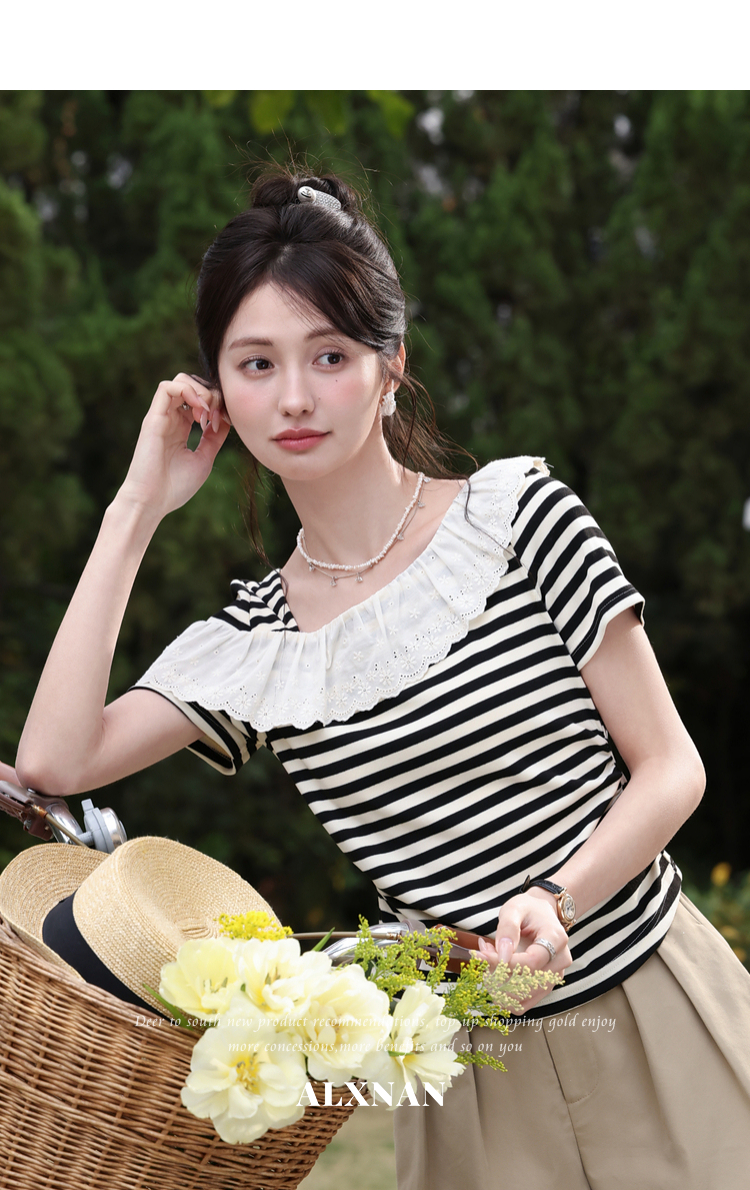 鹿向南「海上钢琴」设计感杏底黑条纹短袖T恤女夏季掐腰显瘦上衣