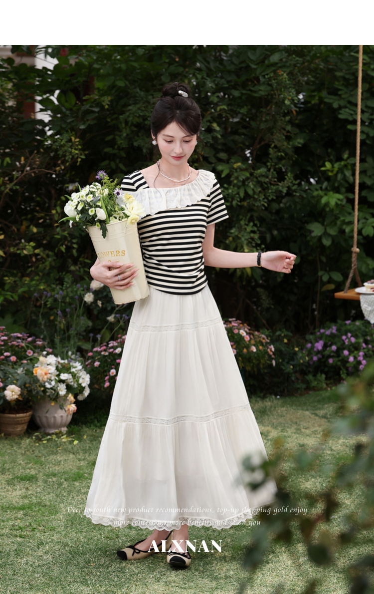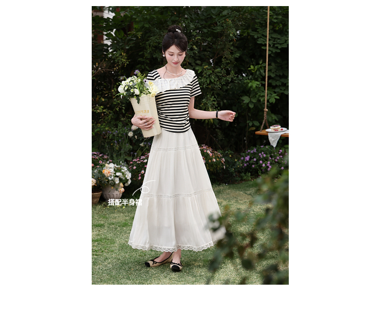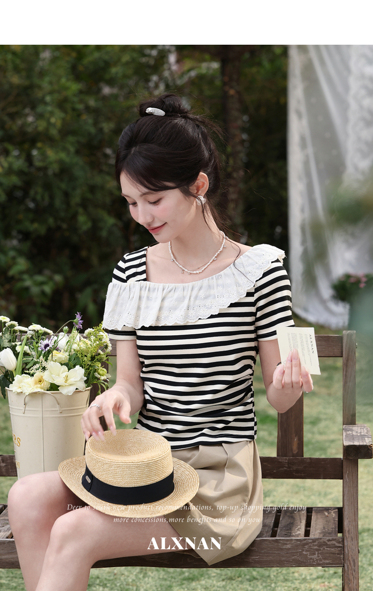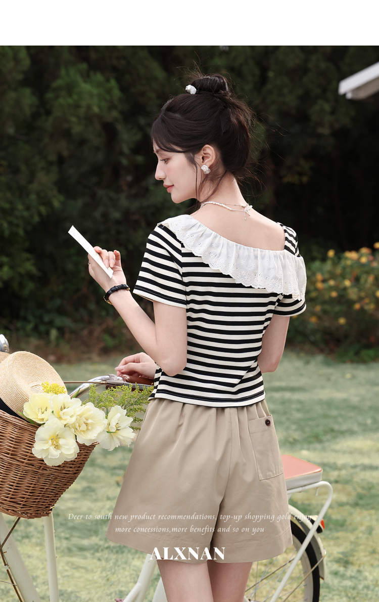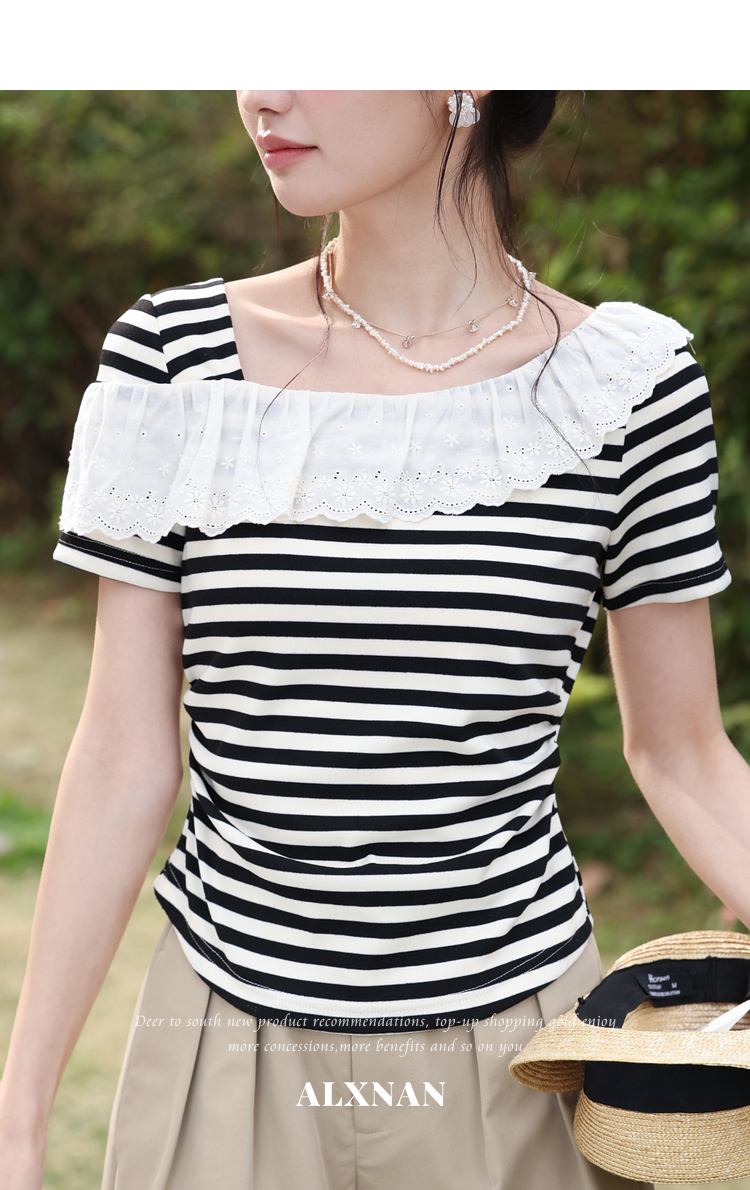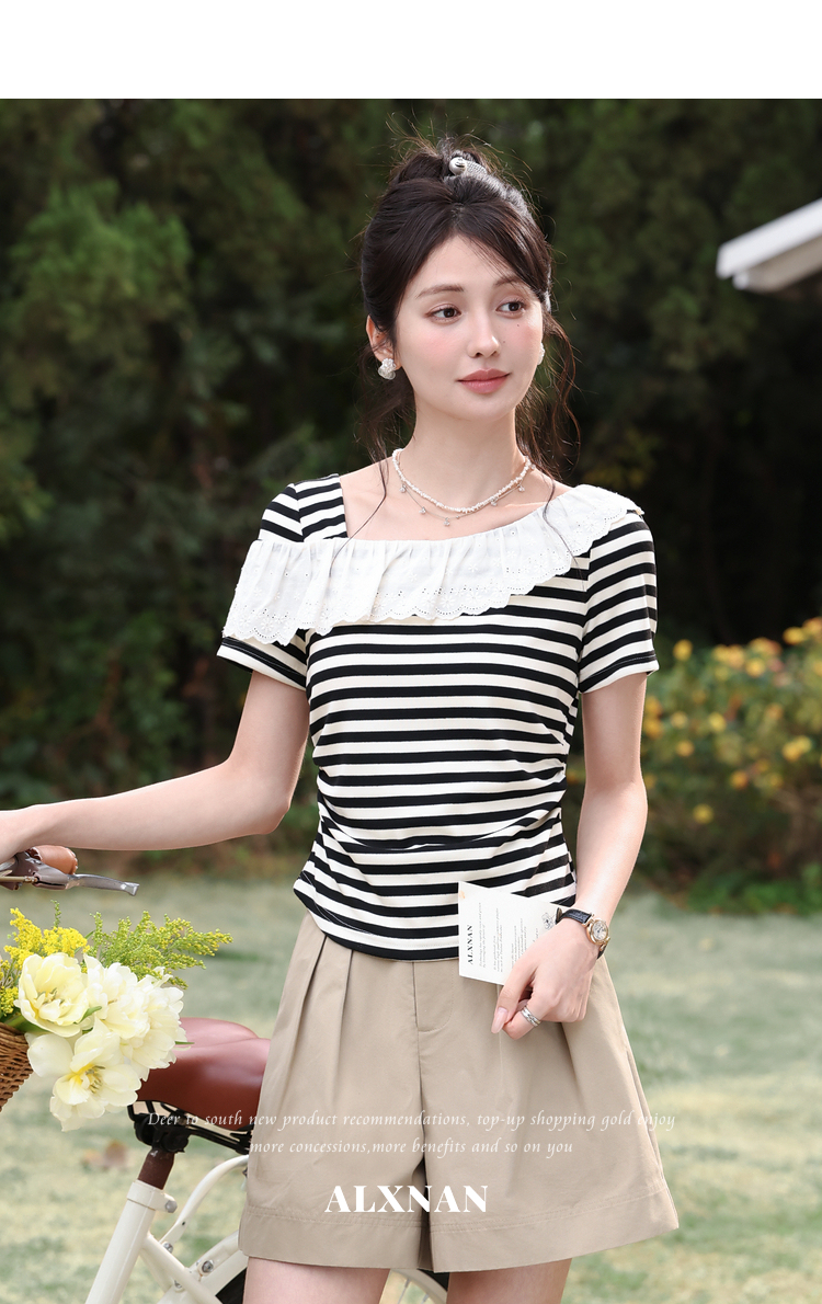 鹿向南「海上钢琴」设计感杏底黑条纹短袖T恤女夏季掐腰显瘦上衣