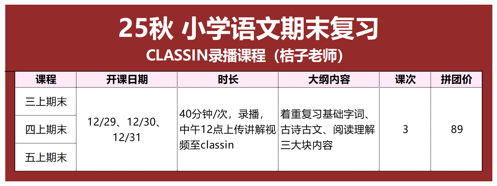 录播课,老师会在12月29日、12月30日、12月31日 中午12点左右上传录播讲解视频,视频时长40分钟,学生可自行安排时间上classin观看并做题。