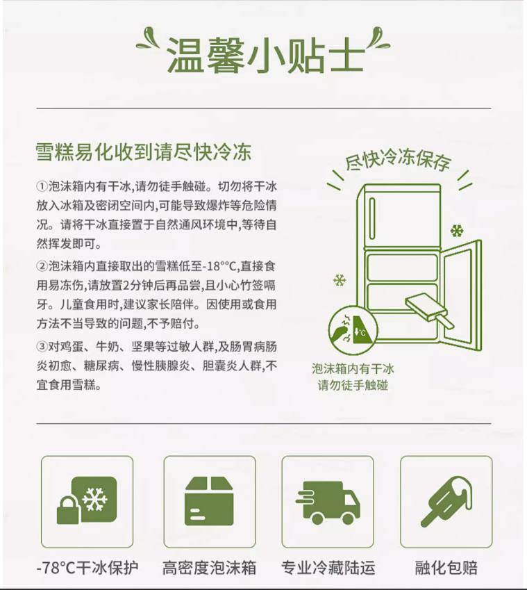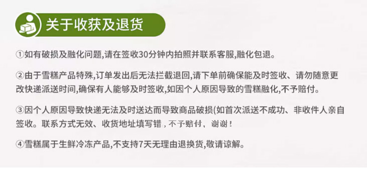 3、首次派送不成功、非收件人亲自签收、联系方式无效、拒收、改签等情况不支持赔付,造成的损失需要自行承担;雪糕属于生鲜冷冻产品,不支持7天无理由退换货,望谅解!