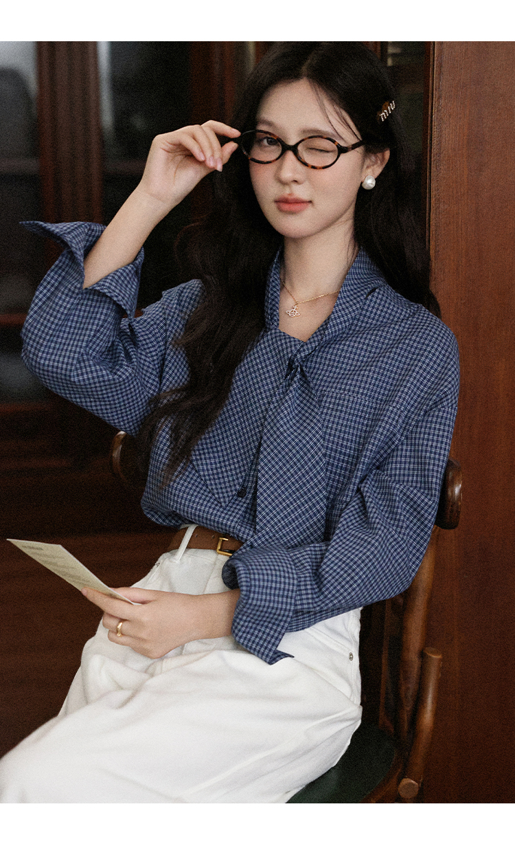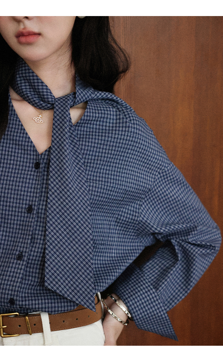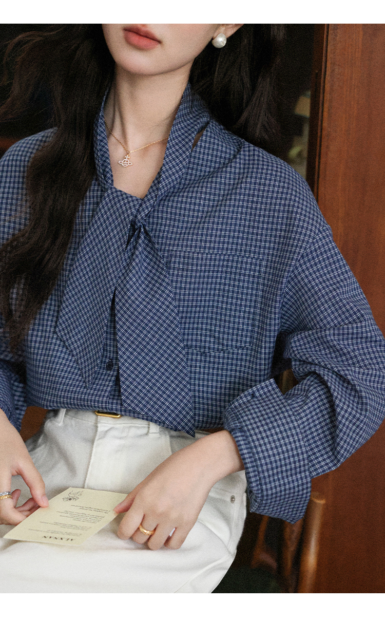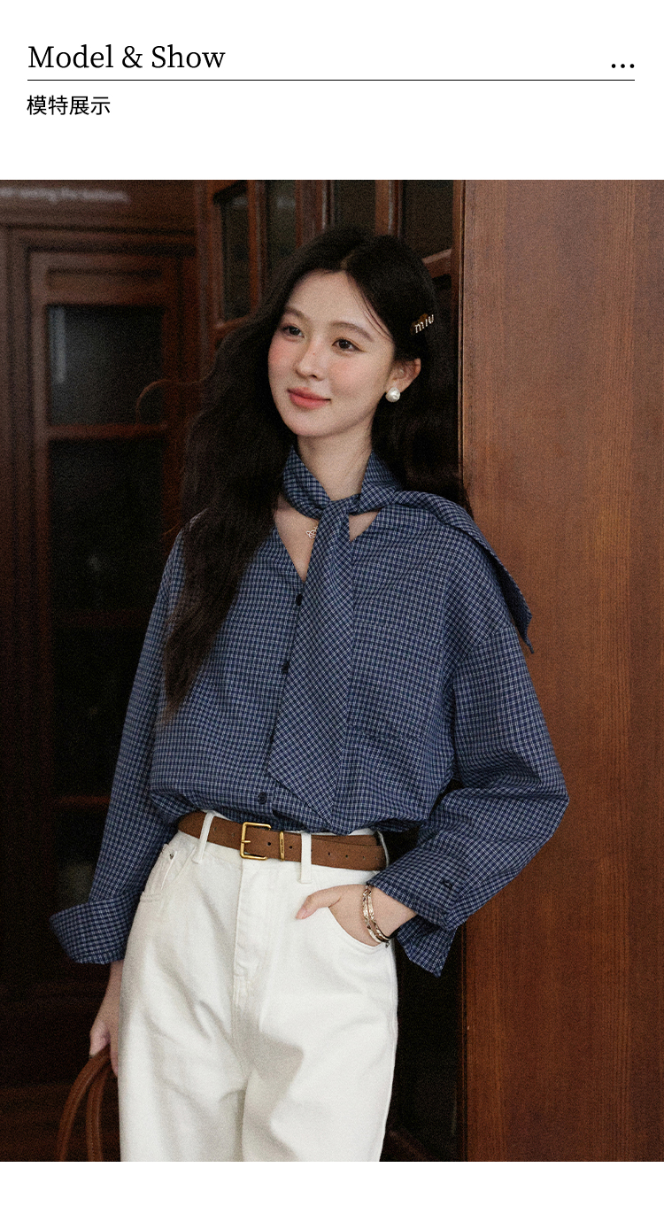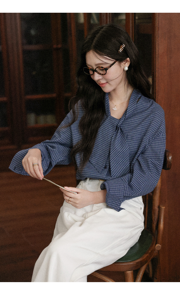 鹿向南「松露秘语」蓝色格子V领衬衫女初秋气质法式宽松显瘦上衣