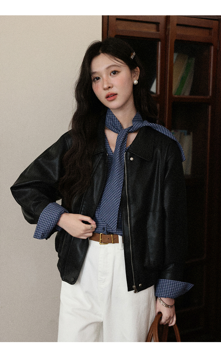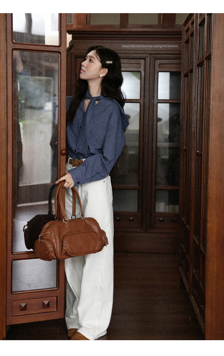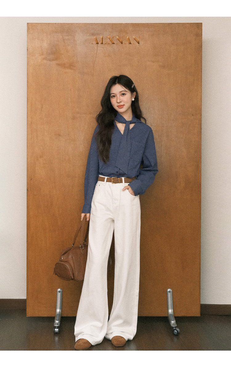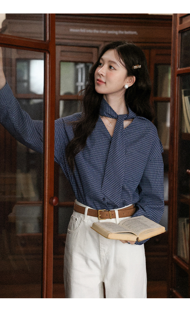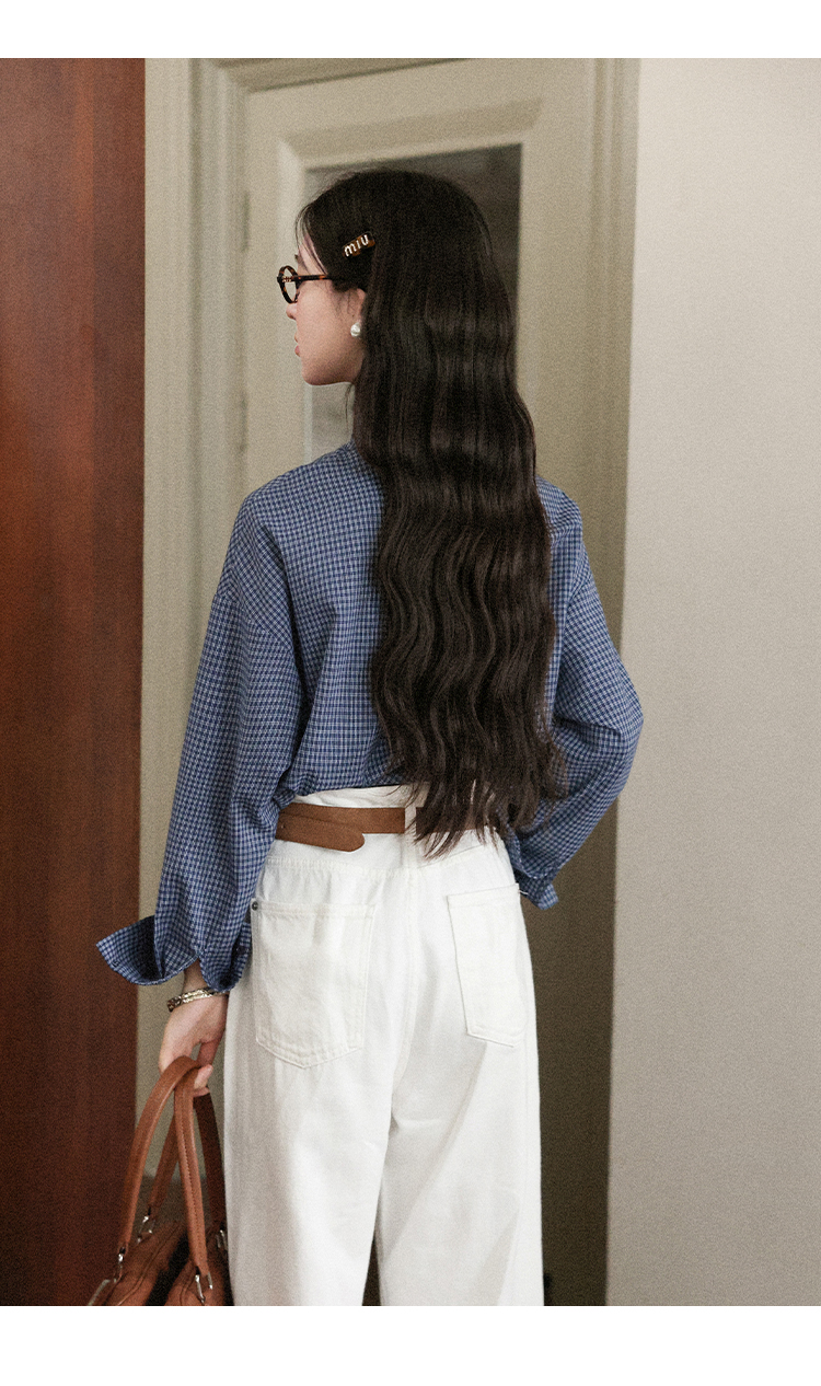 鹿向南「松露秘语」蓝色格子V领衬衫女初秋气质法式宽松显瘦上衣