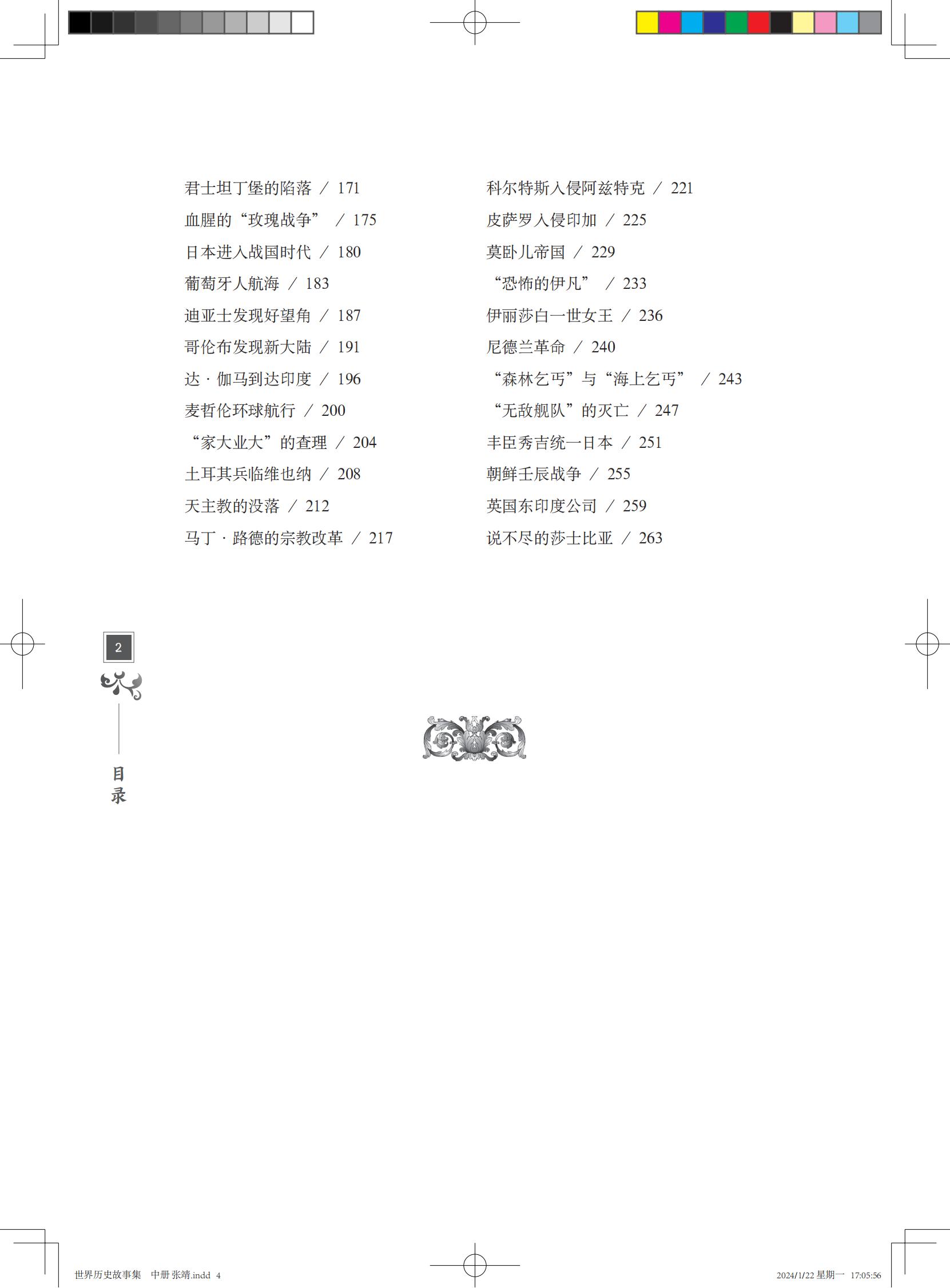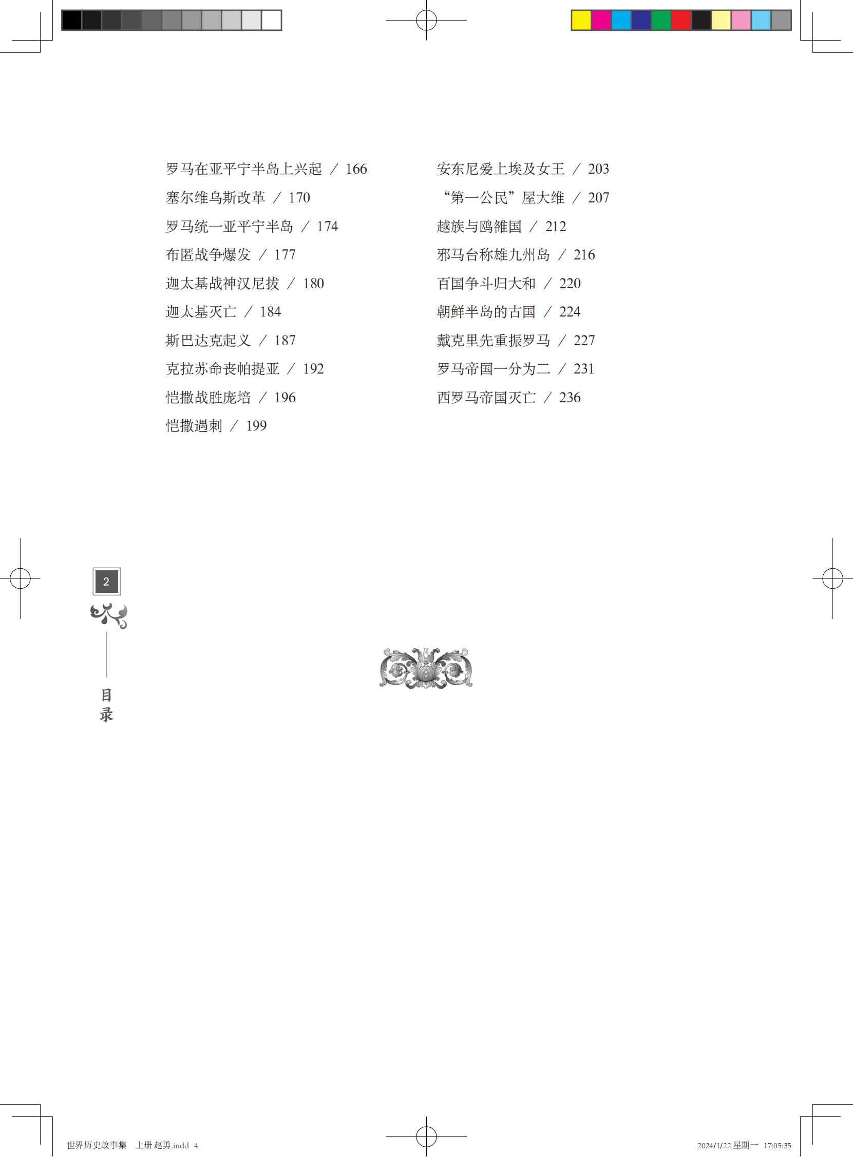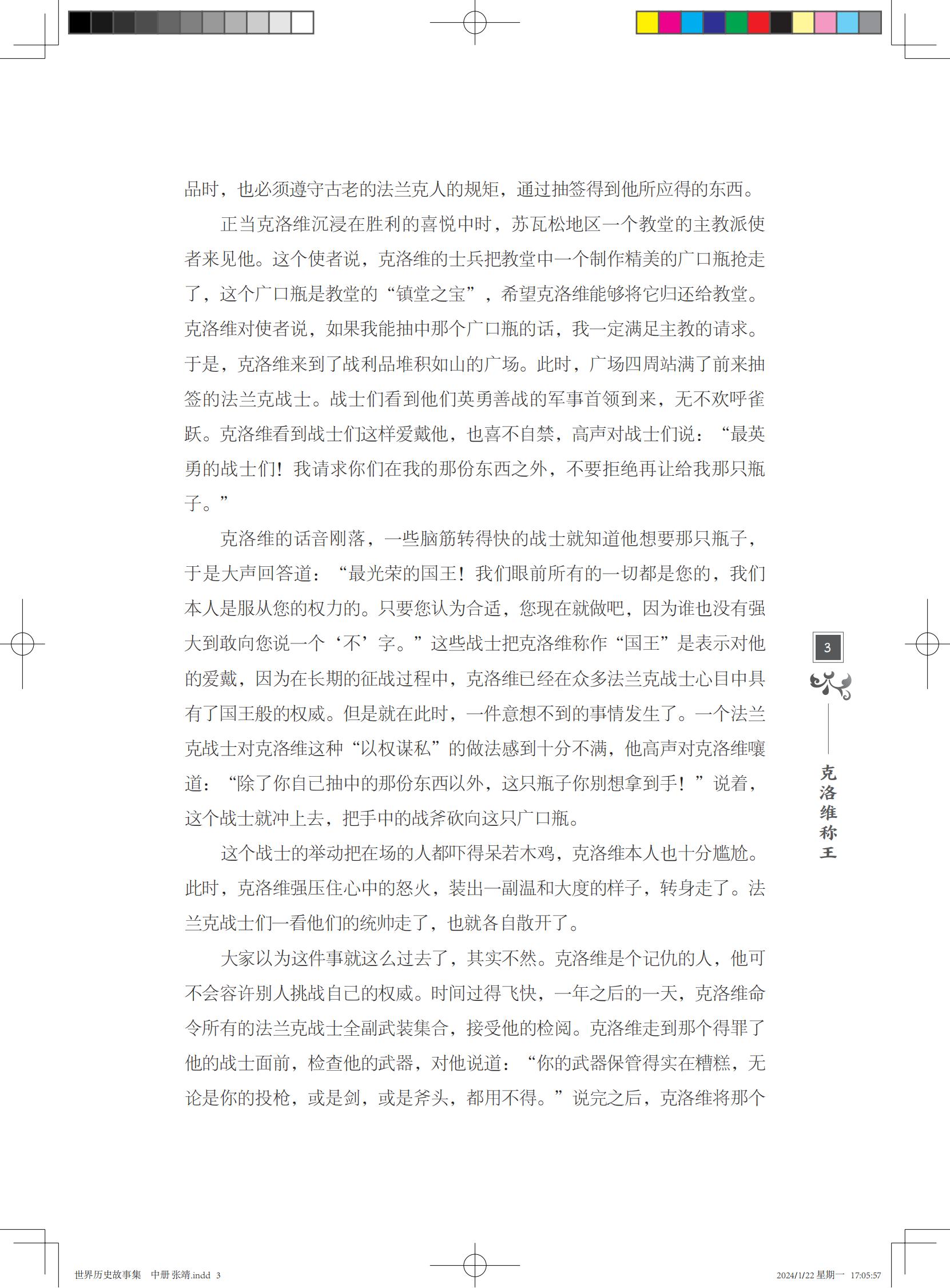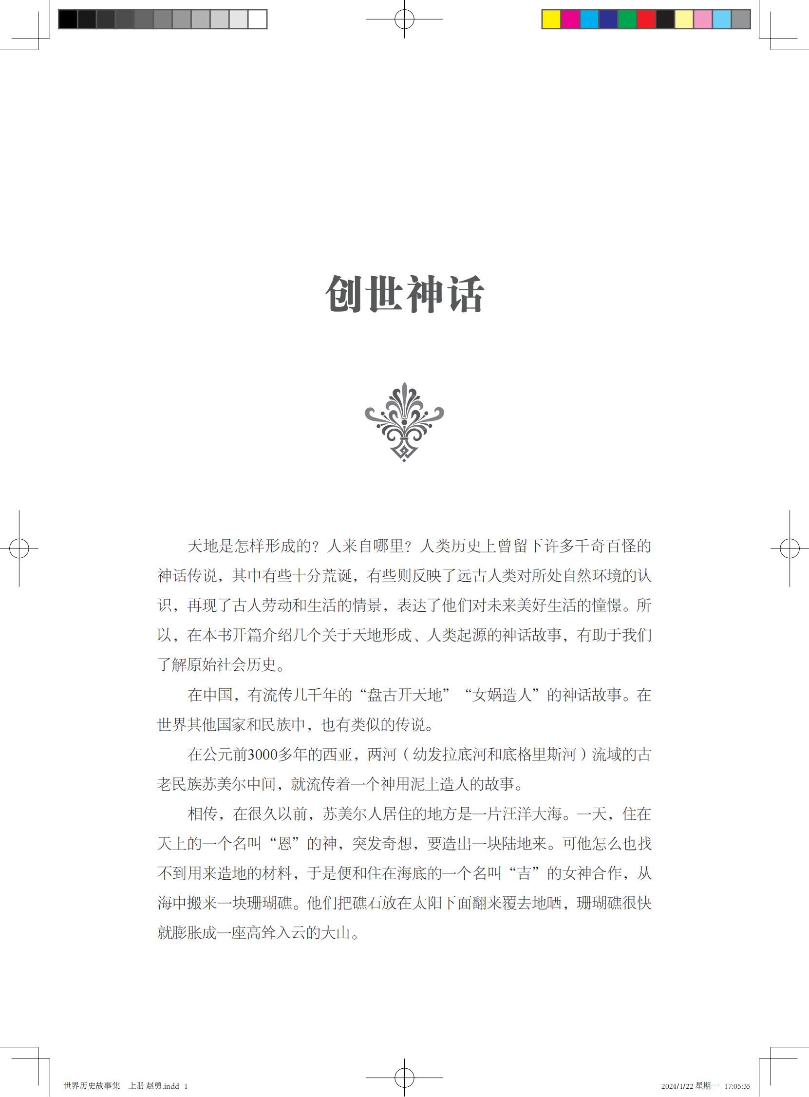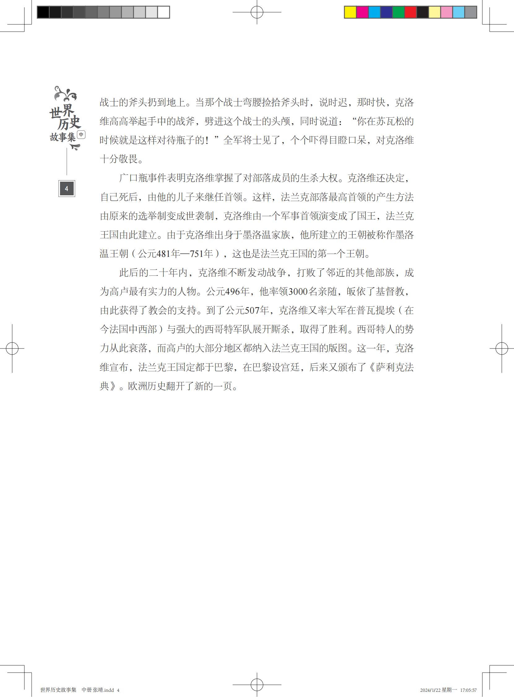《世界历史故事集》是在我社四卷本《世界通史故事》基础上精选而成的,共三卷,232个故事。本书从远古时代开始讲起,一直讲到“二战”结束,包括世界各主要文明体、主要国家,在各个年代发生的重大事件、科技和文化上的重大进步、影响深远的历史人物等,语言流畅,叙事清楚。《世界历史故事集上》讲述从远古时代到公元5世纪的世界历史;《世界历史故事集中》讲述西罗马帝国灭亡之后,从克洛维建立法兰克王国至16世纪末约1100年的历史;《世界历史故事集下》讲述从英国资产阶级革命到1945年“二战”结束约300年的历史。