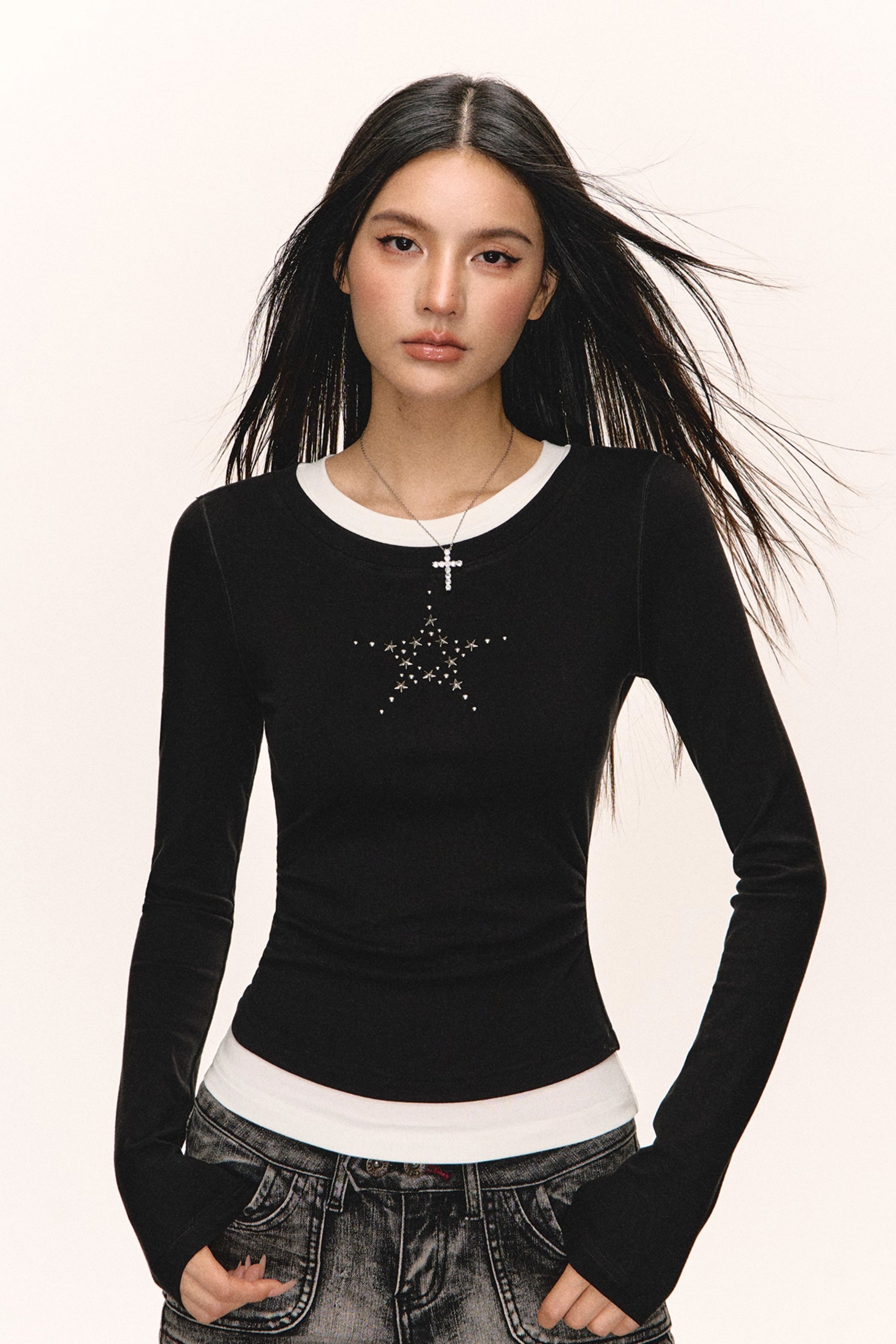 Ariseism美式复古设计感撞色长袖T恤女秋季新款修身打底上衣