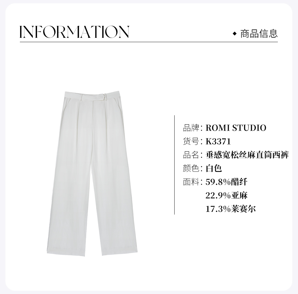 ROMI STUDIO“内外兼备"醋酸丝麻垂感宽松直筒奶白色直筒西裤K3371