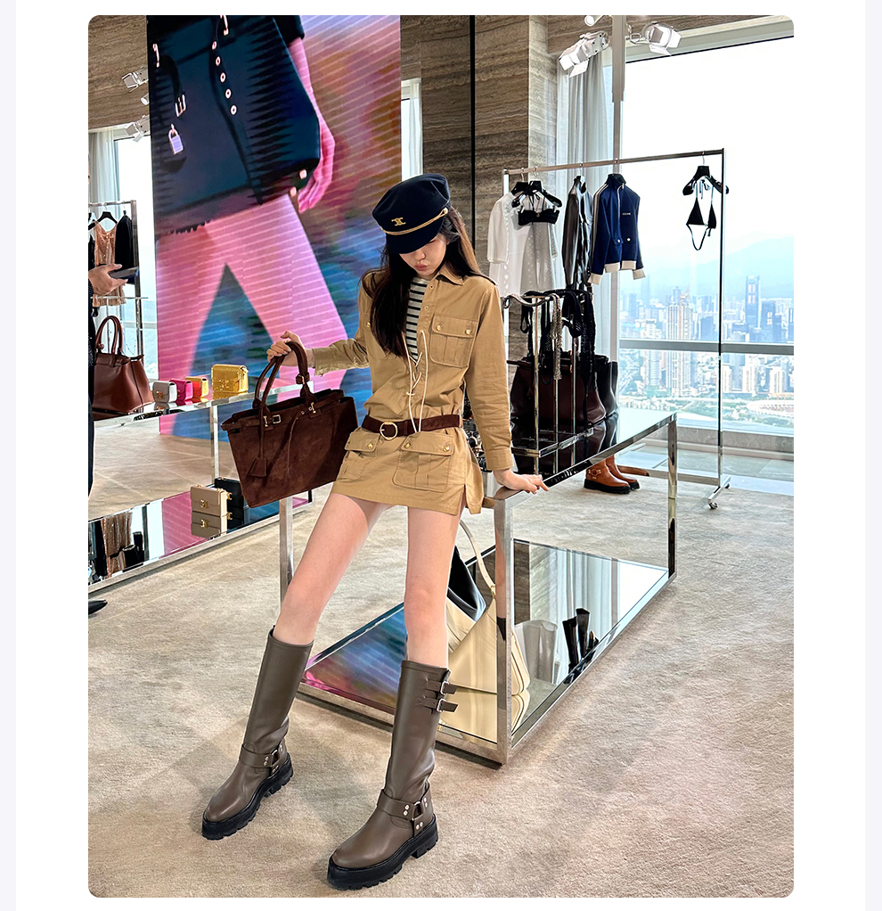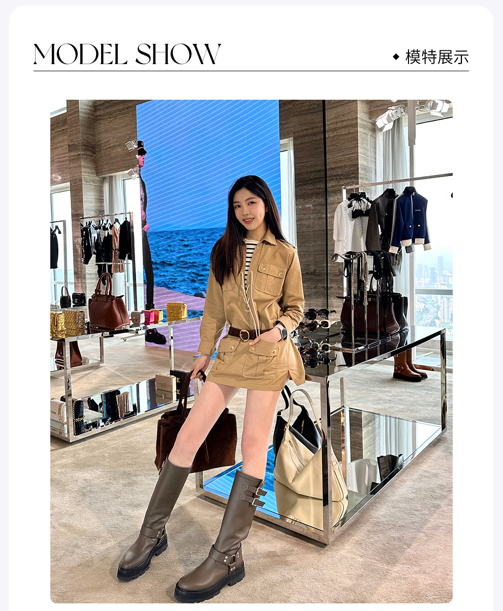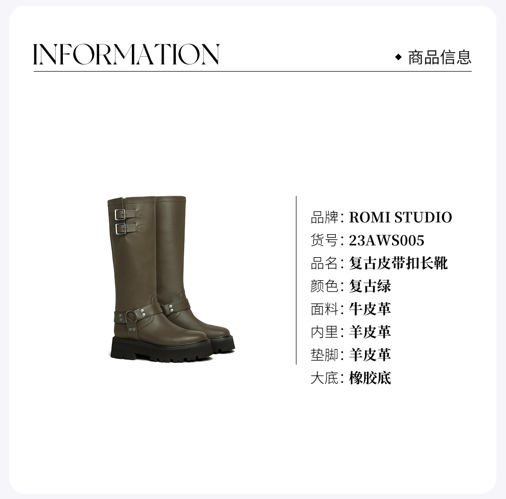 ROMI STUDIO“复古英伦”高定粗跟皮带扣复古绿不过膝长靴23AWS005