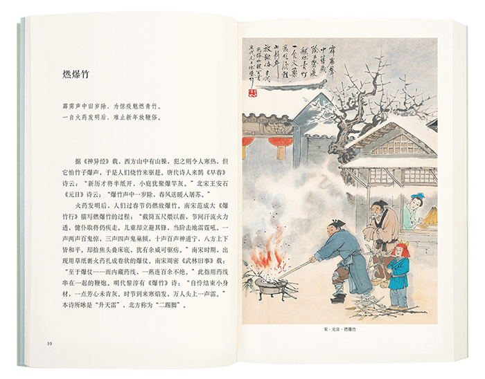 霹雳声中旧岁除,为惊疫魃燃青竹。 一自火yao发明后,难止新年放鞭俗。 据《神异经》载,西方山中有山臊,犯之则令人寒热,但它怕竹子爆声,于是人们烧竹来驱赶。唐代诗人来鹄《早春》诗云:“新历才将半纸开,小庭犹聚爆竿灰。”北宋王安石《元日》诗云:“爆竹声中一岁除,春风送暖入屠苏。” 火yao发明后,人们过春节仍燃放爆竹。南宋范成大《爆竹行》描写燃爆竹的过程:“截筒五尺煨以薪,节间汗流火力透,健仆取将仍疾走。儿童却立避其锋,当阶击地雷霆吼。一声两声百鬼惊,三声四声鬼巢倾,十声百声神道宁,八方上下皆和平。却拾焦头叠床底,犹有余威可驱疠。”南宋时期,出现用草纸裹火yao扎成卷状的爆仗。南宋周密《武林旧事》载:“至于爆仗……而内藏药线,一爇连百余不绝。”此指用药线串在一起的鞭炮。明代黎淳有《爆竹》诗:“自怜结束小身材,一点芳心未肯灰。时节到来寒焰发,万人头上一声雷。”本诗所咏是“升天雷”,北方称为“二踢脚”。 【图注】宋·元日·燃爆竹 内页展示: