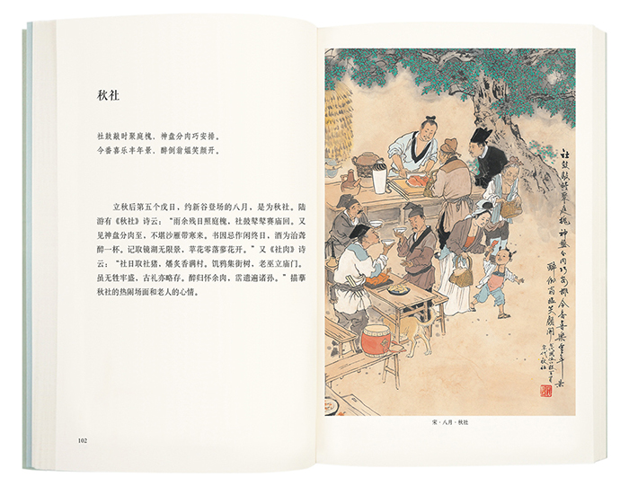 农家八月结秋社,敲鼓饮酒以祭祀社稷之神,感恩当年作物丰收。书中亦有相对应的春社习俗介绍。