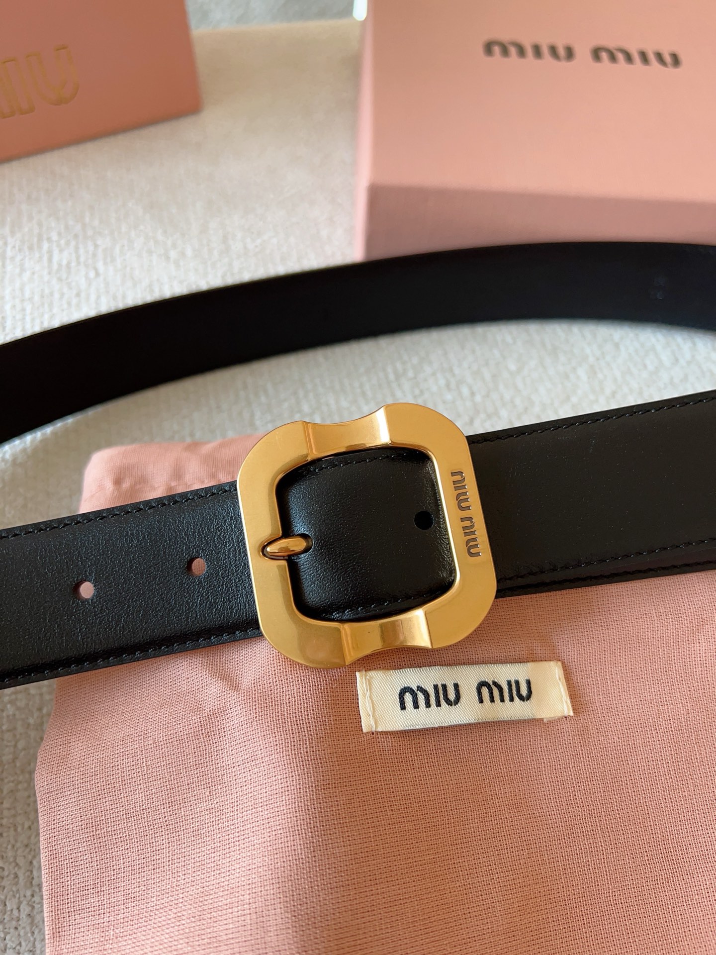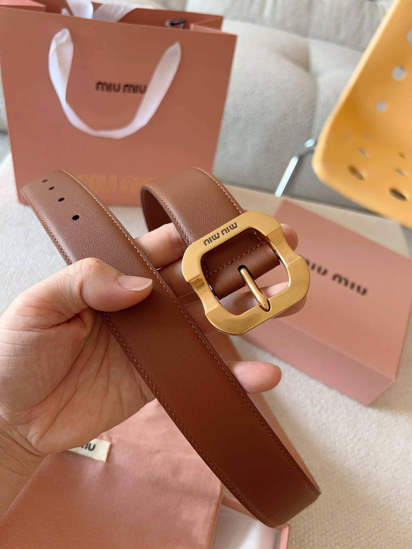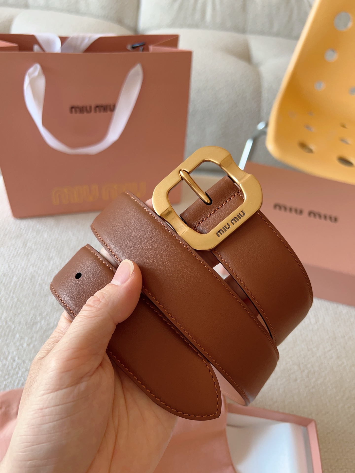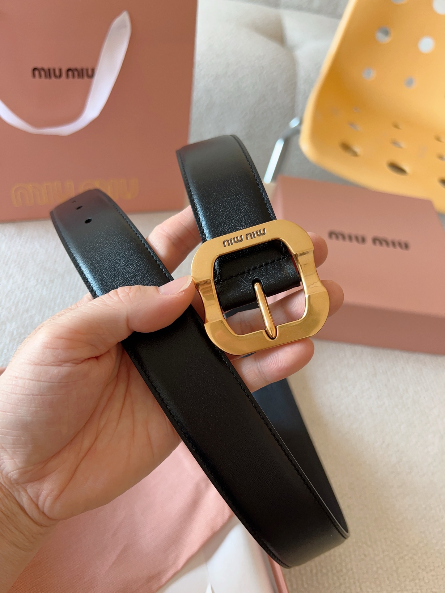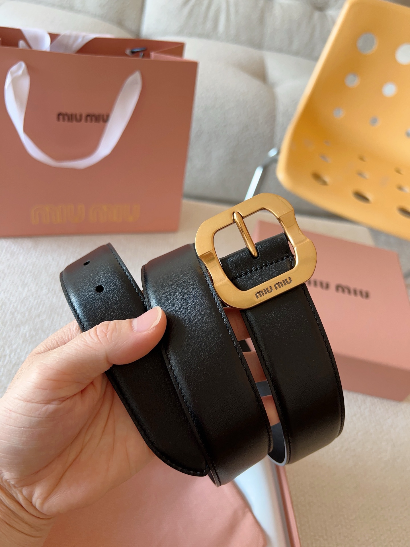 Miu Miu这款皮革腰带设计简约而优雅。金属搭扣饰以Miu Miu徽标,品牌格调一览无余。结合金属细节和标志性元素,彰显Miu Miu腰带的精致材质。百搭、实用、休闲、优雅,无论何种造型风格,均可轻松驾驭!皮带宽度:35mm