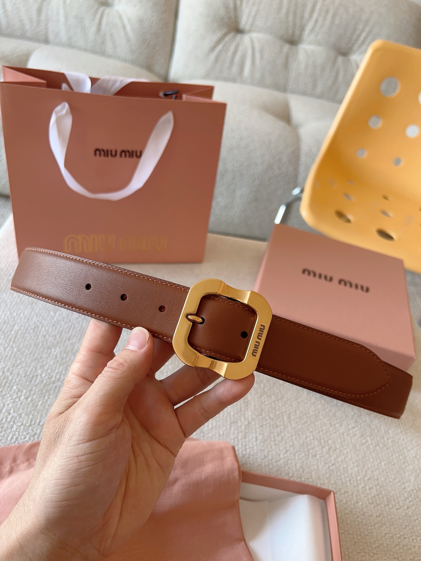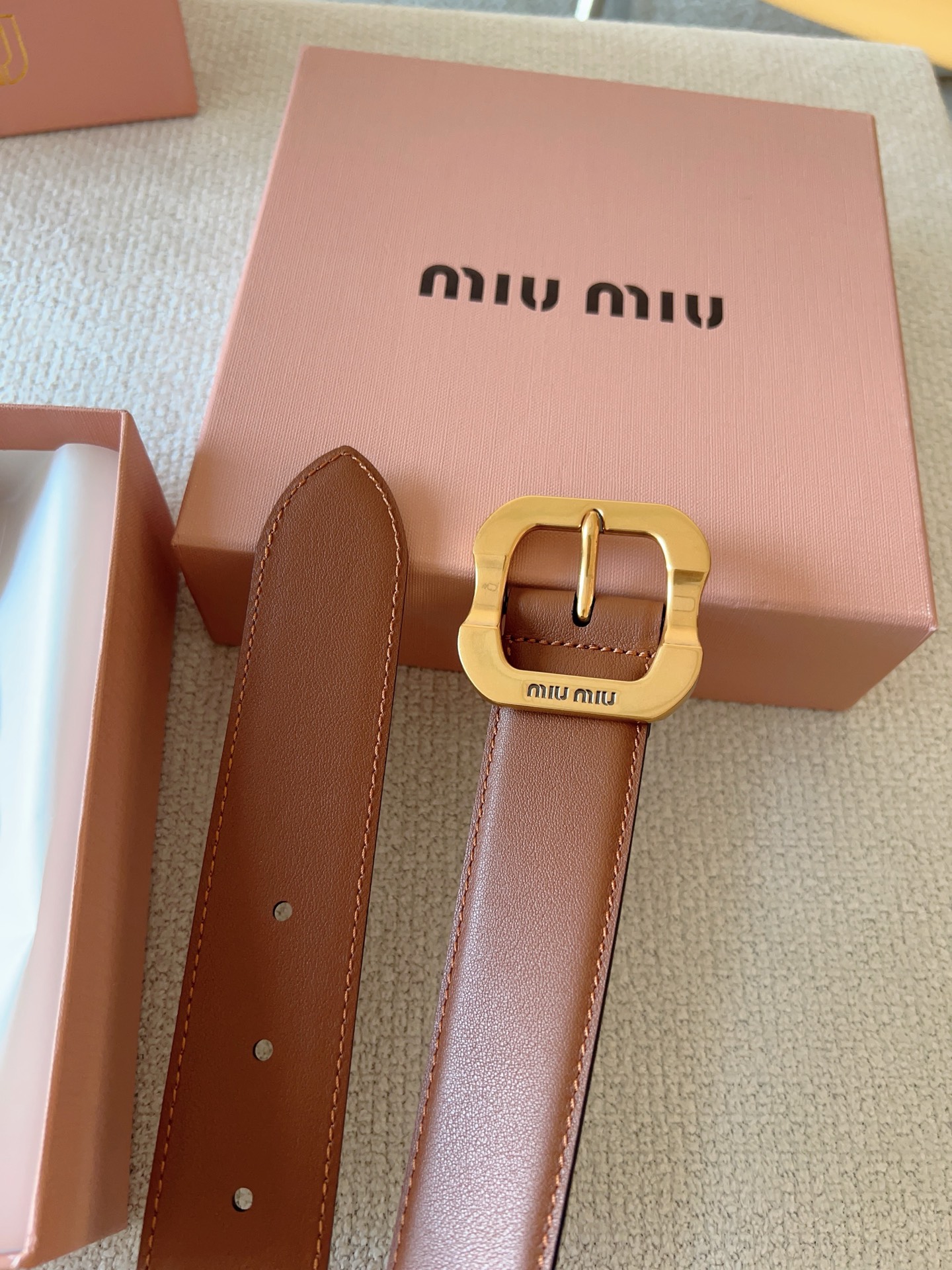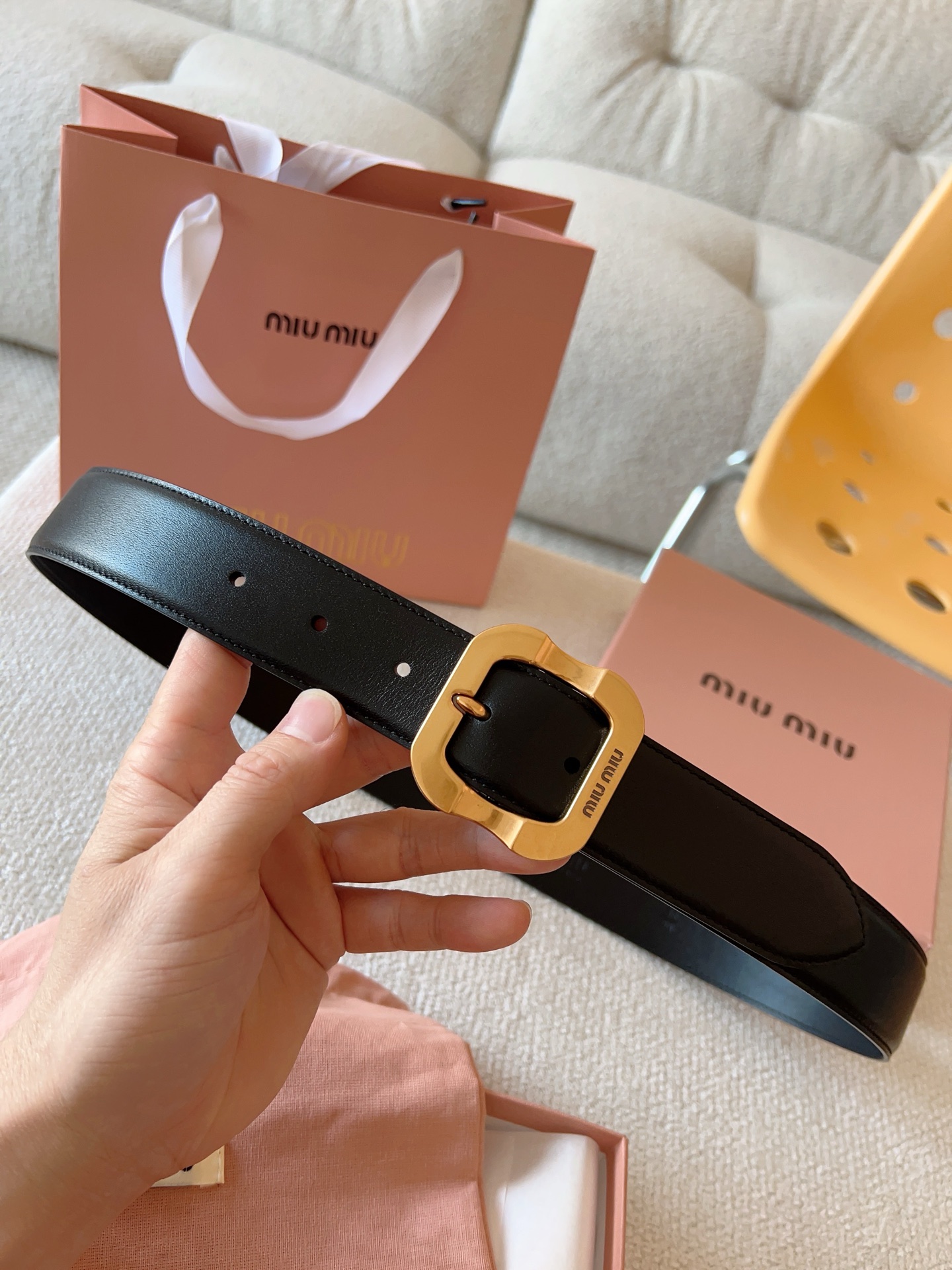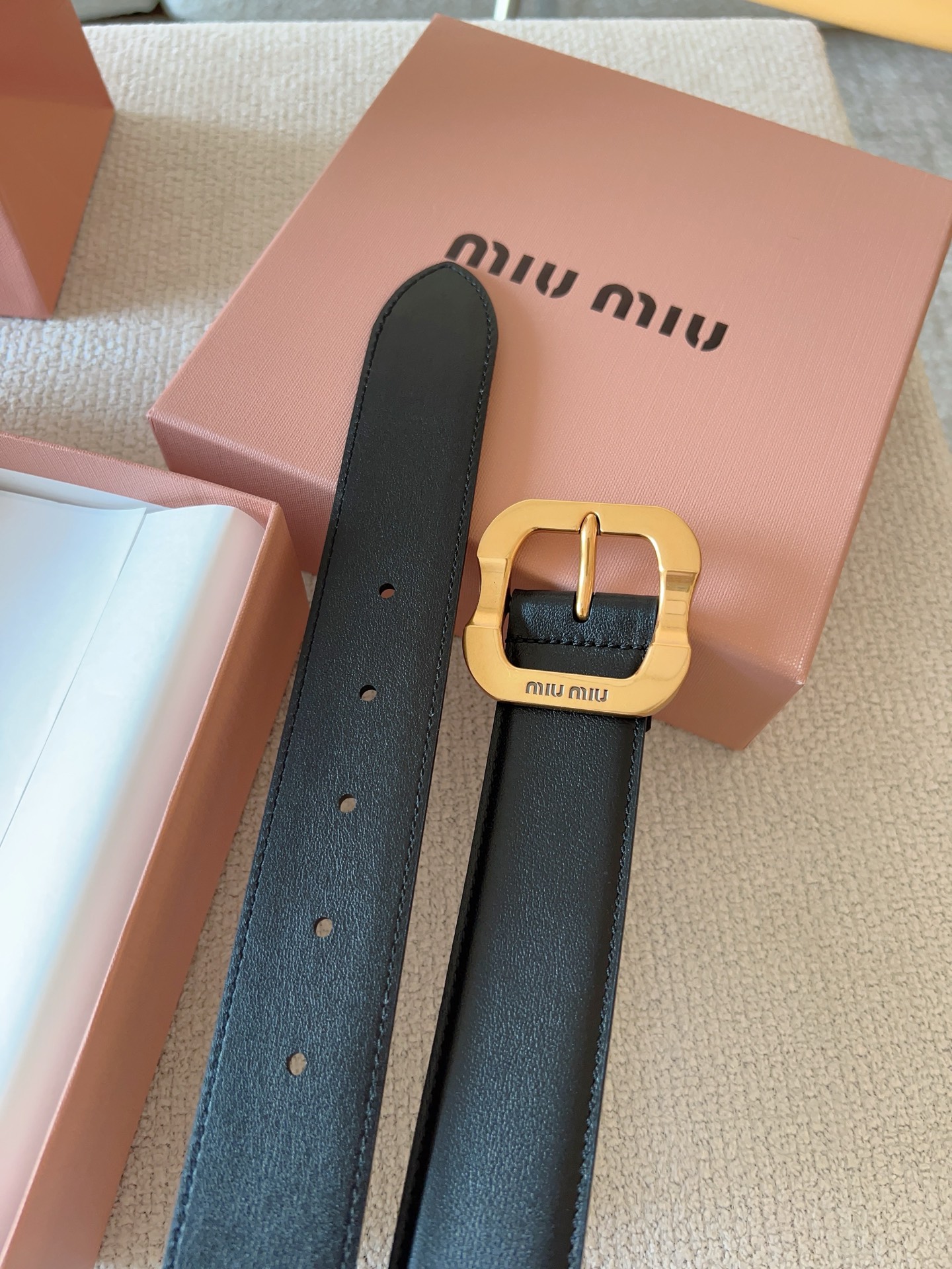 Miu Miu这款皮革腰带设计简约而优雅。金属搭扣饰以Miu Miu徽标,品牌格调一览无余。结合金属细节和标志性元素,彰显Miu Miu腰带的精致材质。百搭、实用、休闲、优雅,无论何种造型风格,均可轻松驾驭!皮带宽度:35mm