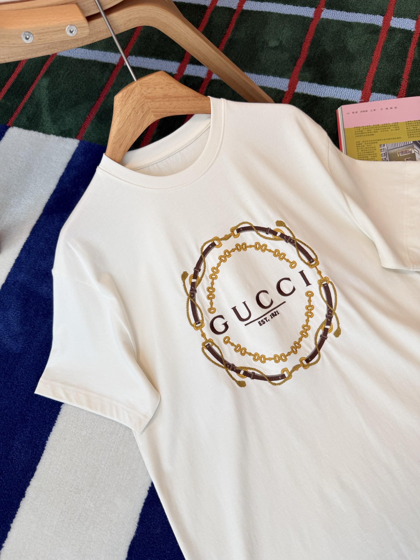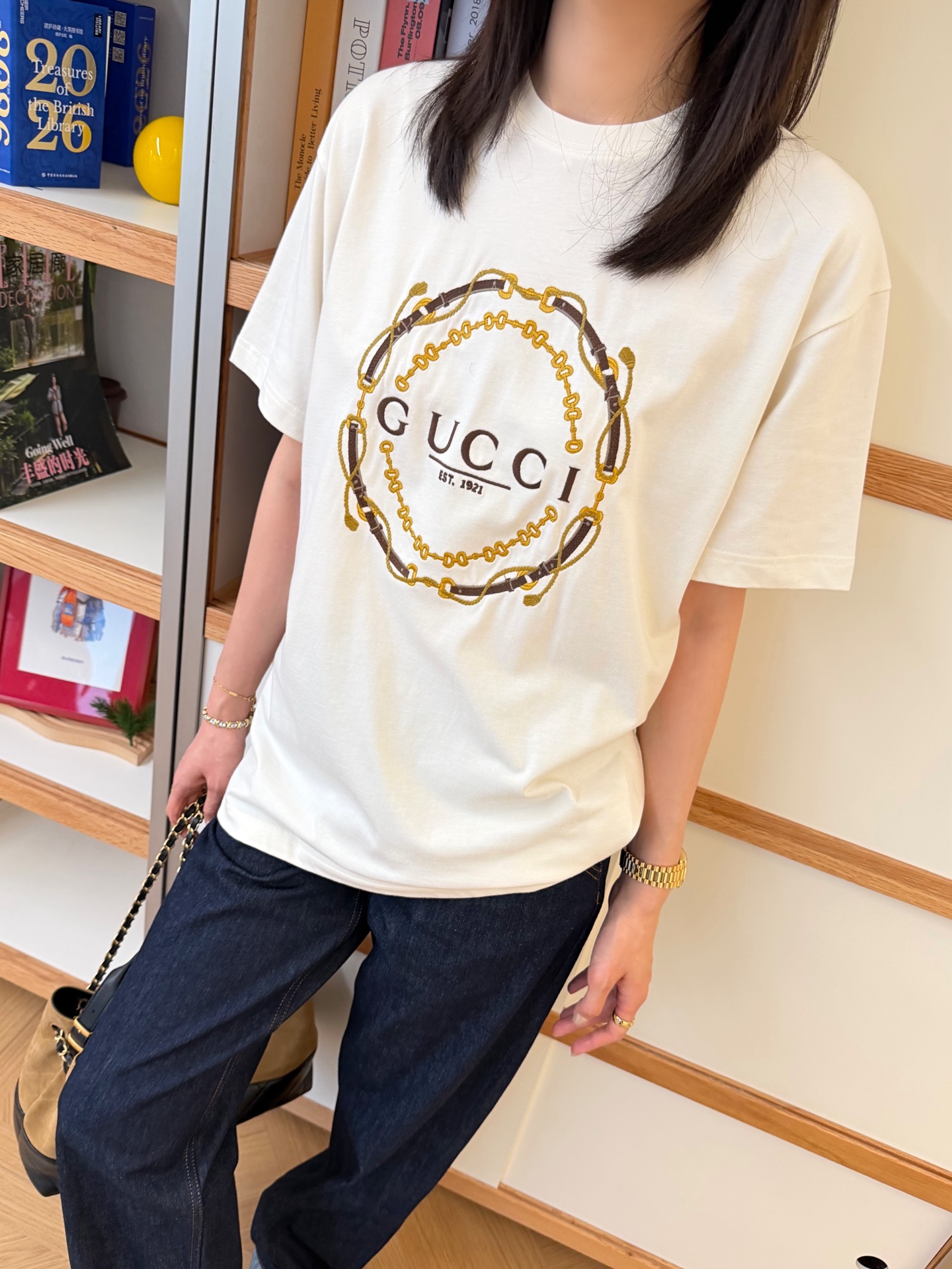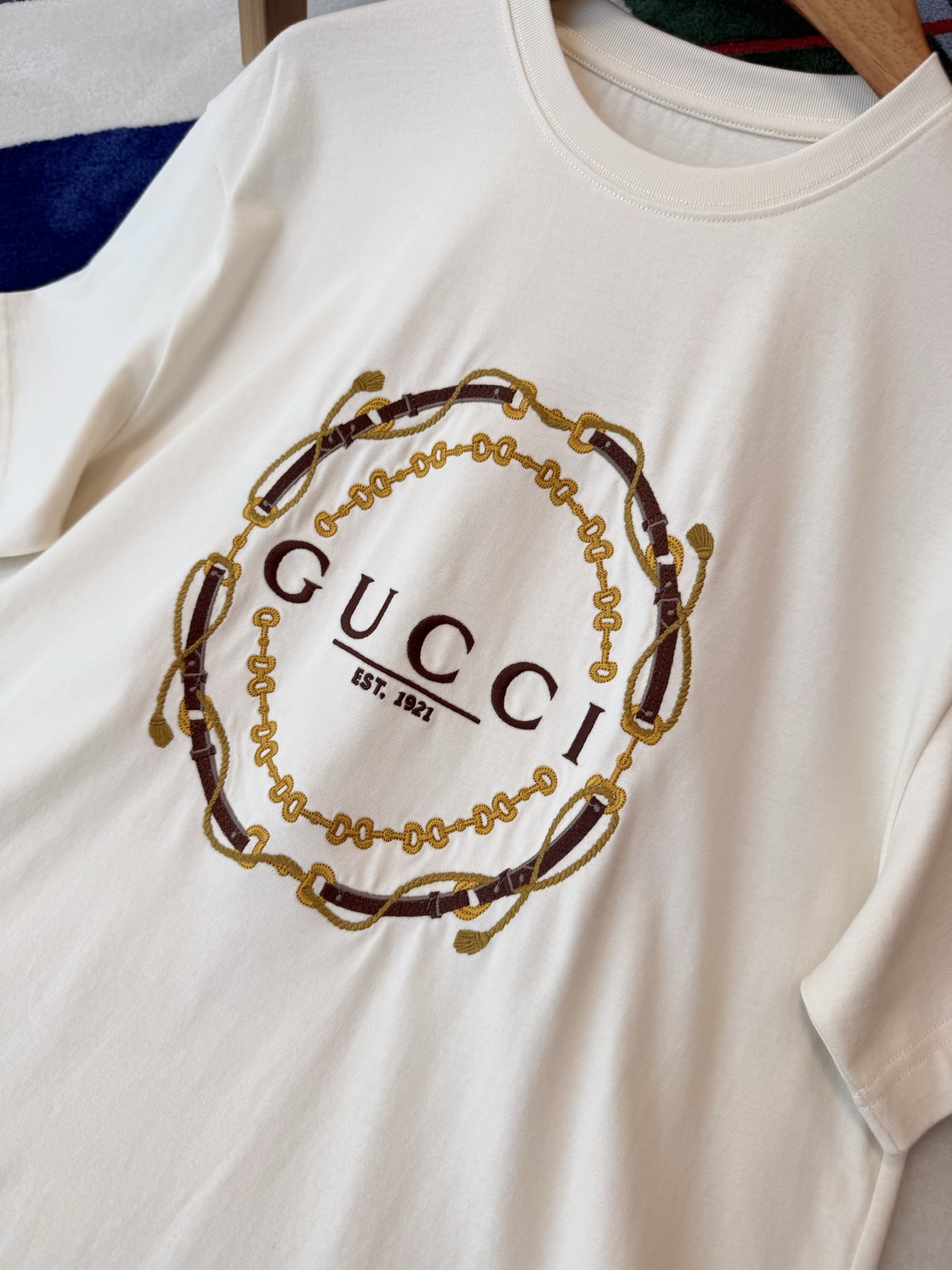 细节控必入的宝藏款〰️不是普通印花!胸前的刺绣才是灵魂✨金色链条+皮革纹理的重工刺绣,走线密实,光泽感拉满,摸上去有细腻的凹凸肌理,低调又自带辨识度🔜 简约干净的米白底色,把贵气感衬得刚刚好😎😎“经典即永恒”,经久不过时的设计非常值得入手🉑宽松版型对各种身材都友好,显瘦又藏肉,怎么穿都好看🥰