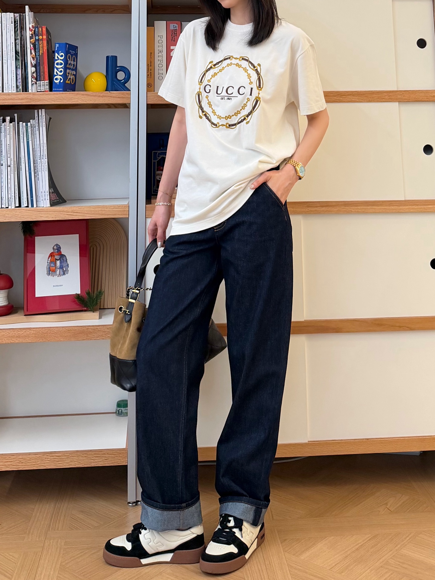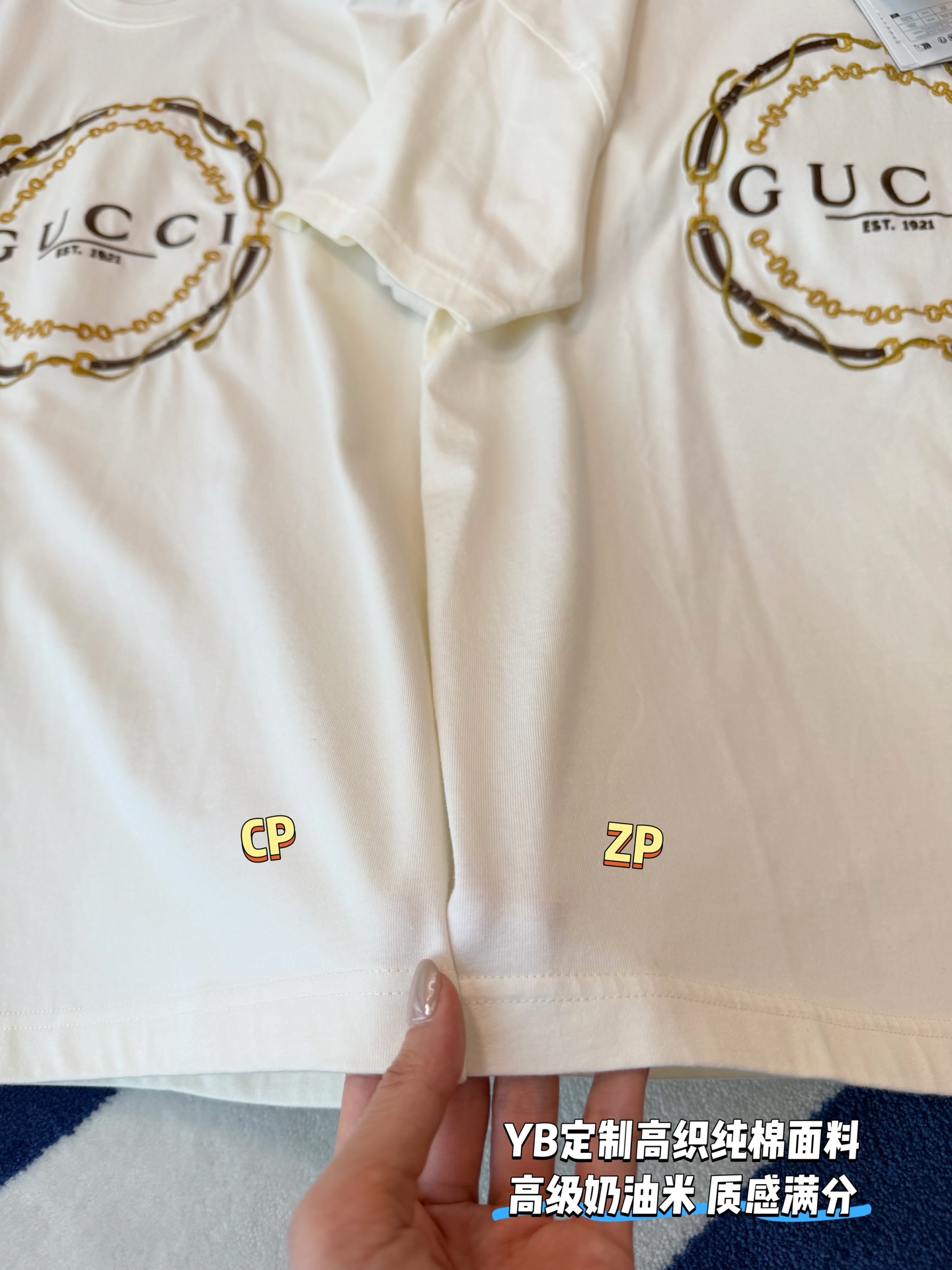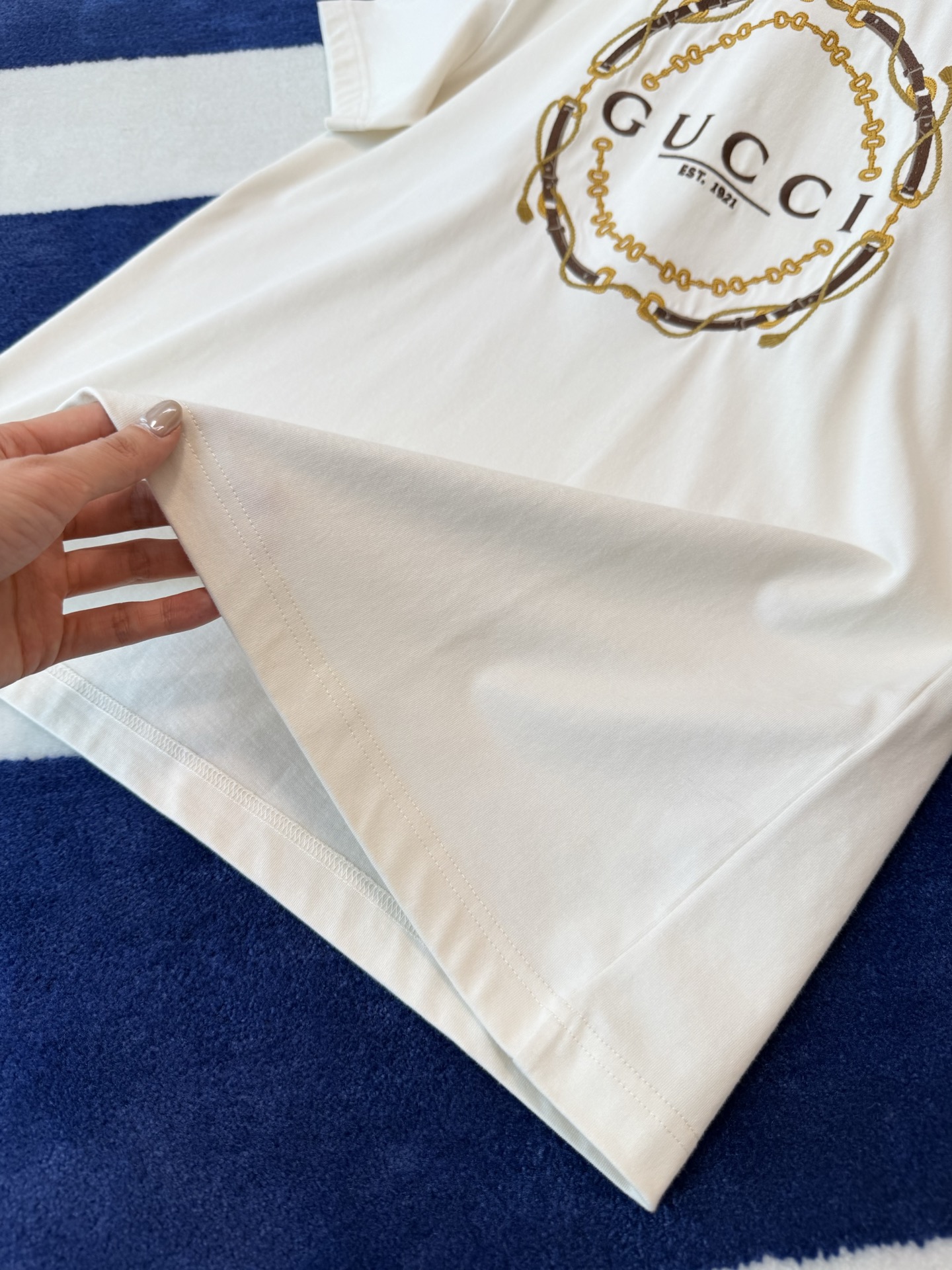 细节控必入的宝藏款〰️不是普通印花!胸前的刺绣才是灵魂✨金色链条+皮革纹理的重工刺绣,走线密实,光泽感拉满,摸上去有细腻的凹凸肌理,低调又自带辨识度🔜 简约干净的米白底色,把贵气感衬得刚刚好😎😎“经典即永恒”,经久不过时的设计非常值得入手🉑宽松版型对各种身材都友好,显瘦又藏肉,怎么穿都好看🥰