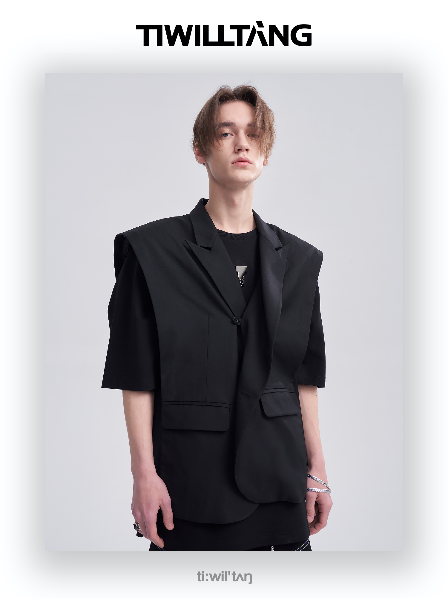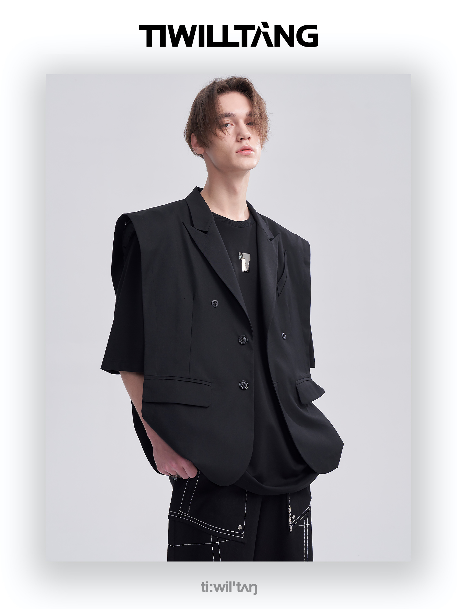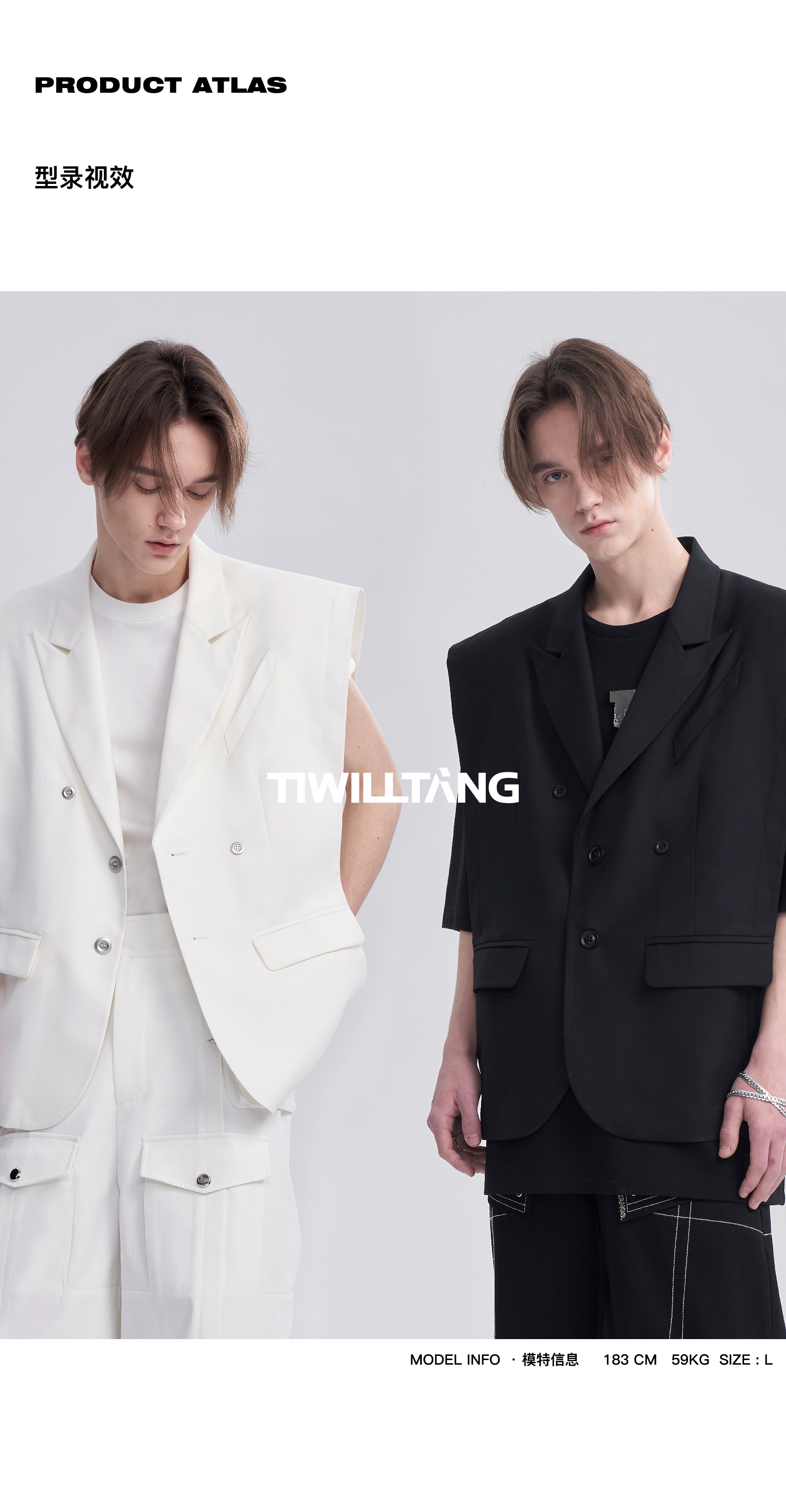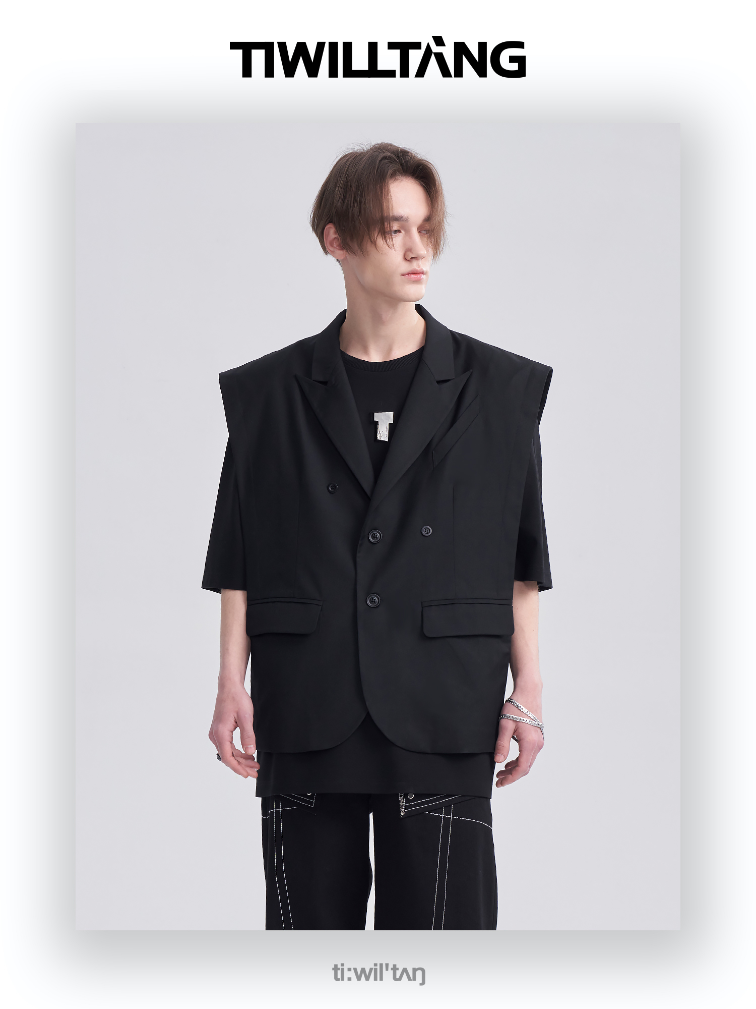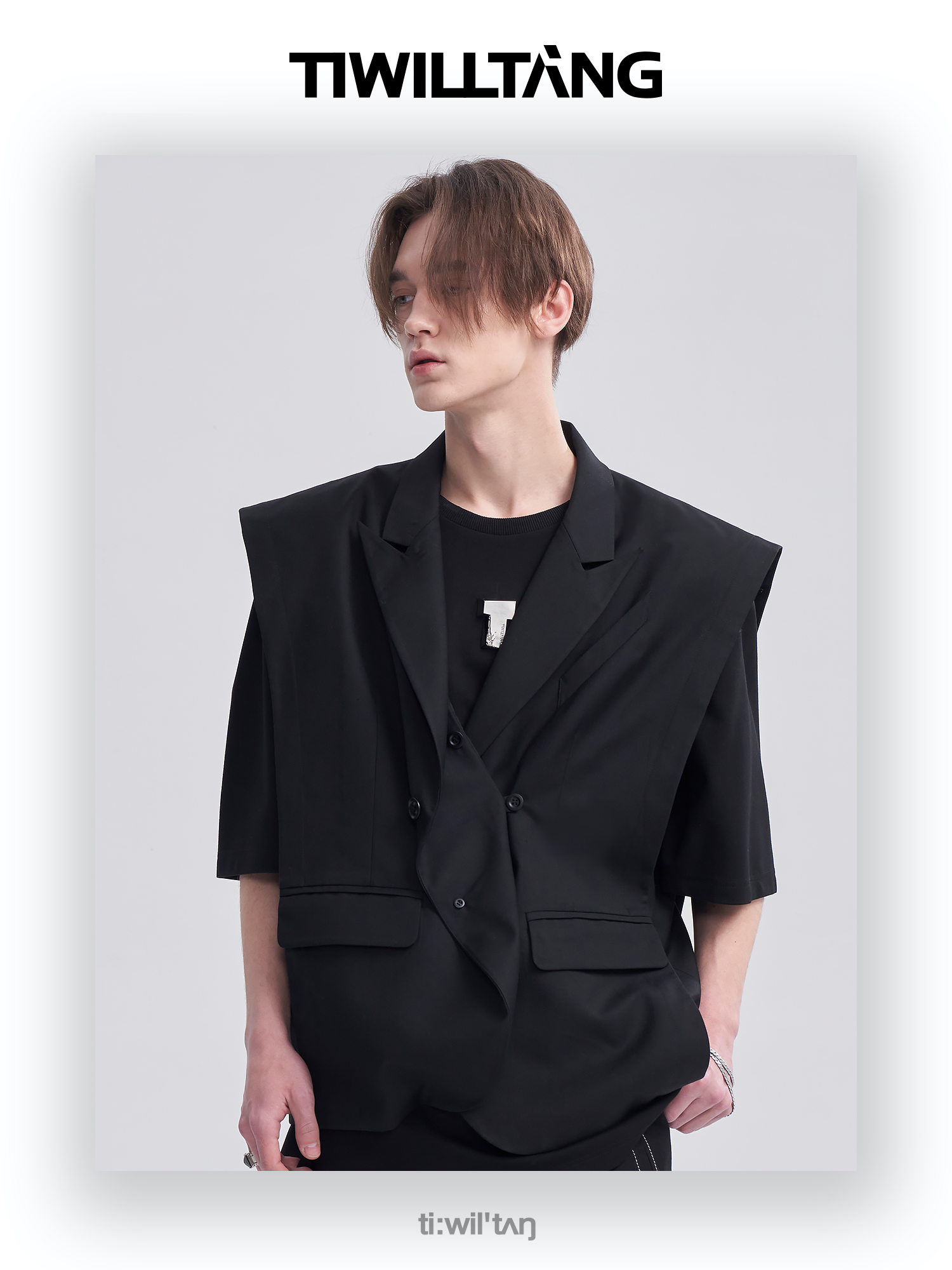 TIWILLTANG启世录“高觉”多层次门襟马甲黑白纯色无袖西装外套男