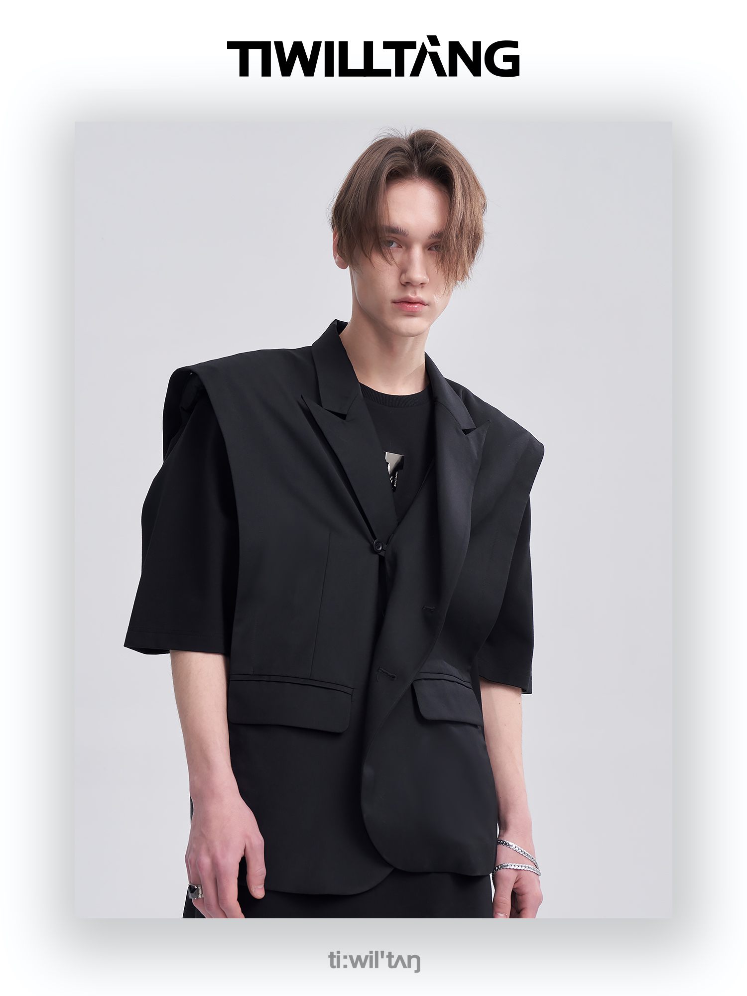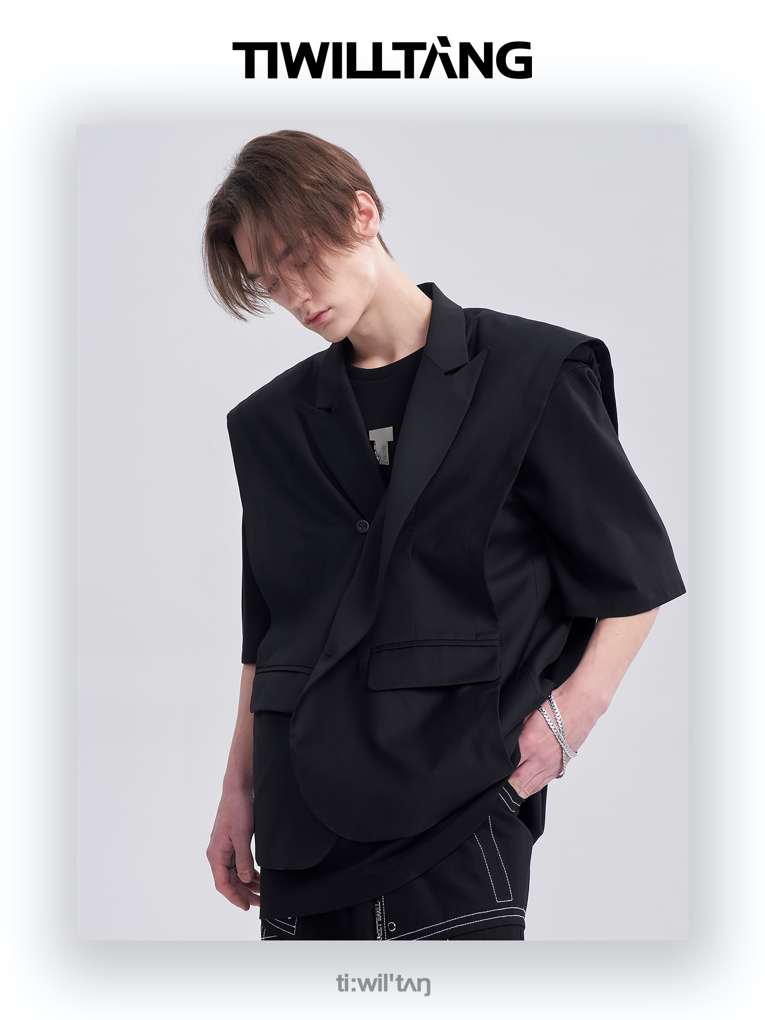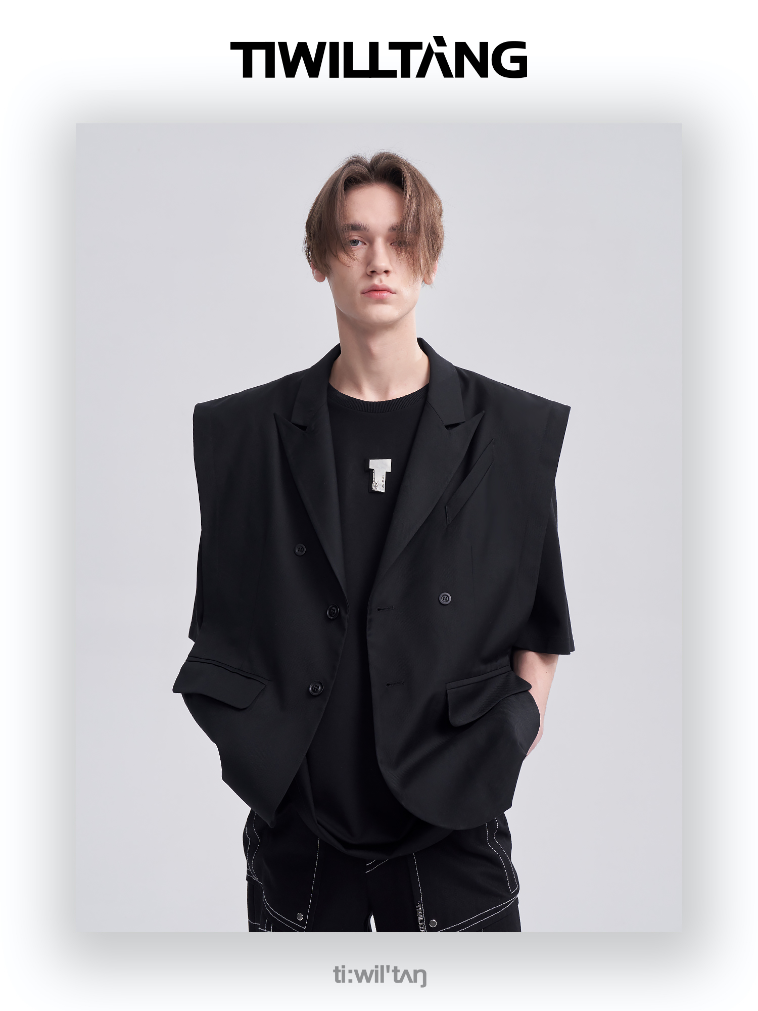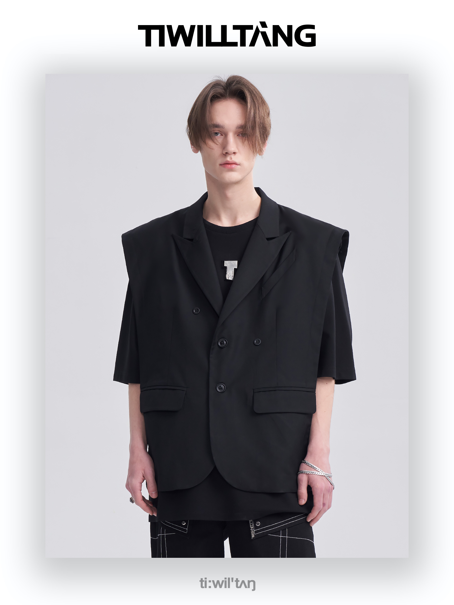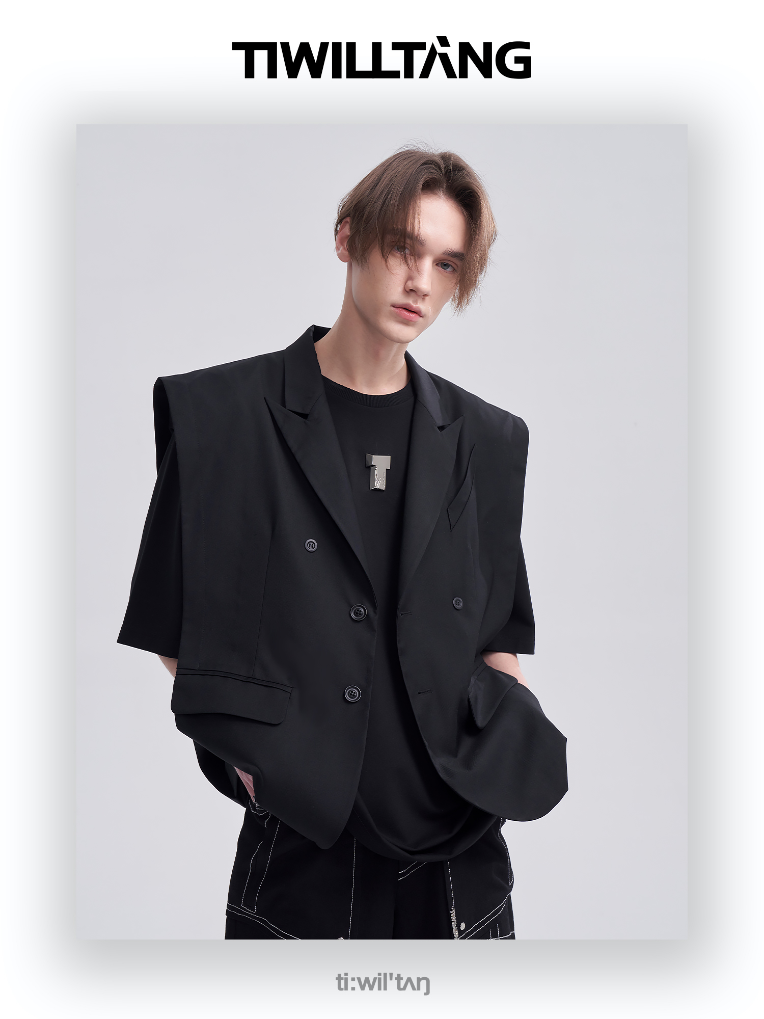 TIWILLTANG启世录“高觉”多层次门襟马甲黑白纯色无袖西装外套男