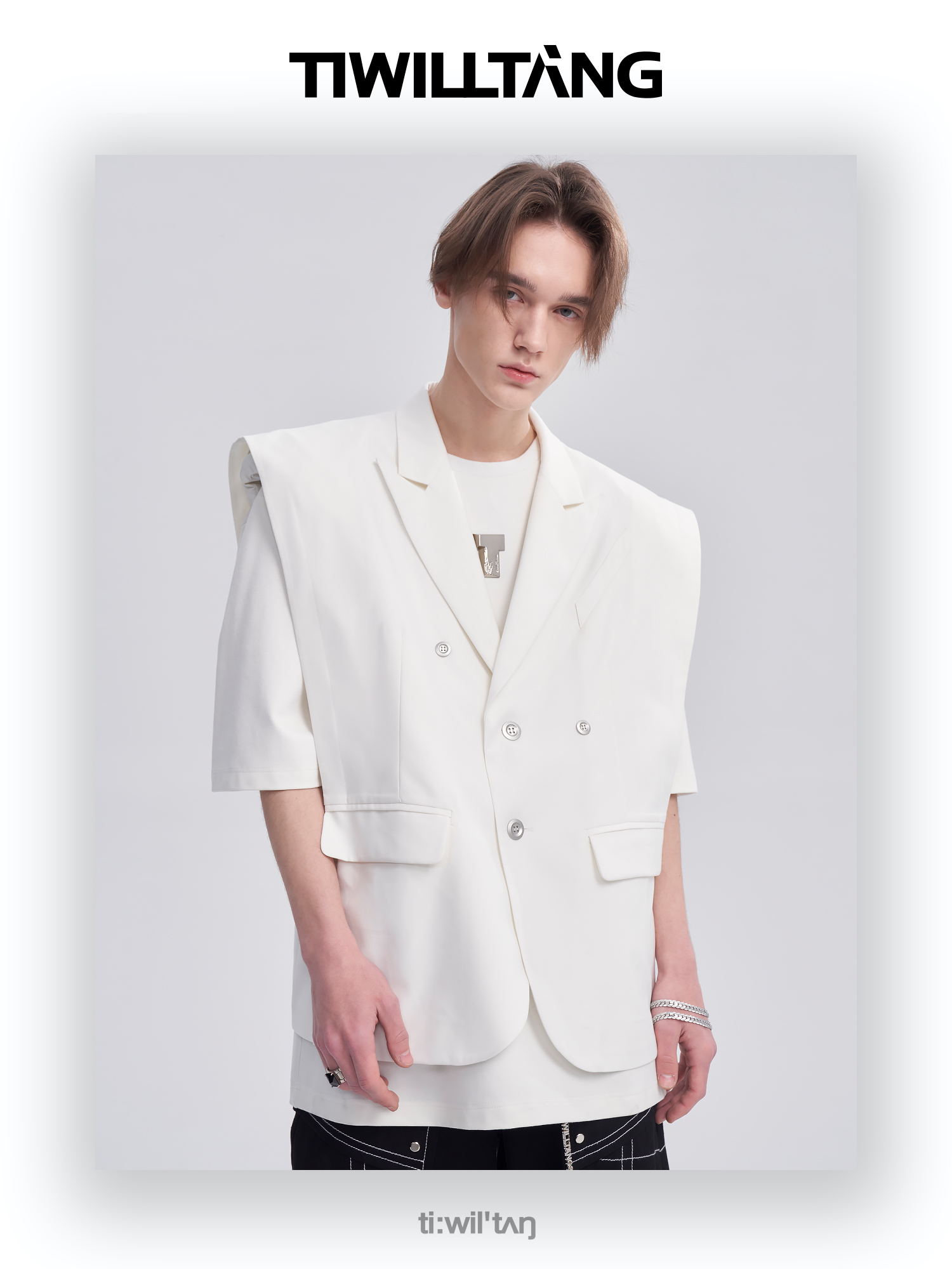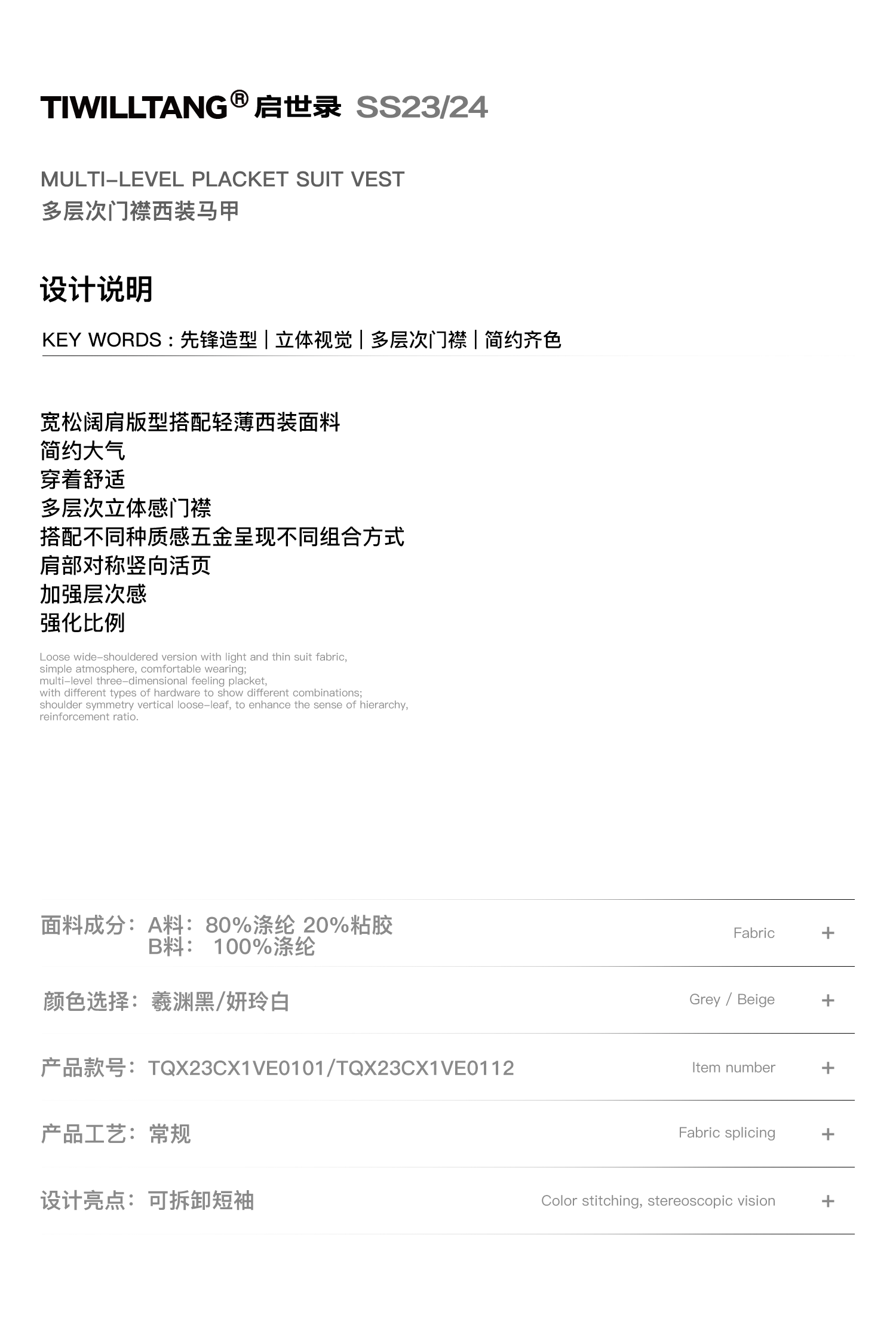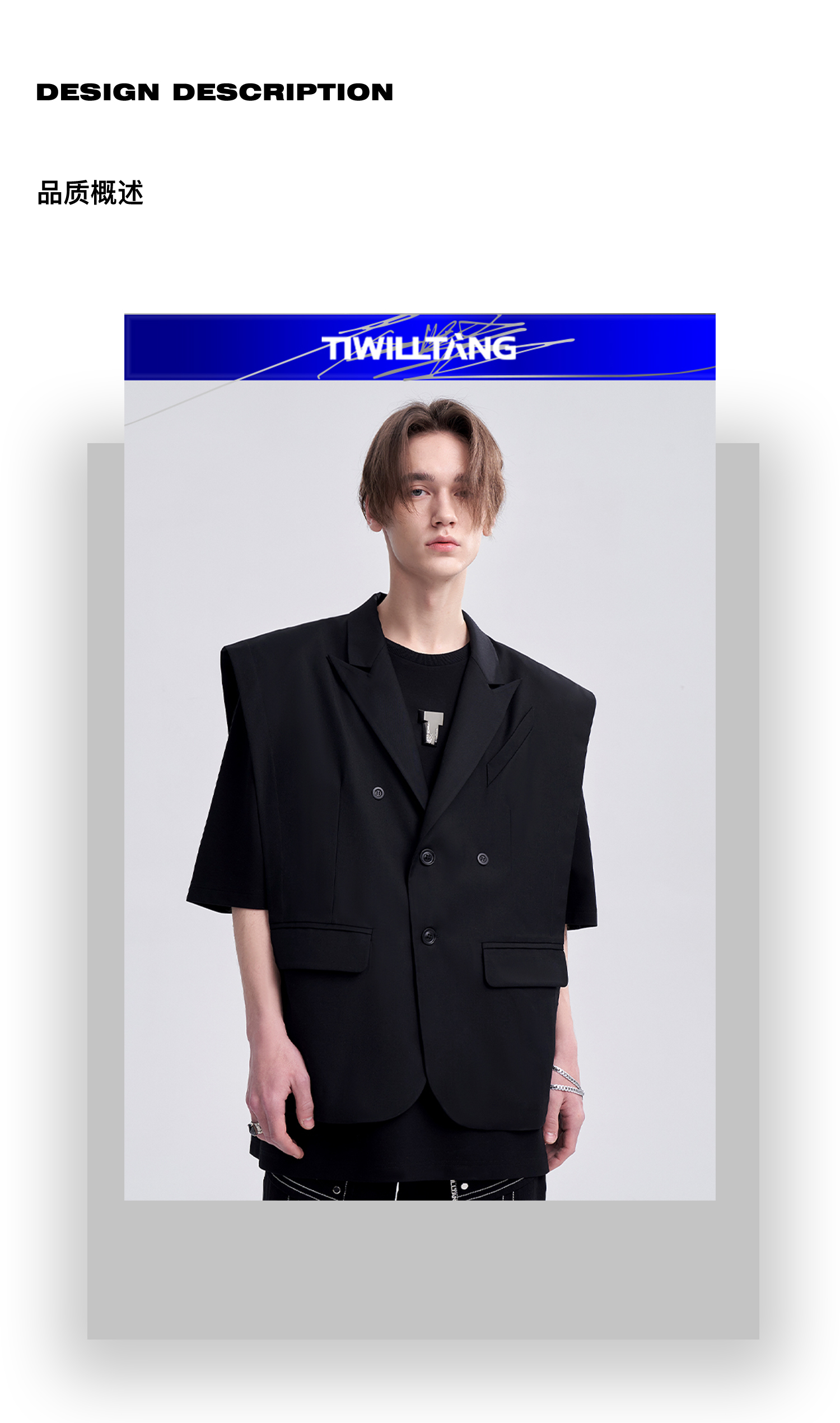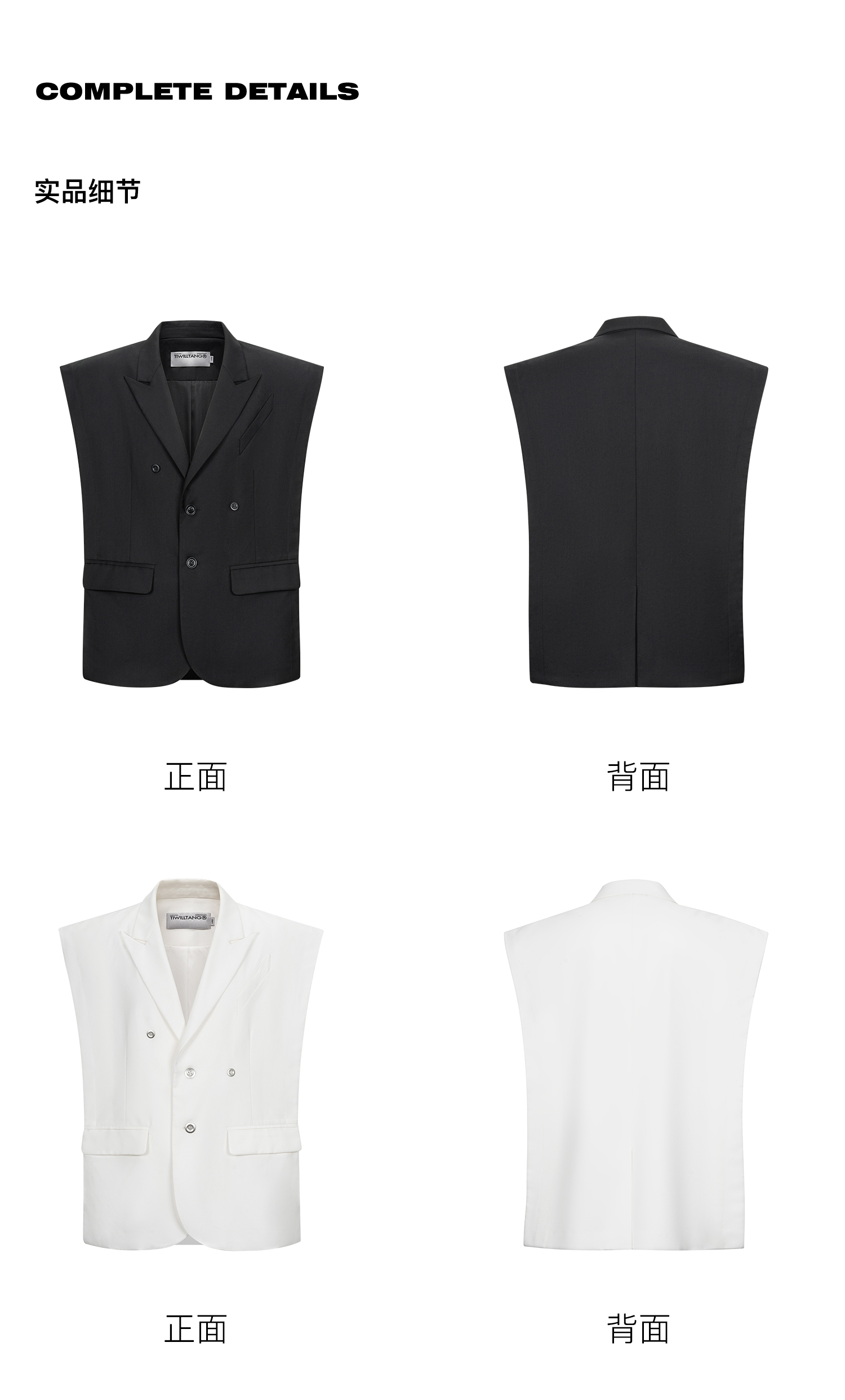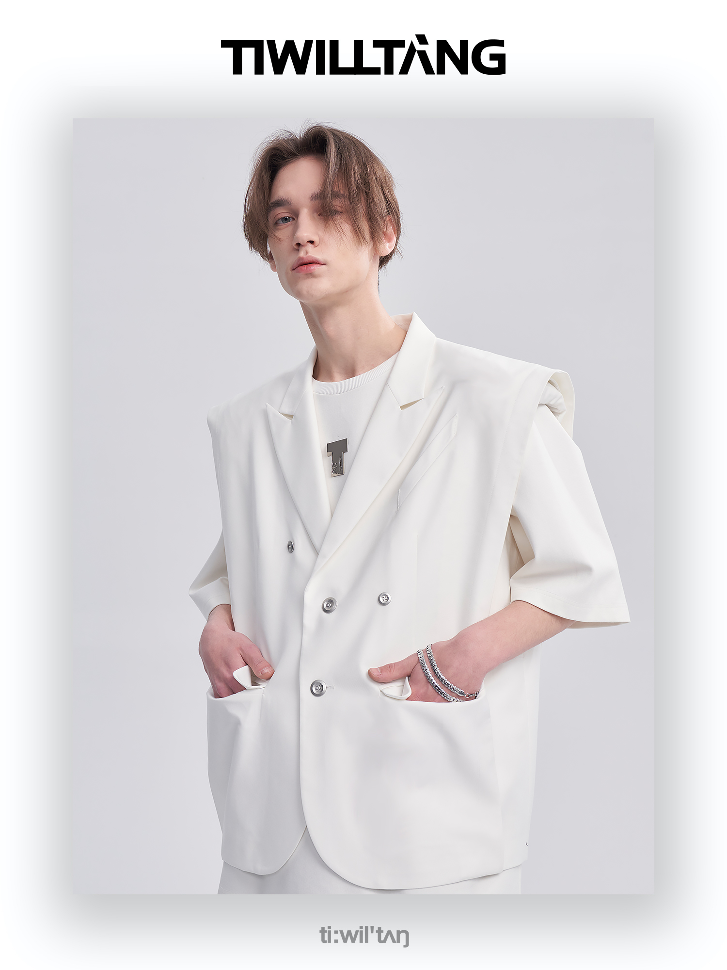 TIWILLTANG启世录“高觉”多层次门襟马甲黑白纯色无袖西装外套男