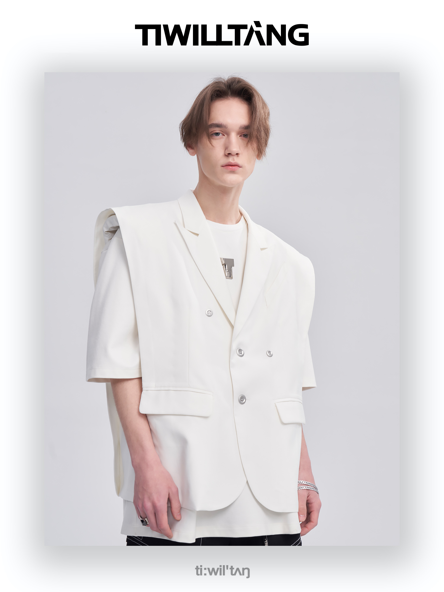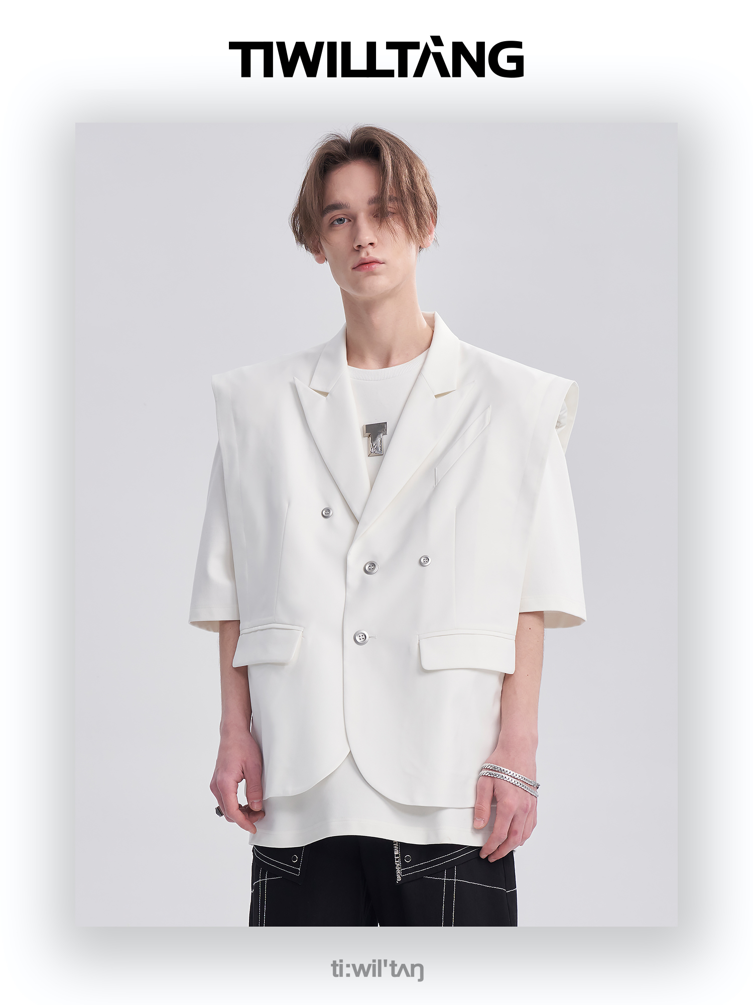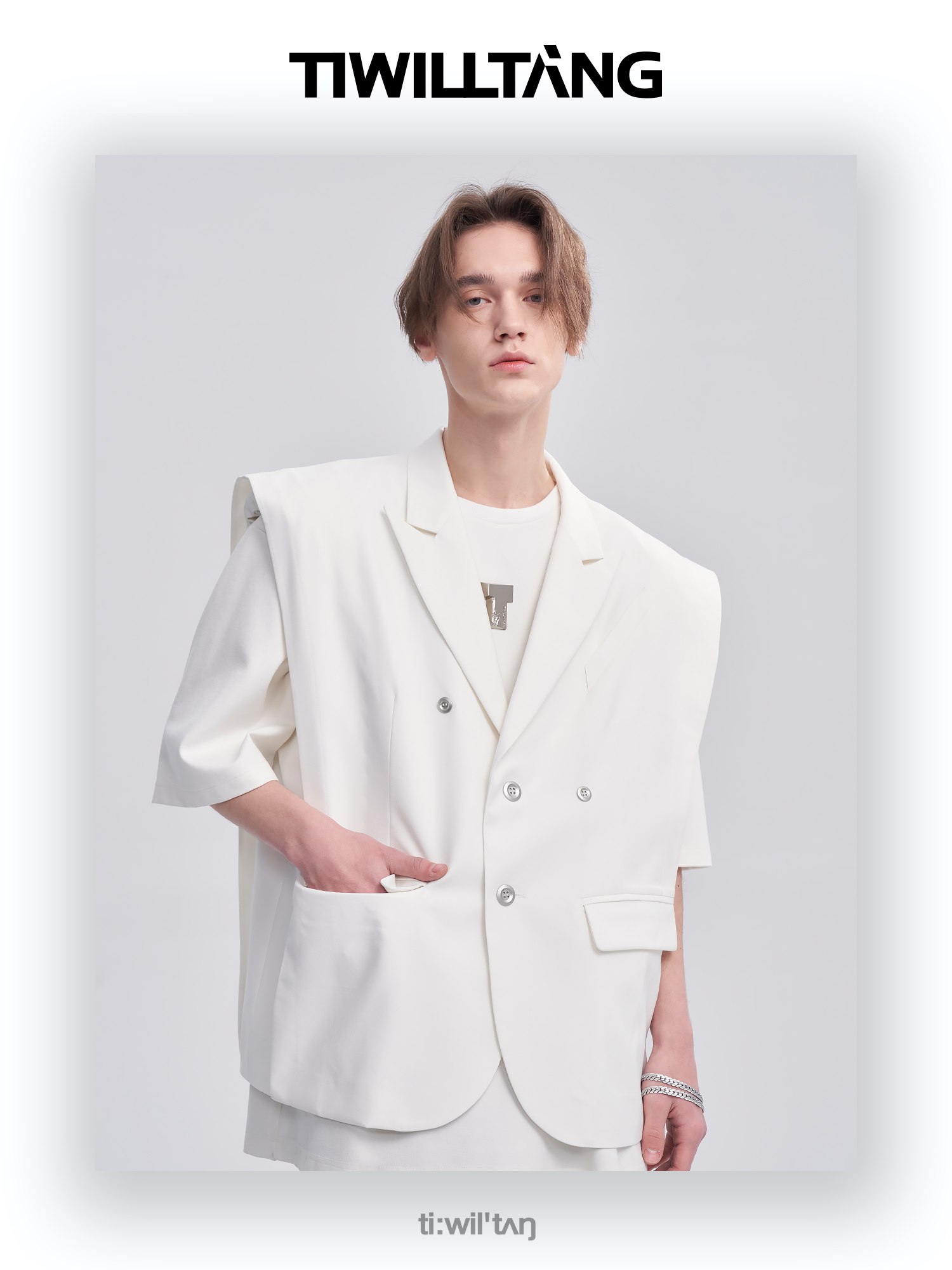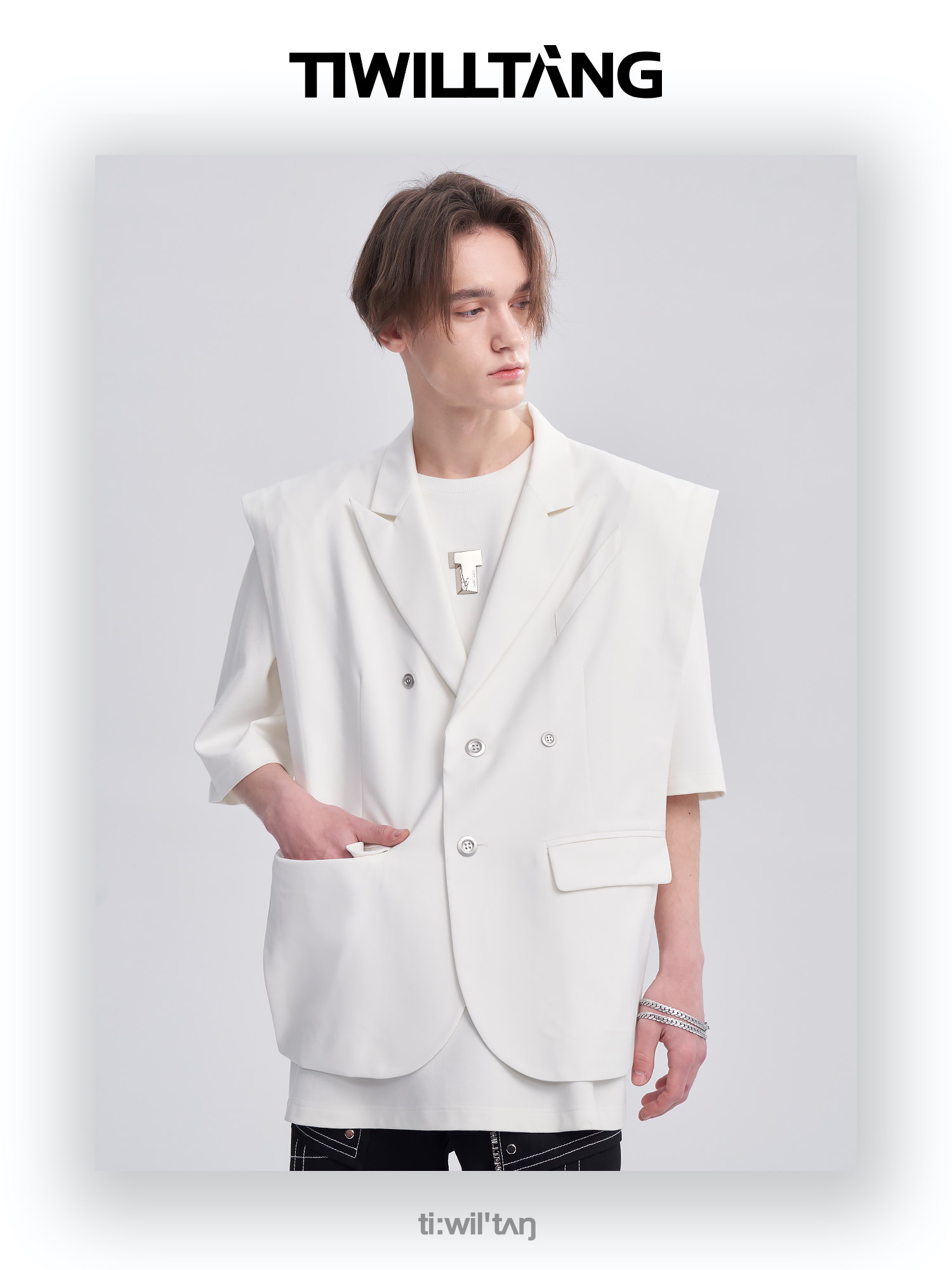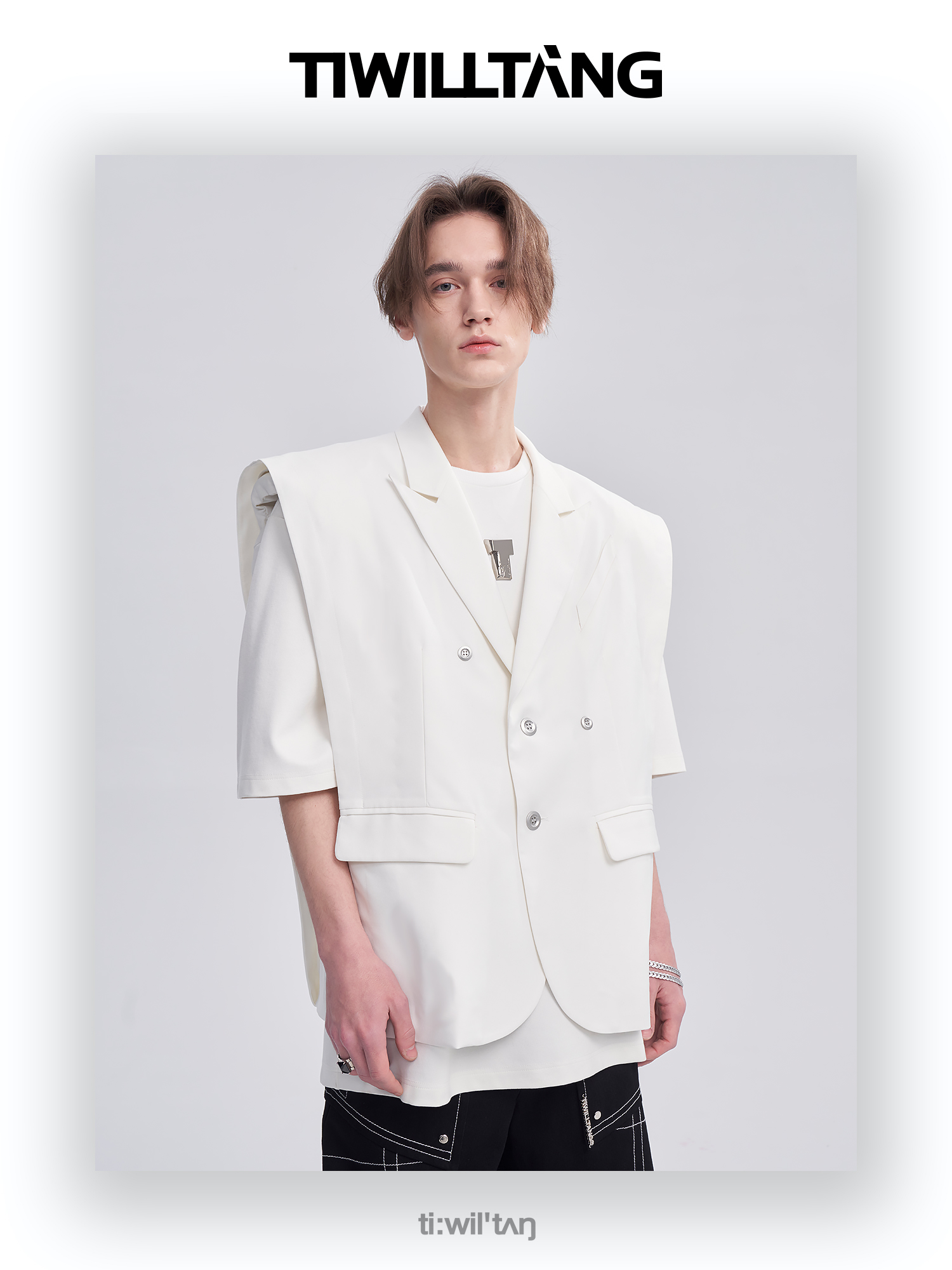 TIWILLTANG启世录“高觉”多层次门襟马甲黑白纯色无袖西装外套男
