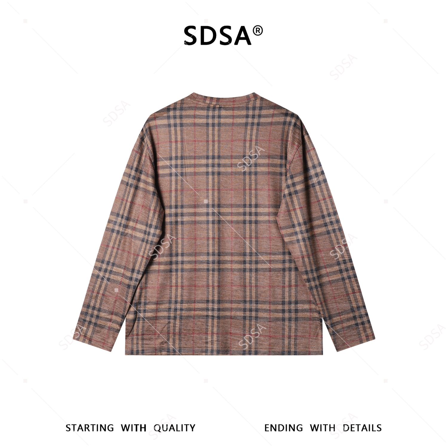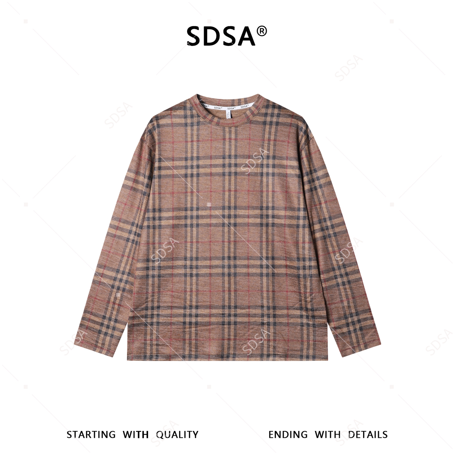 SDSA男装2026新款复古格纹圆领长袖T恤经典驼色格纹宽松休闲上衣