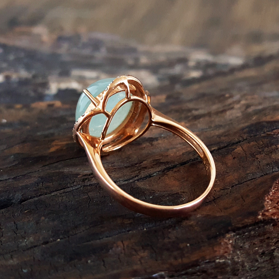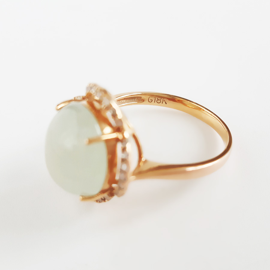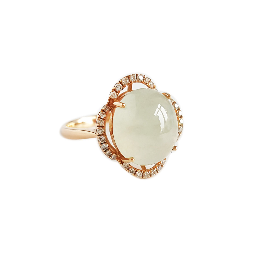 名称 | AU750玫瑰金镶钻镶天然细腻花朵造型晴水冰种蛋面翡翠戒指 |