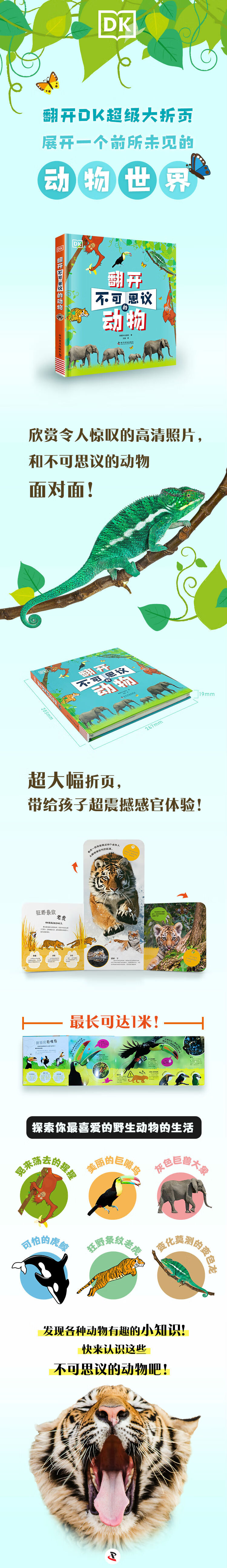 适读人群 :7-10岁 DK超级大折页《翻开不可思议的动物》是英国DK出版社既《翻开大动物》《翻开大恐龙》《翻开海洋动物》之后的又一精装立体书力作。这套“DK超级大折页”系列以精美的装帧、奇趣的超大折页、纤毫毕现的精彩图片著称,前期出版三册在市场热销,《翻开大动物》《翻开大恐龙》已重印,《翻开海洋动物》荣获“爱阅童书100”书目。本册为英国DK出版社该系列的新推出品类。走近自然世界中不可思议的珍奇动物,与奇异的生灵面对面,翻开之后的大幅折页让人惊叹,全新的精美复原图栩栩如生。