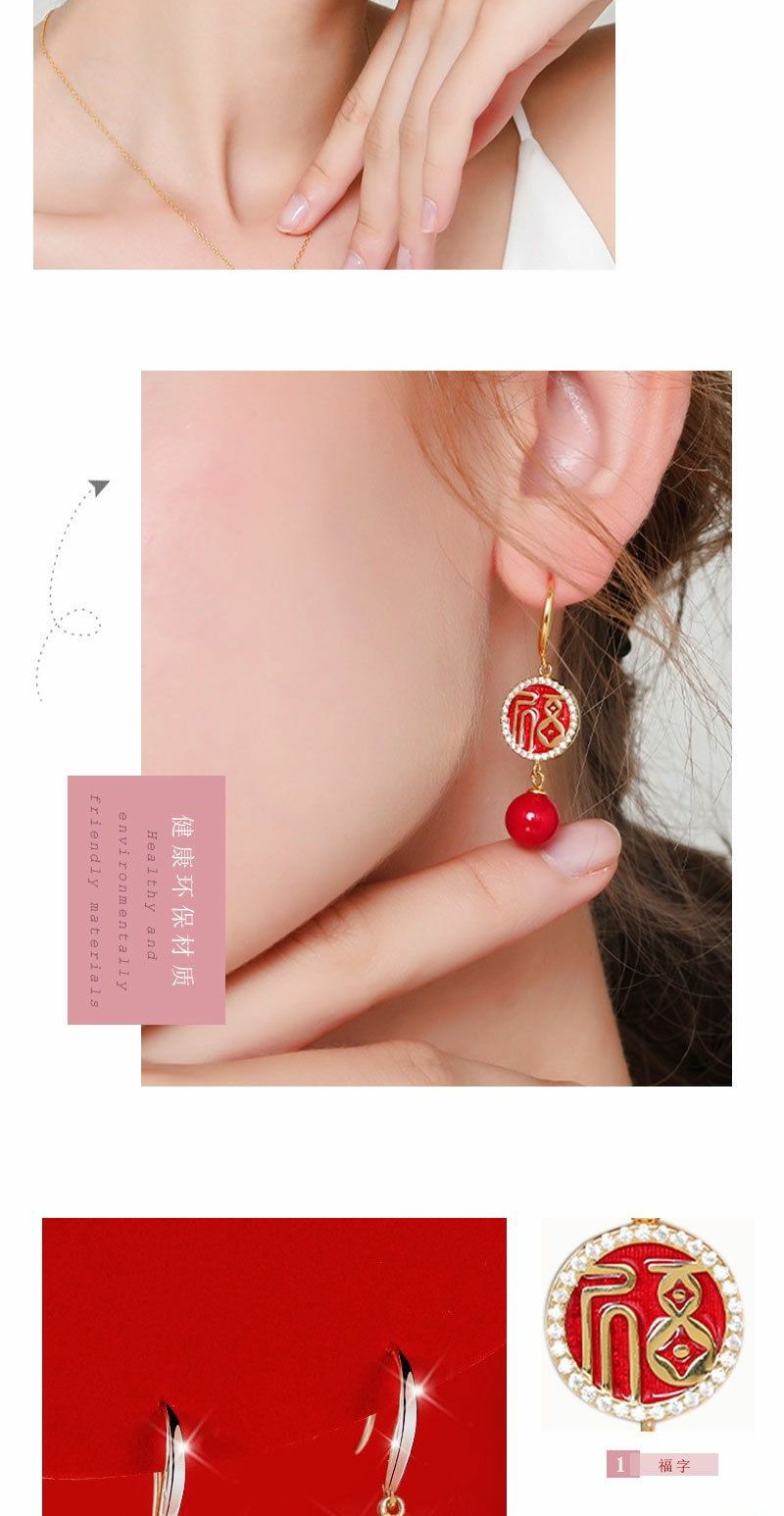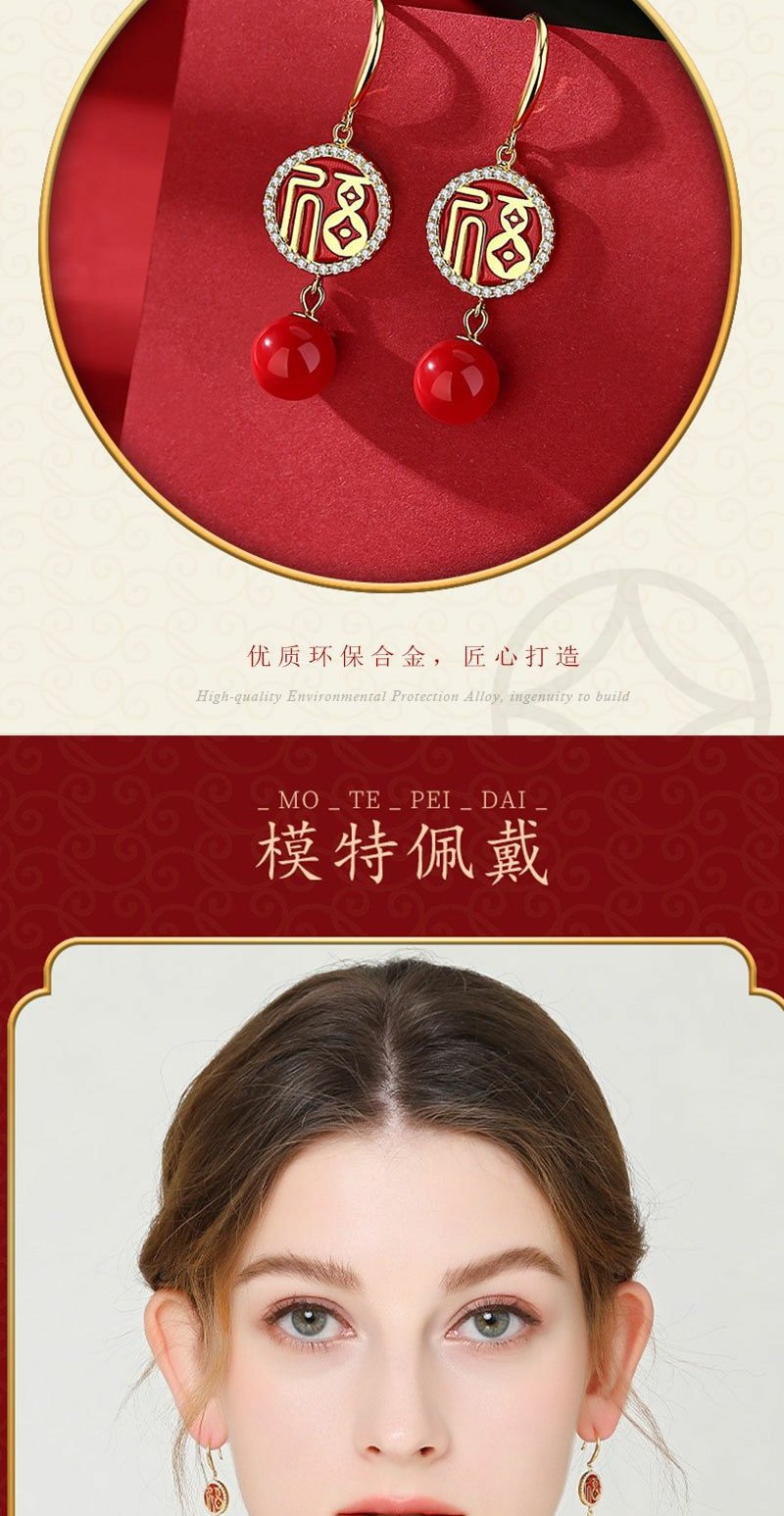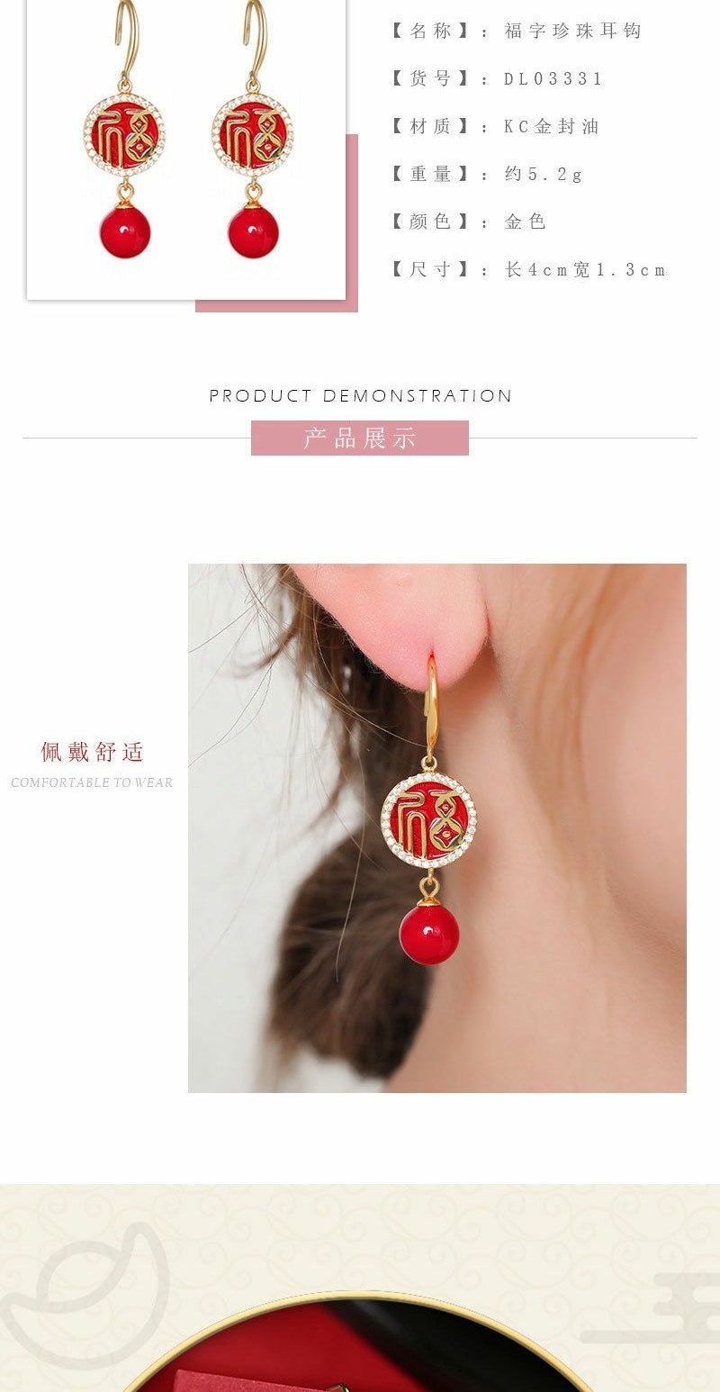 国潮银耳钩红色滴油镶钻福字耳环喜庆珍珠耳坠简约大气新年女耳饰