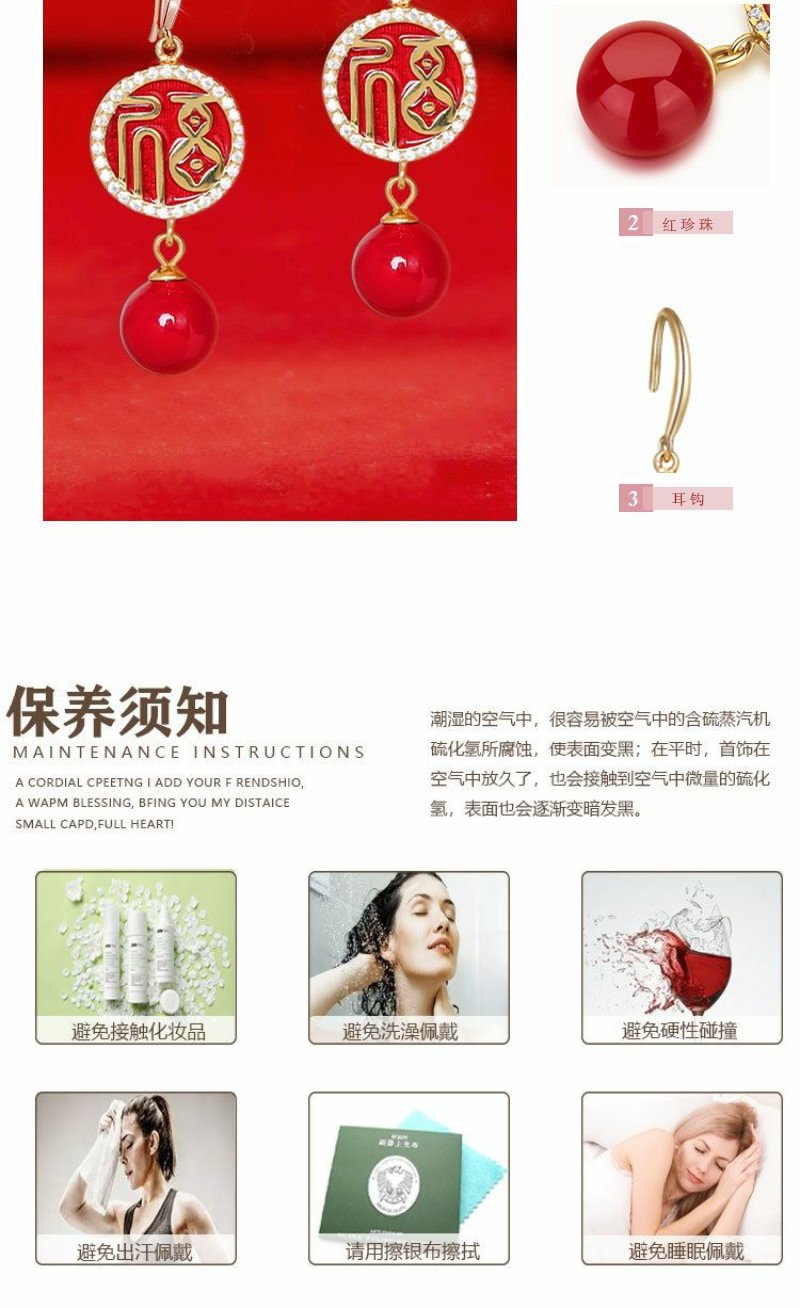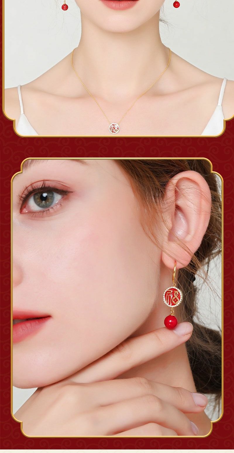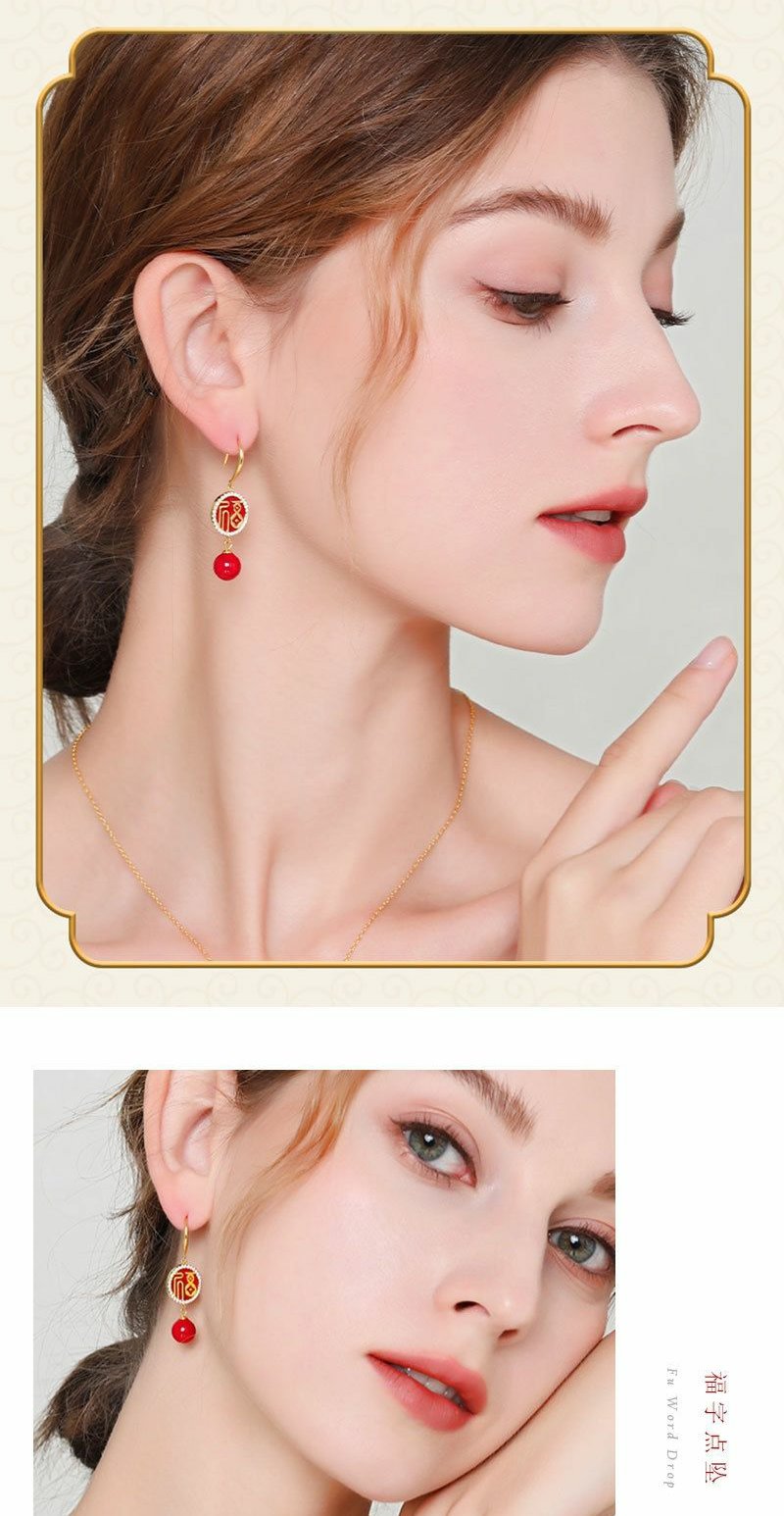国潮银耳钩红色滴油镶钻福字耳环喜庆珍珠耳坠简约大气新年女耳饰