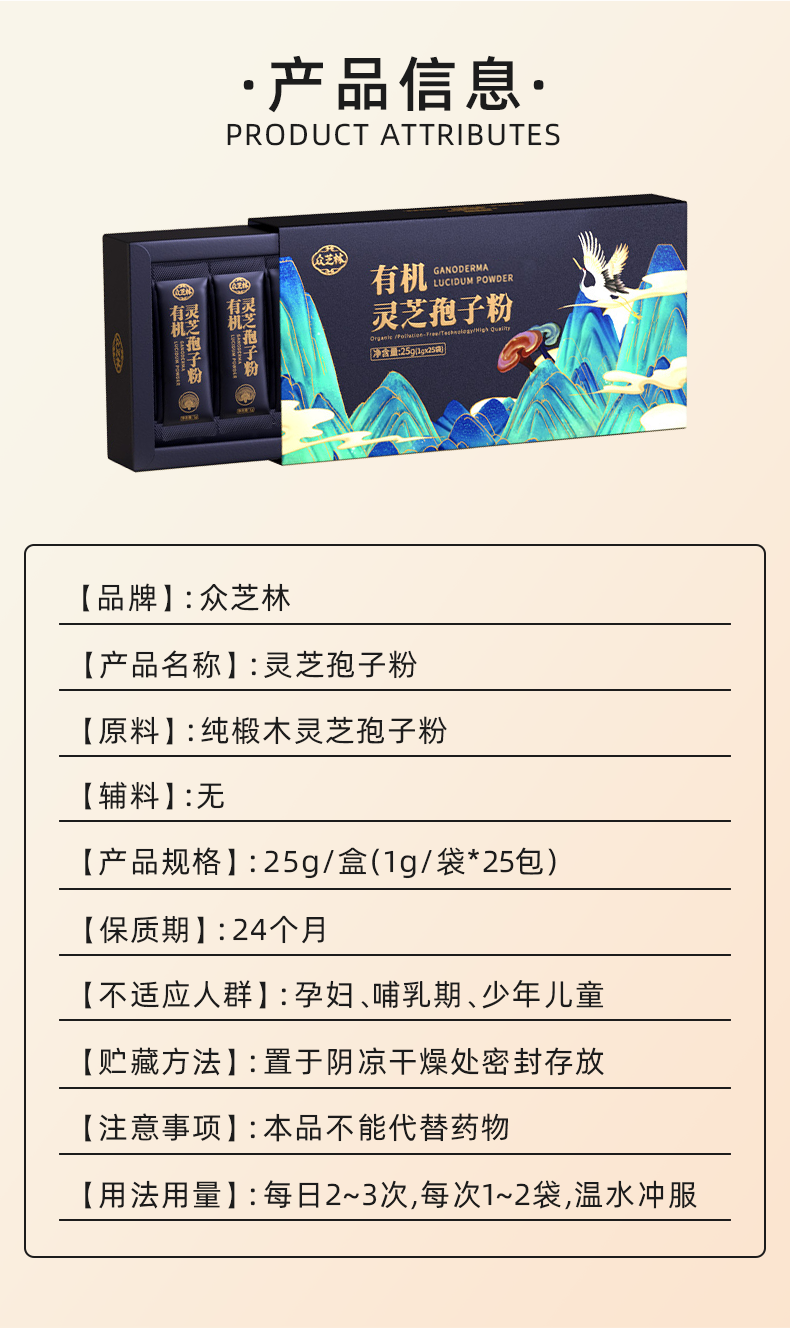 有机灵芝孢子粉众芝林营养即食冲服健康佳品1g*25条/盒