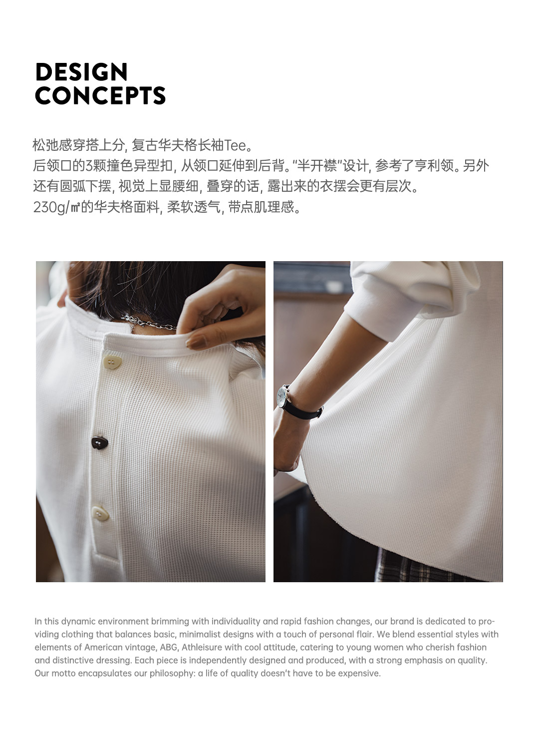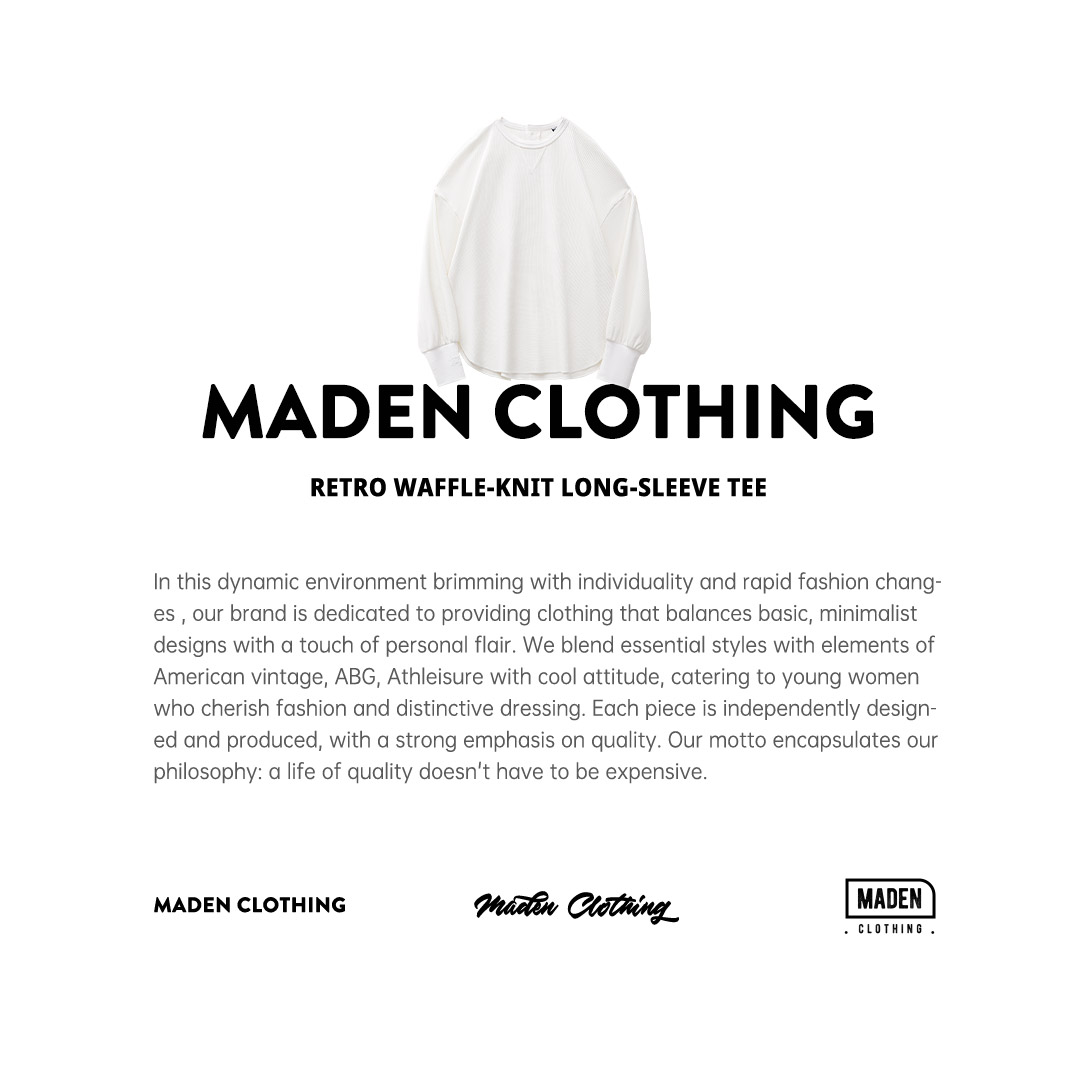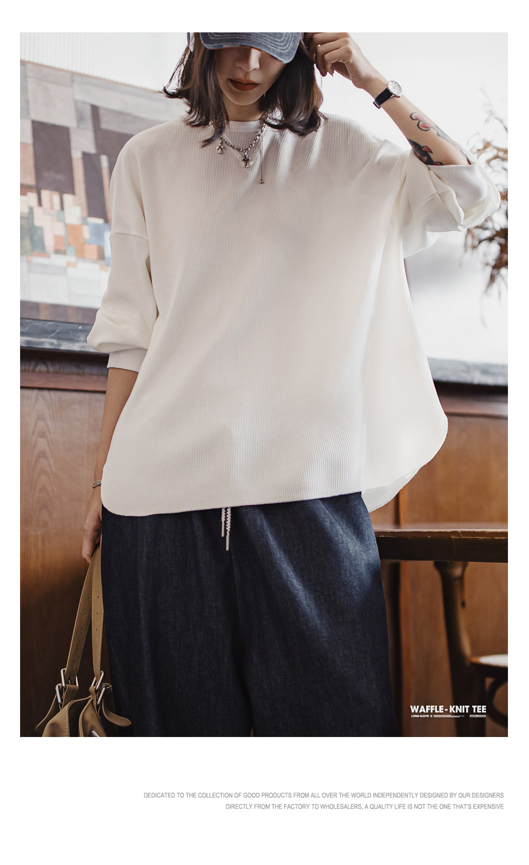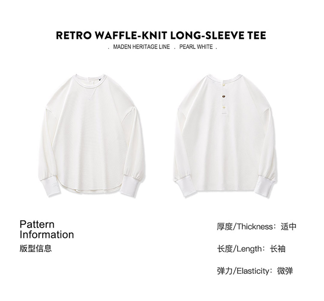 马登白色华夫格白色宽松套头卫衣圆领长袖T恤亨利衫上衣女士早秋