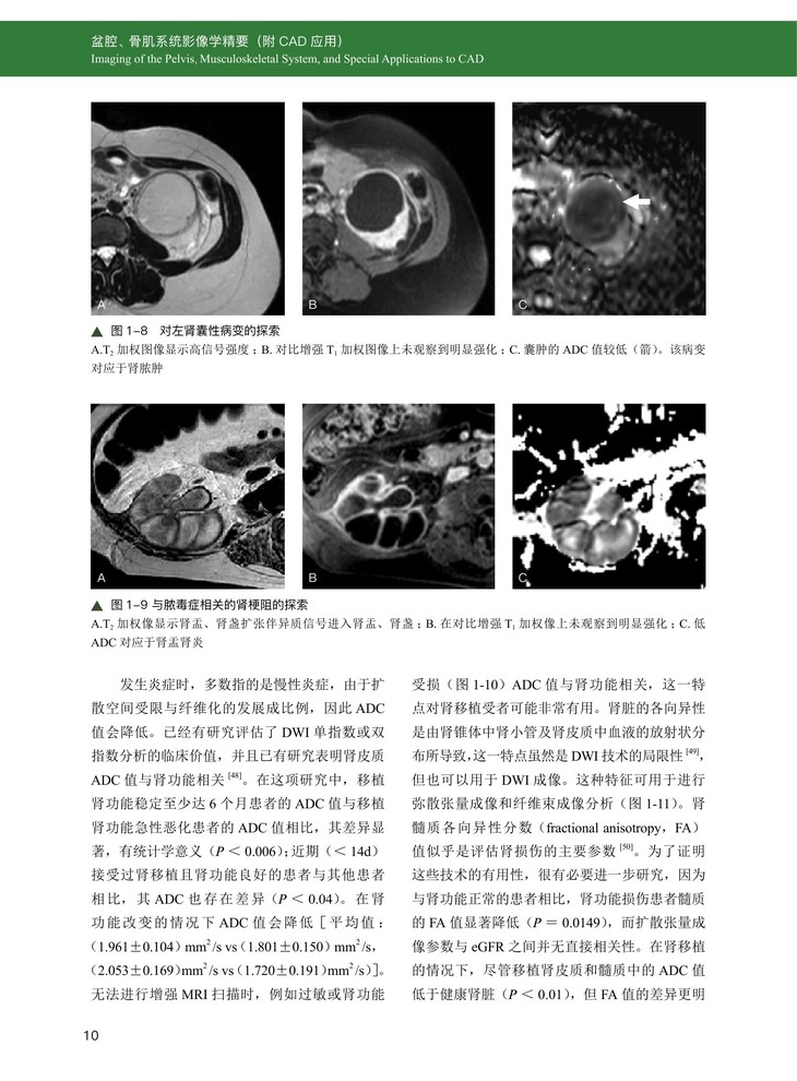 本书是引进自 CRC 出版社的一部高质量 MRI 影像学著作。相比于 CT 和 X 线成像技术,MRI是一种能够为不同软组织提供更好对比度的成像技术。原著者先对正常及病变情况的盆腔各组织器官 MRI 影像学进行了探讨,如常规的泌尿系统、男性及女性生殖系统、腹膜、盆底组织,以及妊娠期的胎儿、胎盘,还介绍了 MRI 在骨肌方面的应用。接下来又对最新磁共振成像技术在其他领域的特殊应用进行了介绍,如儿科和法医学。本书在 MRI 影像学应用方面涵盖内容丰富、细致且新颖,不仅可以帮助初学者对 MRI 影像学技术有相对全面的认识,还能让更多有一定基础的放射科医师更好地理解、应用 MRI 及其后处理技术。